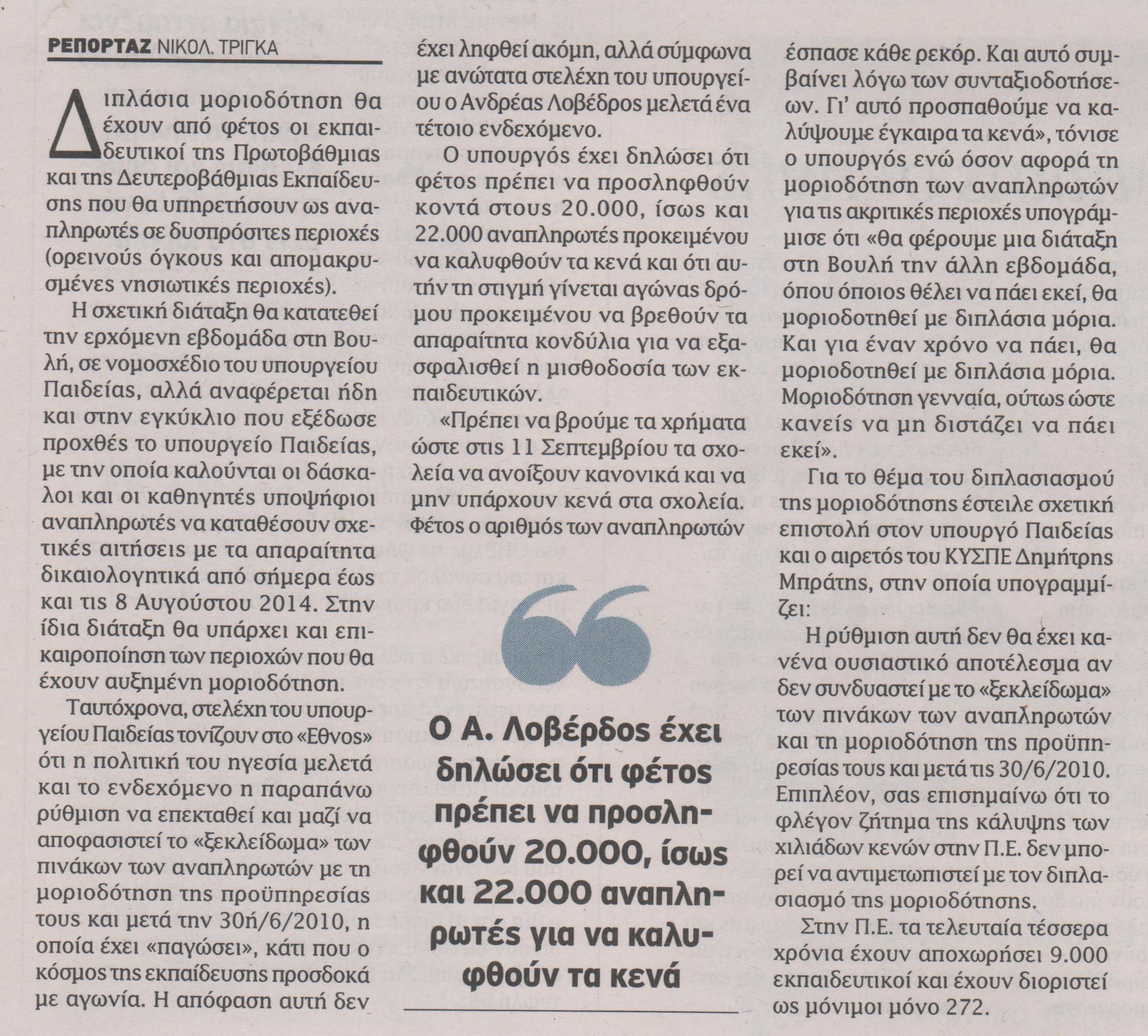 Ο υπουργός έχει δηλώσει ότι φέτος πρέπει να προσληφθούν κοντά στους 20.000 ίσως και 22.000 αναπληρωτές προκειμένου να καλυφθούν τα κενά και ότι αυτή την στιγμή γίνεται αγώνας δρόμου προκειμένου να βρεθούν τα απαραίτητα κονδύλια για να εξασφαλισθεί η μισθοδοσία των εκπαιδευτικών.