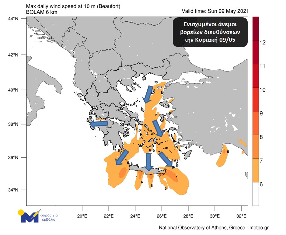 Παράλληλα, ενισχυμένοι άνεμοι βορείων διευθύνσεων αναμένεται να επικρατήσουν στα ανατολικά και νότια ηπειρωτικά και ιδιαίτερα στο Αιγαίο όπου οι εντάσεις τους θα φτάνουν τα 7 μποφόρ. Λόγω των βόρειων ανέμων μάλιστα, θα υποχωρήσουν πλήρως οι συγκεντρώσεις σκόνης στην ατμόσφαιρα. Στον προγνωστικό χάρτη που ακολουθεί, παρουσιάζονται με βέλη οι κυρίαρχες διευθύνσεις των ανέμων, ενώ οι κόκκινες αποχρώσεις και οι αναγραφόμενες τιμές αποτυπώνουν τις εκτιμώμενες μέγιστες εντάσεις των ανέμων.