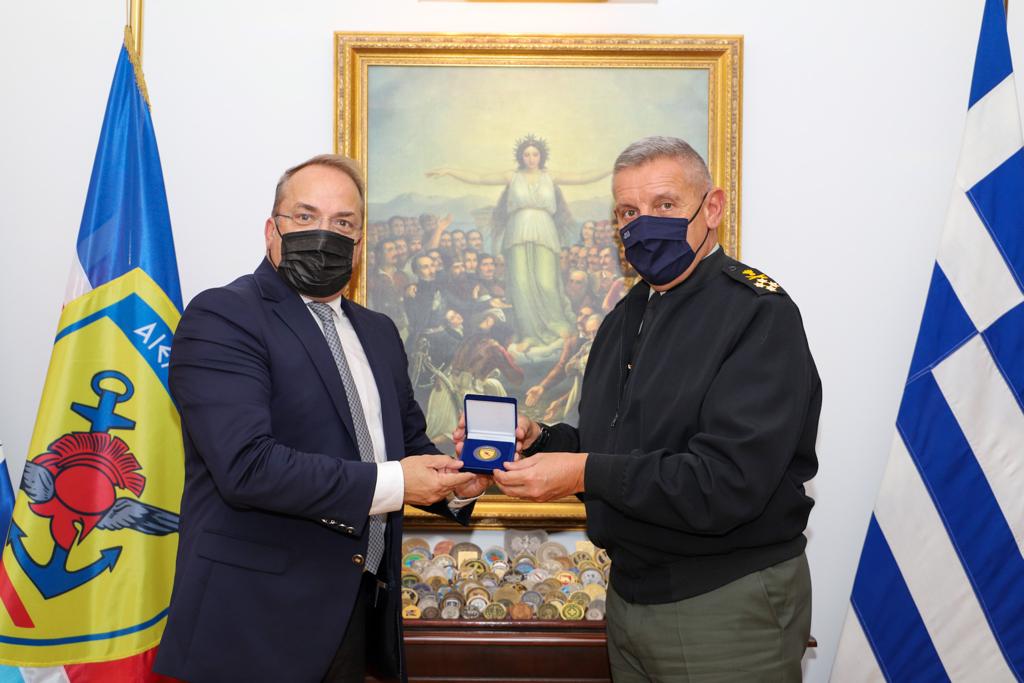 Τον υποδέχθηκε ο Αρχηγός ΓΕΕΘΑ Στρατηγός Κωνσταντίνος Φλώρος παρουσία του Αρχηγού ΓΕΣ Αντιστράτηγου Χαράλαμπου Λαλούση.