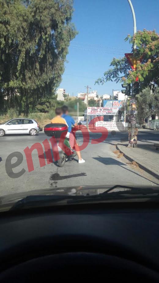 Σε νέα φωτογραφία που μας έστειλε αναγνώστης του enikos.gr, φαίνεται ένας οδηγός δικύκλου, ο οποίος έχει στο πίσω μέρος του οχήματος ένα ανήλικο αγόρι. Αξίζει να σημειωθεί πως κανείς από τους δύο αναβάτες δεν φορά κράνος.