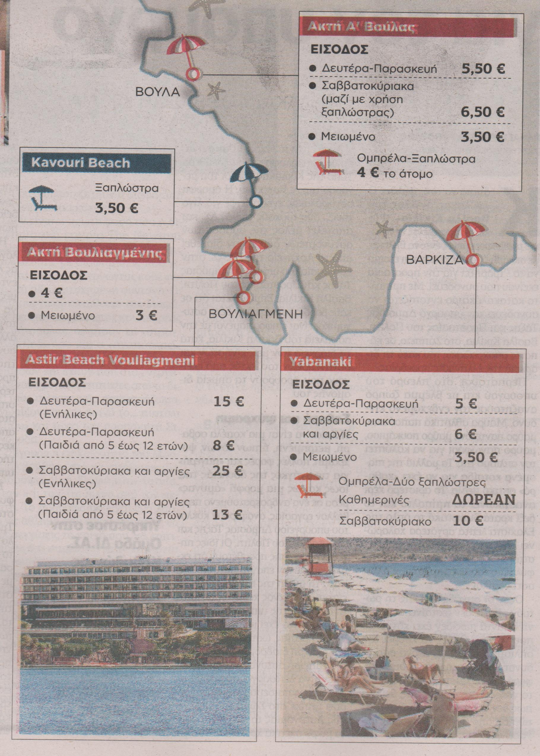 Μεταξύ 4 και 5 ευρώ κυμαίνεται κατά μέσο όρο το εισητήριο εισόδου για τις οργανωμένες παραλίες της Αττικής. Η τιμή αυτή ισχύει συνήθως για τις καθημερινές, καθώς τα Σαββατοκύριακα η “ταρίφα” ανεβαίνει στα 6-6,5 ευρώ. Πρόσβαση σε μειωμένο εισιτήριο, συνήθως στα 3,5 ευρώ έχουν τα παιδιά 7-12 ετών, οι φοιτητές και τα άτομα άνω των 65 ετών.