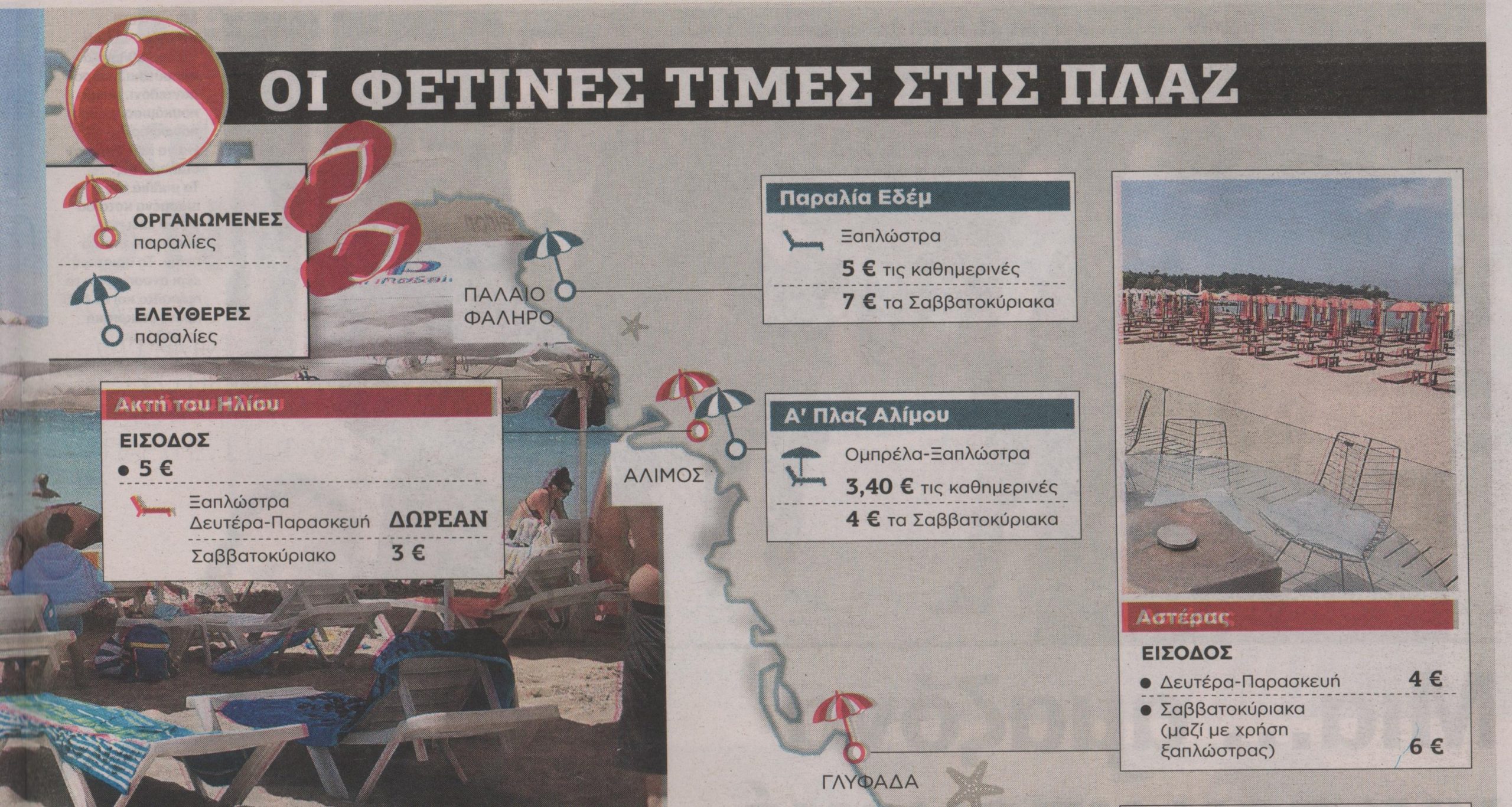 “Τσιμπημένες” είναι οι βουτιές ακόμα και στην πρωτεύουσα. Η πλούσια ακτογραμμή στην Αττική δίνει μεν πολλές επιλογές στους λουόμενους, αλλά στις περισσότερες παραλίες υπάρχει χρέωση για τις ομπρέλες και τις ξαπλώστρες.