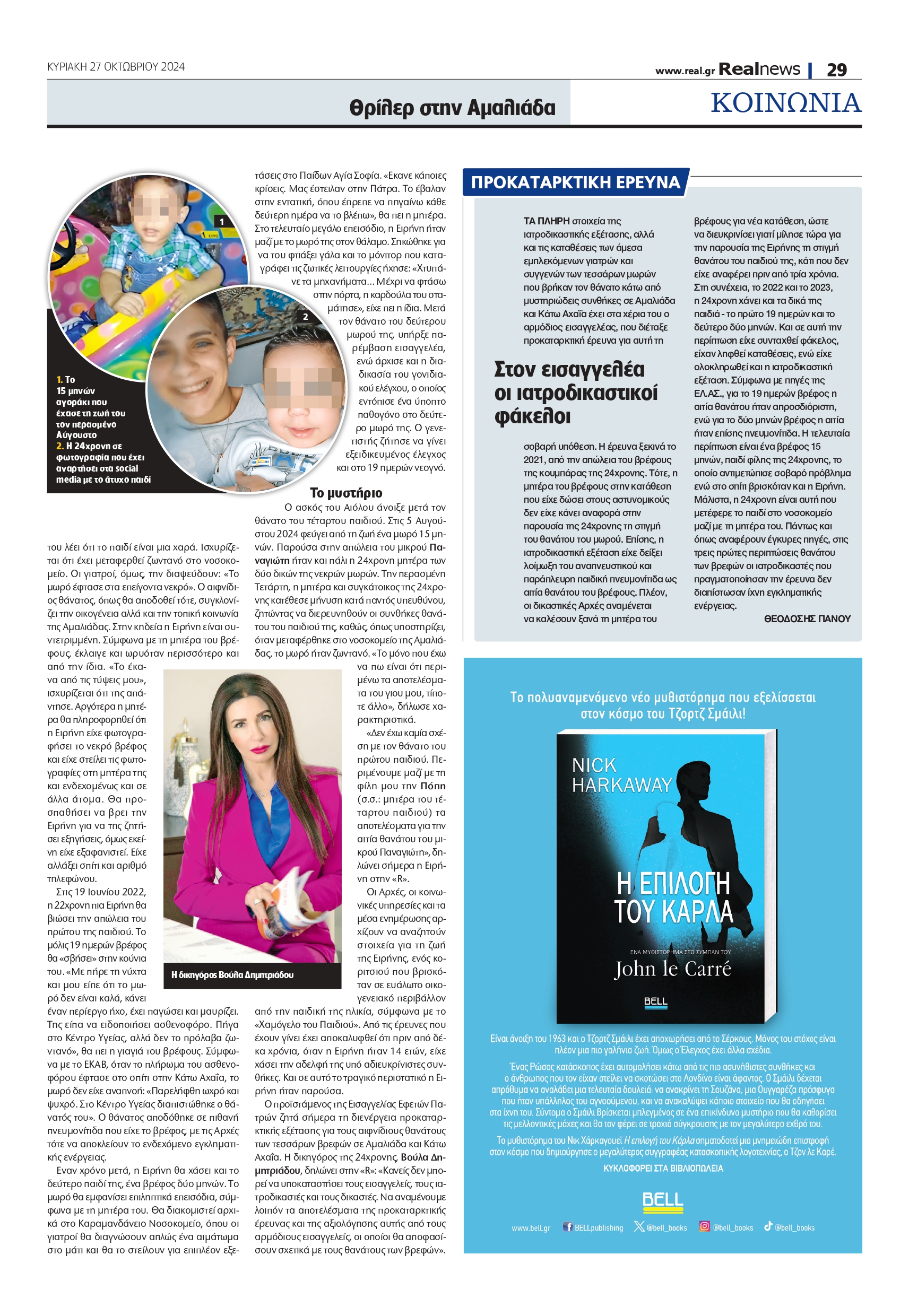 «Δεν έχω καμία σχέση με τον θάνατο του πρώτου παιδιού. Περιμένουμε μαζί με τη φίλη μου την Πόπη (σ.σ.: μητέρα του τέταρτου παιδιού) τα αποτελέσματα για την αιτία θανάτου του μικρού Παναγιώτη», δηλώνει η Ειρήνη στην «R».
