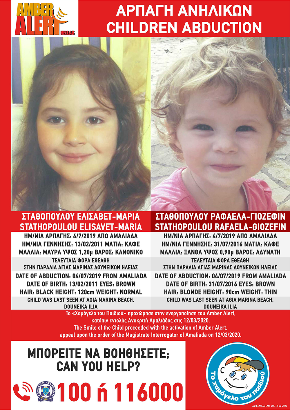Πρόκειται για τις ανήλικες αδερφές Ελισάβετ-Μαρία και Ραφαέλα-Γιοζεφίν Σταθοπούλου, 9 & 4 ετών αντίστοιχα καθώς στις 4-7-2019.