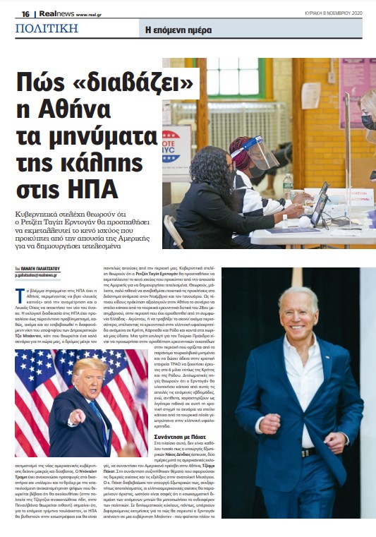 Το βλέμμα στραμμένο στις ΗΠΑ έχει η Αθήνα, περιμένοντας να βγει «λευκός καπνός» από την αναμέτρηση και ο Λευκός Οίκος να αποκτήσει τον νέο του ένοικο. Η εκλογική διαδικασία στις ΗΠΑ έχει προκαλέσει έως τώρα έντονο προβληματισμό, καθώς ακόμα και αν επιβεβαιωθεί η διαφαινόμενη νίκη του υποψήφιου των Δημοκρατικών Τζο Μπάιντεν -κάτι που θεωρείται ένα καλό σενάριο για τη χώρα μας- ο δρόμος μέχρι τον σχηματισμό της νέας αμερικανικής κυβέρνησης δείχνει μακρύς και δύσβατος. Ο Ντόναλντ Τραμπ έχει ανακοινώσει προσφυγές στα δικαστήρια και «πόλεμο» και το θρίλερ με τις επαπειλούμενες ανακαταμετρήσεις ψήφων που θεωρείται βέβαιο ότι θα ακολουθήσει (στην πολιτεία της Τζόρτζια ανακοινώθηκε ήδη, στην Πενσιλβάνια θεωρείται πιθανή) σημαίνει ότι, για το επόμενο τρίμηνο τουλάχιστον, οι ΗΠΑ θα βυθιστούν στην εσωστρέφεια και θα είναι παντελώς απούσες από την περιοχή μας.