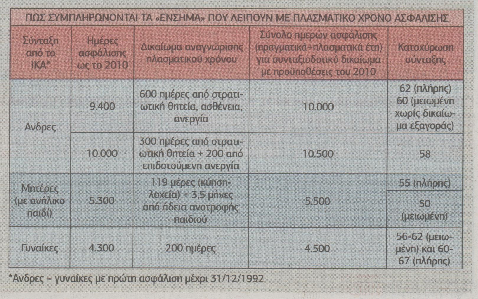 Στο Δημόσιο, μάλιστα, άνδρες και γυναίκες μπορούν να εξέλθουν στα 56-58 (μειωμένη), εφόσον συμπληρώνουν 25ετία, τα έτη 2011 και 2012, ενώ στο ΙΚΑ οι άνδρες που έχουν ασφάλιση στα βαρέα, μπορούν να χρησιμοποιήσουν την αναγνώριση πλασματικών ετών στην κοινή ασφάλιση, για να συμπληρώσουν τις χρονικές προϋποθέσεις εξόδου με 10.500 ημέρες, σε ηλικία 55 ετών (μειωμένη).