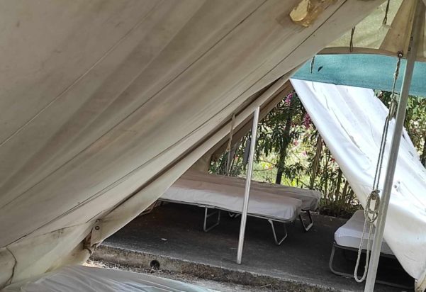 Οι σκηνές που διαμένουν παιδιά και συνοδοί είναι εντελώς ακατάλληλες. Είναι βρόμικες, σχισμένες και δεν κλείνουν με αποτέλεσμα να είναι γεμάτες έντομα και να μην υπάρχει ιδιωτικότητα. Τα ράντζα είναι σκουριασμένα και σπασμένα. Τα στρώματα που μας δόθηκαν ήταν βρώμικα και σχισμένα με αποτέλεσμα γεμίσαμε εξανθήματα. Το ίδιο ισχυεί και για τα μαξιλάρια. Τις μέρες του καύσωνα η θερμοκρασία μέσα στις σκηνές ξεπερνούσε τους 40° και ουδεμία πρόβλεψη υπήρχε για χώρους δροσιάς. Τα σκίαστρα δεν κάλυπταν ούτε τις μισές σκηνές.