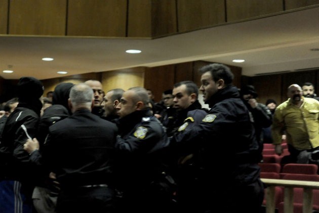 (Με το κίτρινο πουκάμισο το άτομο που αναγνωρίστηκε από τη Μάγδα Φύσσα ότι πρωτοστάτησε στα επεισόδια των χρυσαυγιτών στο Εφετείο στις 14 Φεβρουαρίου)Ωστόσο, αντί άλλης απάντησης, οι διαμαρτυρόμενοι δέχτηκαν παρατήρηση από τον αστυνομικό διευθυντή: «Περάστε έξω γιατί μας δημιουργείτε πρόβλημα».Όπως ήταν φυσικό, η αντίδραση της Μάγδας Φύσσα και του αδελφού της ήταν άμεση, ότι δεν μπορεί οι αστυνομικοί να επιτρέπουν συνεχώς την υβριστική συμπεριφορά από τους χρυσαυγίτες και να μην κάνουν τίποτα.«Την προηγούμενη φορά ο Δεβελέκος μάς έβριζε “σας γ… τα σπίτια”, σας έλεγα “σταματήστε τον” κι εσείς γυρίζατε την πλάτη», είπε χαρακτηριστικά ο αδελφός της Μάγδας Φύσσα προς τον αστυνομικό διευθυντή, για να δεχτεί την παρατήρηση «μη λέτε τέτοιες εκφράσεις σε δικαστήριο».Η οικογένεια Φύσσα ανέφερε στους δημοσιογράφους ότι η συμπεριφορά της αστυνομίας, ειδικά στην αίθουσα του Εφετείου, είναι ιδιαίτερα ανεκτική απέναντι στους χρυσαυγίτες, επιτρέποντας την υβριστική συμπεριφορά. «Δεν πίστευα ότι θα άφηναν να ακουστεί το σύνθημα “Αίμα, Τιμή, Χρυσή Αυγή” σε αυτό το δικαστήριο, τι άλλο να πω…», είπε η Μάγδα Φύσσα.Πηγή: efsyn.gr