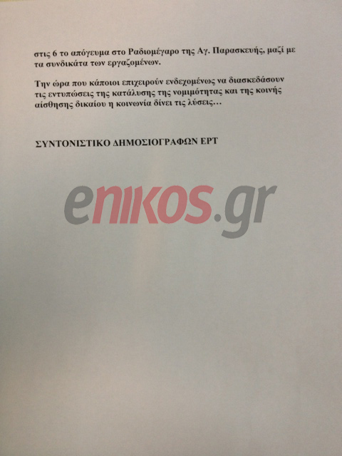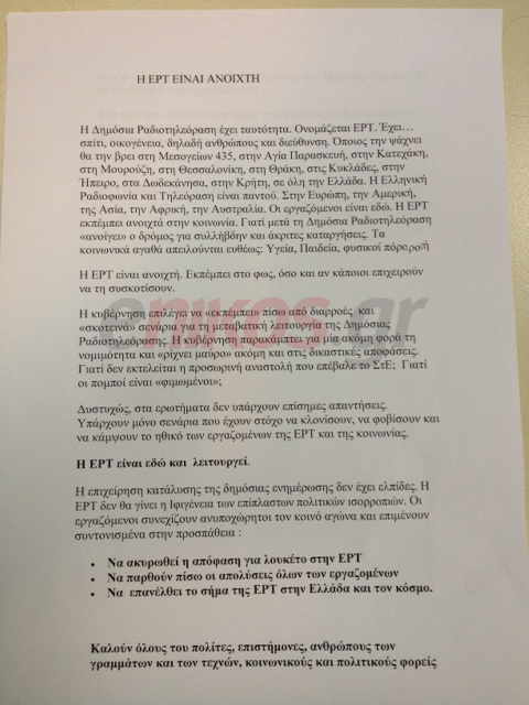 Ανακοίνωση δημοσιογράφων της ΕΡΤ Enikos Newsroom 14:15, Τετάρτη 19 Ιουνίου 2013 κοινωνία Ανακοίνωση δημοσιογράφων της ΕΡΤ Ανακοίνωση εξέδωσαν, πριν από λίγο, οι δημοσιογράφοι της ΕΡΤ ΑΝΑΚΟΙΝΩΣΗ ΕΡΓΑΖΟΜΕΝΟΙ ΕΡΤ ΚΛΕΙΣΙΜΟ ΚΥΒΕΡΝΗΣΗ Μοιράσου το: σχολίασε κι εσύ (0 σχόλια) Ακολουθήστε το enikos.gr στο Google News και μάθετε πρώτοι όλες τις ειδήσεις Δείτε όλες τις τελευταίες ειδήσεις από την Ελλάδα και τον Κόσμο στο enikos.gr Ειδήσεις Ροή Ειδήσεων 7 ώρες πριν Η κοινή διακήρυξη Ελλάδας – Κύπρου – Ισραήλ: Ενίσχυση αμυντικής συνεργασίας, δέσμευση για τον Great Sea Inteconnector – Τα μηνύματα της τριμερούς Συνόδου 7 ώρες πριν Αγρότες: Bάζουν στην άκρη τα τρακτέρ ενόψει Χριστουγέννων, θέμα ασφαλείας εγείρει η αστυνομία – Οι αναδιατάξεις που θα γίνουν από την Τρίτη 7 ώρες πριν Νεκρός ο άνδρας που έπεσε στις ράγες του Ηλεκτρικού στα Κάτω Πατήσια 9 ώρες πριν Αλεξανδρούπολη: Μήνυση υπέβαλε ο παππούς του 3χρονου που πέθανε από ασιτία – Αναζητούνται οι δράστες που τον ξυλοκόπησαν 5 ώρες πριν Ολλανδία: Αυτοκίνητο έπεσε σε πλήθος στην πόλη Νούνσπετ – Τουλάχιστον εννέα τραυματίες – ΦΩΤΟ και ΒΙΝΤΕΟ 6 ώρες πριν Το «μαγικό» υλικό της Αρχαιότητας βρίσκεται ακόμα ανάμεσά μας – Η επιστήμη έλυσε το μυστήριο 8 ώρες πριν Αριθμολογία: Η λέξη που σας χαρακτηρίζει, με βάση την ημερομηνία γέννησής σας – «Είναι η αύρα που εκπέμπετε πριν καν μιλήσετε» 7 ώρες πριν Ύπνος: Γιατρός μοιράζεται τα σημάδια που δείχνουν ότι μπορεί να πάσχετε από «ορμονική αϋπνία» 3 ημέρες πριν Enerwave: Το νέο «ρεύμα» στη λιανική ενέργειας που αλλάζει την εμπειρία του καταναλωτή 9 λεπτά πριν Εφημερεύοντα φαρμακεία σε Αθήνα και Θεσσαλονίκη (23/12) 21 λεπτά πριν Καμίλ Ιντρίς: Ο πρωθυπουργός του Σουδάν καλεί τον ΟΗΕ να «σταθεί στη σωστή πλευρά της ιστορίας» 41 λεπτά πριν Νέο γκράφιτι του Banksy εμφανίστηκε στο Λονδίνο – Δύο παιδιά ξαπλωμένα κοιτούν τον ουρανό 1 ώρα πριν ΗΠΑ: Δικαστής διέταξε την επιστροφή 137 μεταναστών από τη Βενεζουέλα που απελάθηκαν στο Ελ Σαλβαδόρ 1 ώρα πριν Δημήτρης Σκαρμούτσος: «Κέρδισα τον κόσμο επειδή μίλησα για τις εμπειρίες μου με τα ναρκωτικά και το αλκοόλ – Όλοι έλεγαν ότι θα καταστραφώ» ENIKOS NETWORK Στέλνετε ακόμα Χριστουγεννιάτικες κάρτες; Τι μπορεί να δείχνει για την προσωπικότητά σας Ενεργειακή αναβάθμιση του νοσοκομείου Πατρών «Ο Άγιος Ανδρέας» ΔΕΔΔΗΕ: Τάσεις αποκλιμάκωσης των ρευματοκλοπών αλλά παραμένουν σε υψηλά επίπεδα – Τι δείχνουν τα τελευταία στοιχεία ΥΠΑΑΤ – Ελληνική Αναπτυξιακή Τράπεζα: Συμφωνία για 3 νέα χρηματοδοτικά εργαλεία με μόχλευση πόρων 365 εκατ. ευρώ Ο Google Assistant θα παραμείνει λίγο περισσότερο για ορισμένους χρήστες Android Τεστ προσωπικότητας: Το βάζο που θα επιλέξετε αποκαλύπτει πώς λύνετε προβλήματα στη ζωή σας περισσότερα 23:18 , Δευτέρα 22 Δεκεμβρίου 2025 Επεισόδιο ξυλοδαρμού με ρόπαλα στην Πάτρα – Συνελήφθη 40χρονος Ένα σοβαρό επεισόδιο ξυλοδαρμού απασχολεί τις τελευταίες ώρες, τις αστυνομικές Αρχές της Πάτρ... 22:46 , Δευτέρα 22 Δεκεμβρίου 2025 Αγρότες: Bάζουν στην άκρη τα τρακτέρ ενόψει Χριστουγέννων, θέμα ασφαλείας εγείρει η αστυνομία – Οι αναδιατάξεις που θα γίνουν από την Τρίτη Σε «Γολγοθά» αναμένεται να εξελιχθούν για τους εκδρομείς των Χριστουγέννων οι μετακινήσεις στι... 22:39 , Δευτέρα 22 Δεκεμβρίου 2025 Λαϊκές αγορές: Πώς θα λειτουργήσουν τις ημέρες των γιορτών «Όπως κάθε χρόνο, έτσι και φέτος τα Χριστούγεννα, οι λαϊκές αγορές θα βρίσκονται κοντά στους κ... 22:23 , Δευτέρα 22 Δεκεμβρίου 2025 Νεκρός ο άν