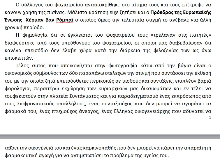 Με ανακοίνωση απαντά η ομοσπονδία Σωφρονιστικών Υπαλλήλων Ελλάδας, στην αναδημοσίευση της φωτογραφίας της πισίνας στο Ψυχιατρείο Κρατουμένων Κορυδαλλού. Το δελτίο Τύπου μεταξύ άλλων αναφέρει ότι «οι εκπρόσωποι της τρόικα που προσφάτως επισκέφτηκαν ξανά την χώρα μας, δηλαδή ο πρόεδρος της Ευρωπαϊκής Επιτροπής Ζοζέ Μανουέλ Μπαρόζο και ο εκπρόσωπος του ΔΝΤ Πολ Τόμσεν βλέποντας τα δημοσιεύματα για resort και SPA, δεν μπόρεσαν να βρουν δωμάτιο σε αυθεντικό resort ξενοδοχειακό συγκρότημα και έτσι απευθύνθηκαν στον πρωτοβάθμιο σύλλογό μας του ΨΚΚ και ζήτησαν να τους φιλοξενήσουμε για ένα τριήμερο» και καταλήγει ότι οι μόνοι υπεύθυνοι για τα «προβλήματα της χώρας δεν ευθύνεται κανείς άλλος, ούτε βέβαια οι ευεργέτες και οσιομάρτυρες της τρόικα και του ΔΝΤ και αναλαμβάνουν την απόλυτη ευθύνη για την κατάντια της χώρας!» Διαβάστε το πρωτότυπο δελτίο Τύπου: