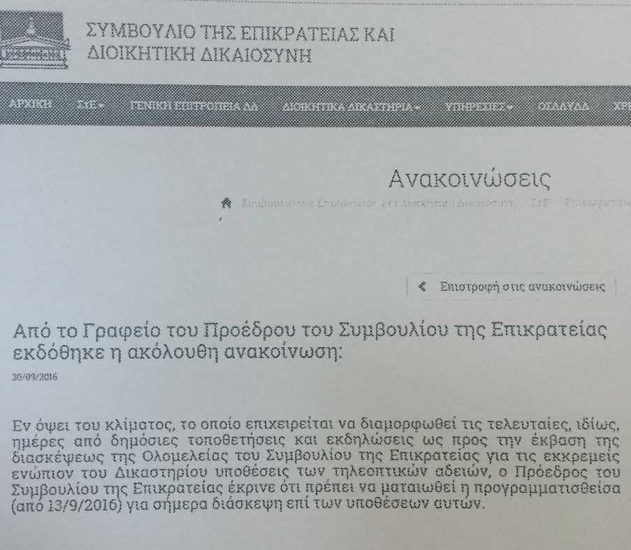 «Ενόψει του κλίματος, το οποίο επιχειρείται να διαμορφωθεί τις τελευταίες, ιδίως ημέρες από δημόσιες τοποθετήσεις και εκδηλώσεις ως προς την έκβαση της διασκέψεως της Ολομελείας του Συμβουλίου της Επικρατείας για τις εκκρεμείς ενώπιον του Δικαστηρίου υποθέσεις των τηλεοπτικών αδειών, ο Πρόεδρος του Συμβουλίου της Επικρατείας έκρινε ότι πρέπει να ματαιωθεί η προγραμματισθείσα από 13-9-2016 για σήμερα διάσκεψη επί των υποθέσεων αυτών».