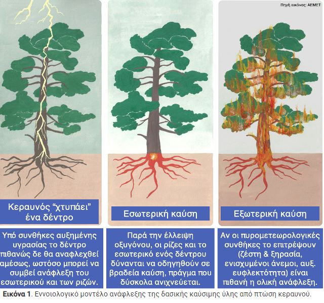 Η Εικόνα 1 παρουσιάζει απλουστευμένα ένα εννοιολογικό μοντέλο περιγραφής της διεργασίας ανάφλεξης της δασικής καύσιμης ύλης από πτώση κεραυνού. Εάν υποθέσουμε ότι ένας κεραυνός «χτυπά» ένα δέντρο, το ηλεκτρικό του φορτίο διαπερνά τον πυρήνα του δέντρου και φτάνει μέχρι τις ρίζες του. Εάν η περιεχόμενη υγρασία του δέντρου είναι υψηλή, δε θα συμβεί αμέσως ανάφλεξη. Παρόλα αυτά, το κατώτερο τμήμα του δέντρου και οι ρίζες του μπορούν να αναφλεχθούν και να συντηρήσουν καύση, ακόμα και χωρίς την παρουσία άφθονου οξυγόνου. Η «εσωτερική» αυτή καύση είναι ασθενής και εξελίσσεται με αργό ρυθμό, ενώ δεν είναι εύκολα ανιχνεύσιμη δίχως τη χρήση εξειδικευμένων θερμικών καμερών ή άλλων, αντίστοιχων τεχνικών τηλεπισκόπισης. Σε περίπτωση που οι πυρομετεωρολογικές συνθήκες είναι ευνοϊκές, η καύση στο εσωτερικό και τις ρίζες του δέντρου μπορεί να επεκταθεί στο εξωτερικό, οδηγώντας τελικά στην έναρξη μίας δασικής πυρκαγιάς.