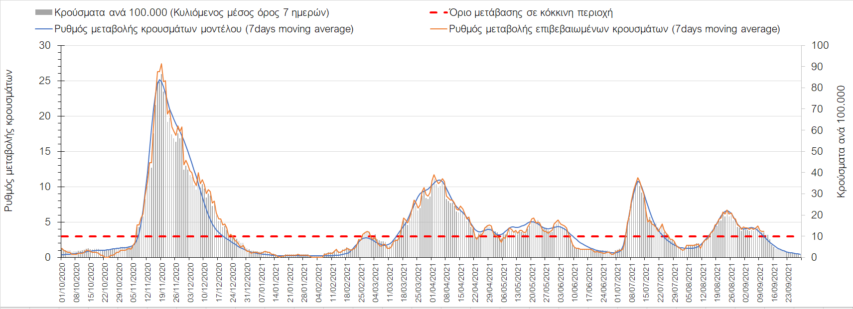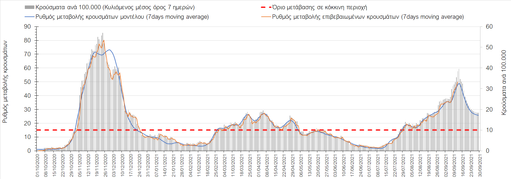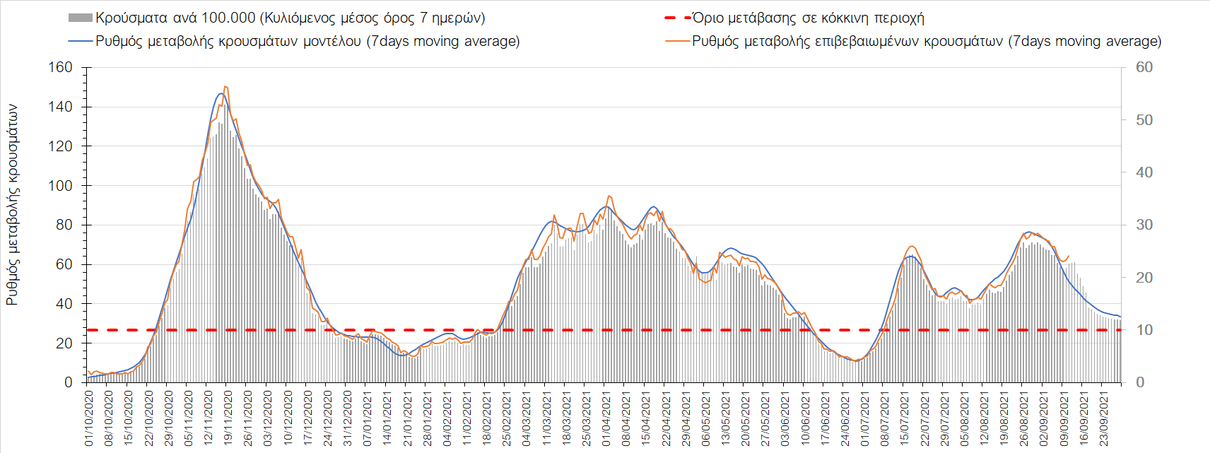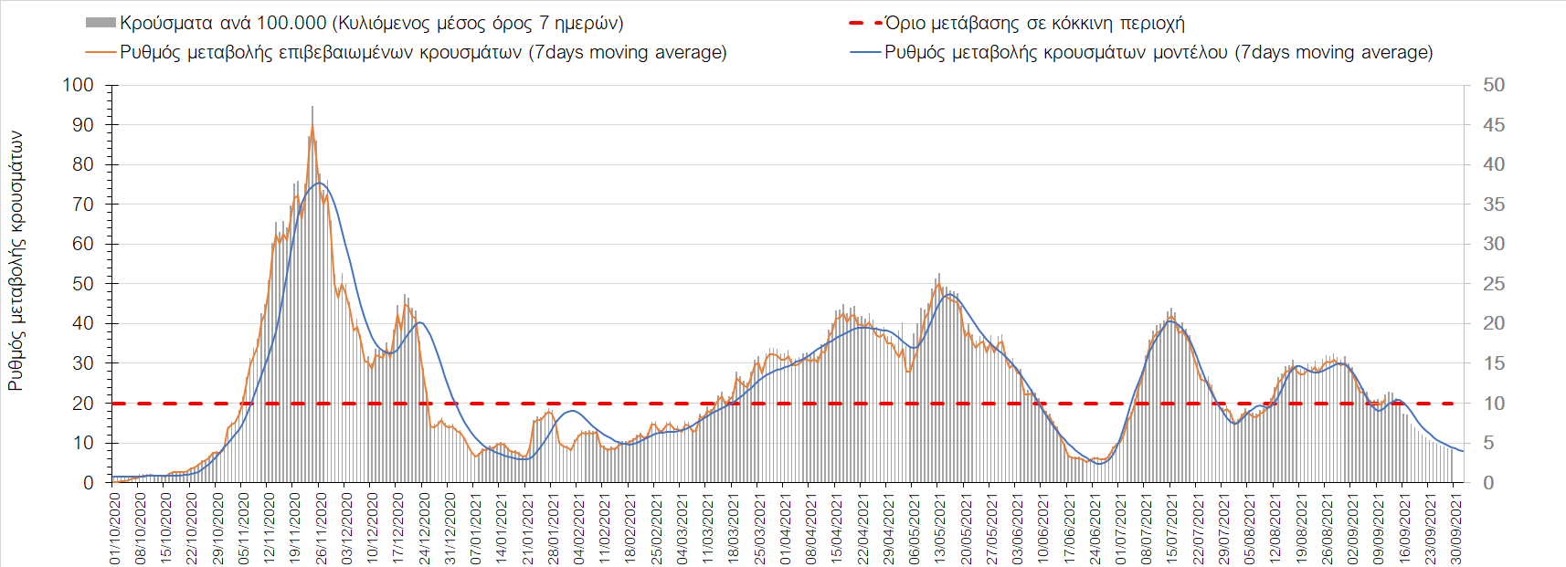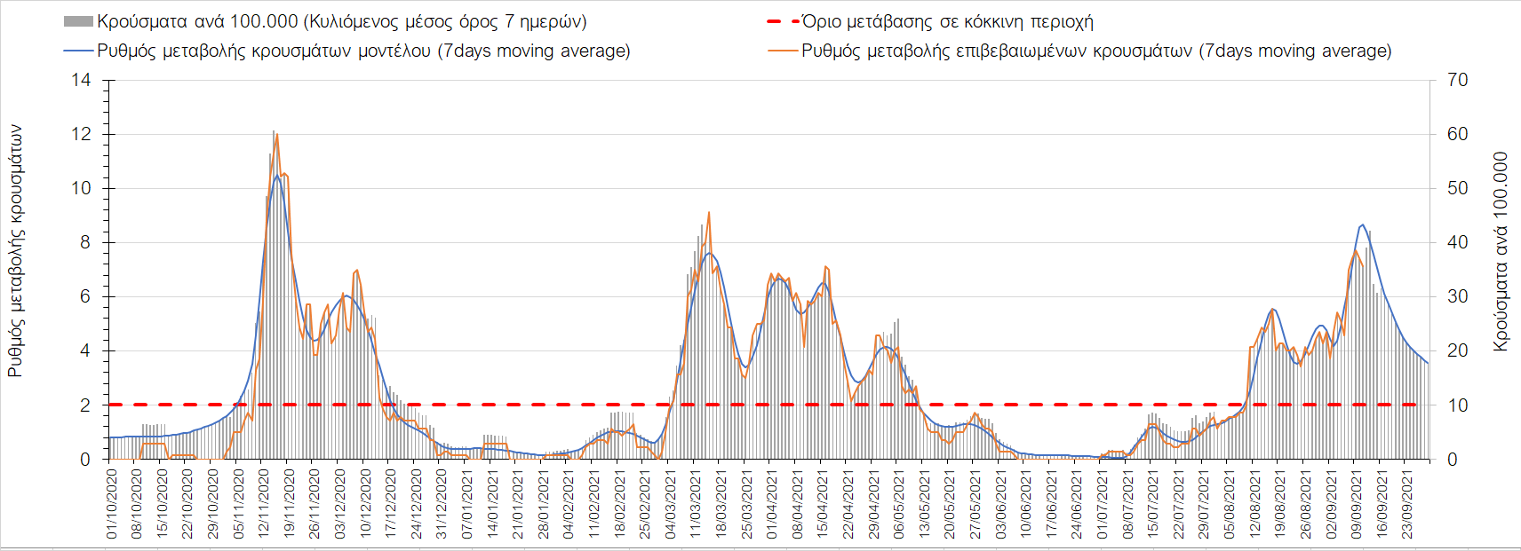 Αναμένουμε τις επόμενες ημέρες για να δούμε τις επιπτώσεις της επιστροφής του κύματος εξόδου του Αυγούστου, σε συνδυασμό με το άνοιγμα των σχολείων στην πορεία της πανδημίας. Αξίζει επίσης να σημειωθεί ότι οι υψηλές θερμοκρασίες των προηγουμένων ημερών, συντέλεσαν στη μείωση της μεταδοτικότητας και συνέβαλλαν στη συγκράτηση του αριθμού των κρουσμάτων, αλλά ήδη αρχίζει να διαφαίνεται επιβράδυνση της πτωτικής πορείας.