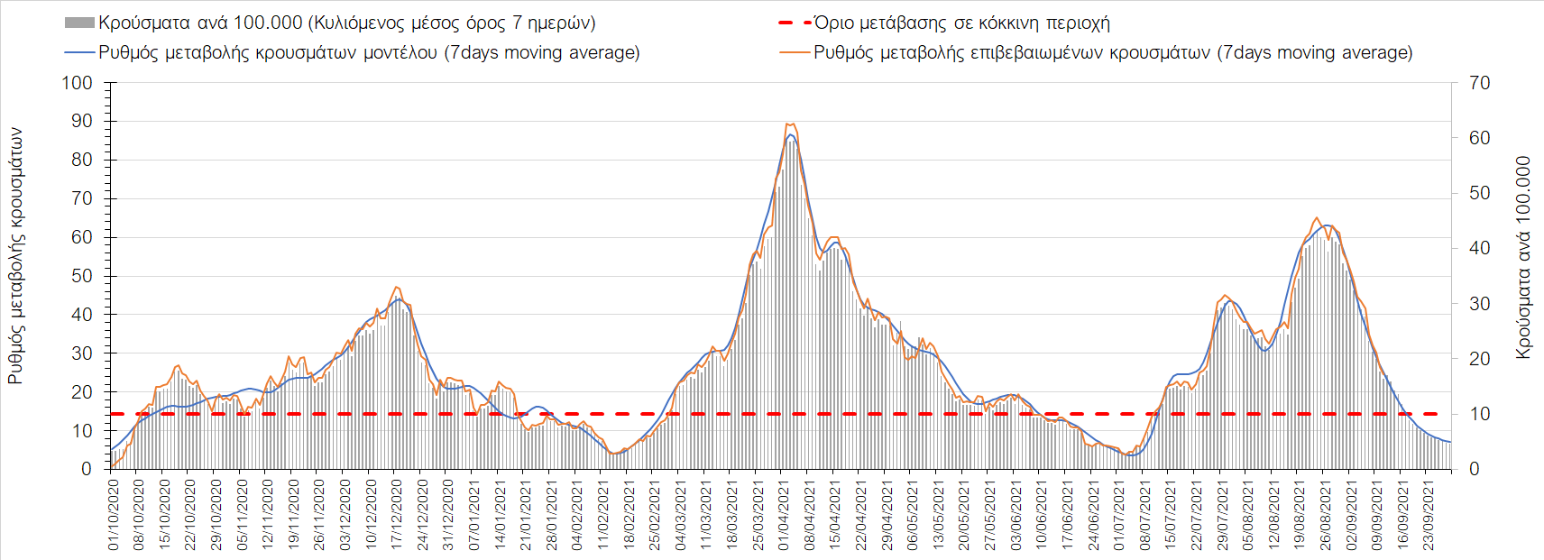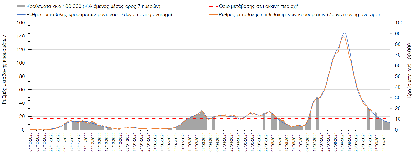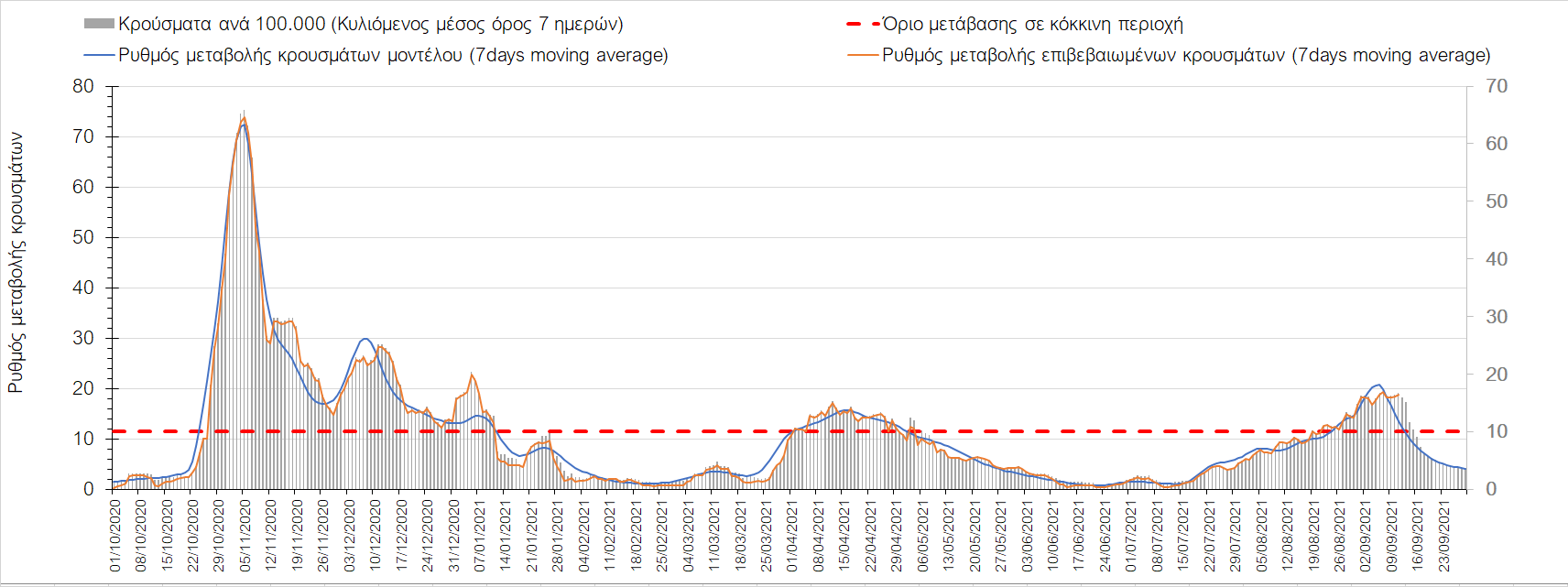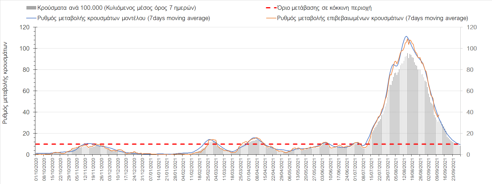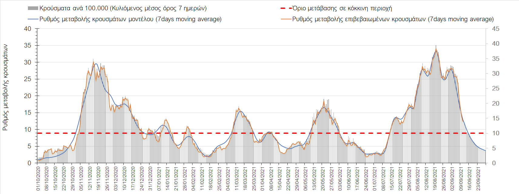 Αναμένουμε τις επόμενες ημέρες για να δούμε τις επιπτώσεις της επιστροφής του κύματος εξόδου του Αυγούστου, σε συνδυασμό με το άνοιγμα των σχολείων στην πορεία της πανδημίας. Αξίζει επίσης να σημειωθεί ότι οι υψηλές θερμοκρασίες των προηγουμένων ημερών, συντέλεσαν στη μείωση της μεταδοτικότητας και συνέβαλλαν στη συγκράτηση του αριθμού των κρουσμάτων, αλλά ήδη αρχίζει να διαφαίνεται επιβράδυνση της πτωτικής πορείας.