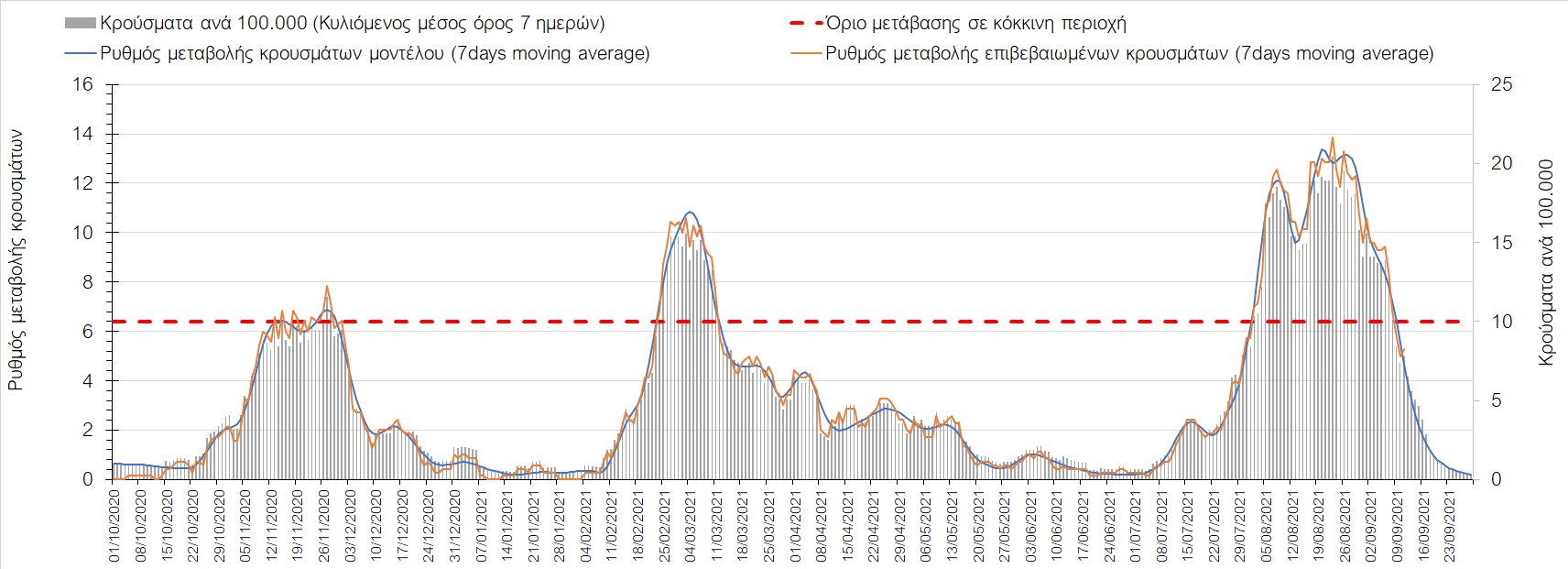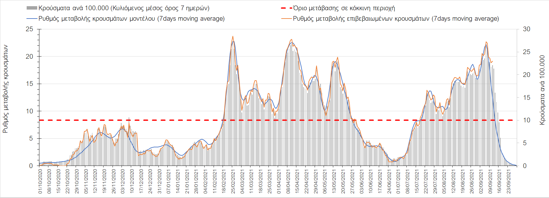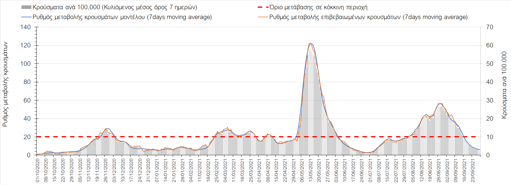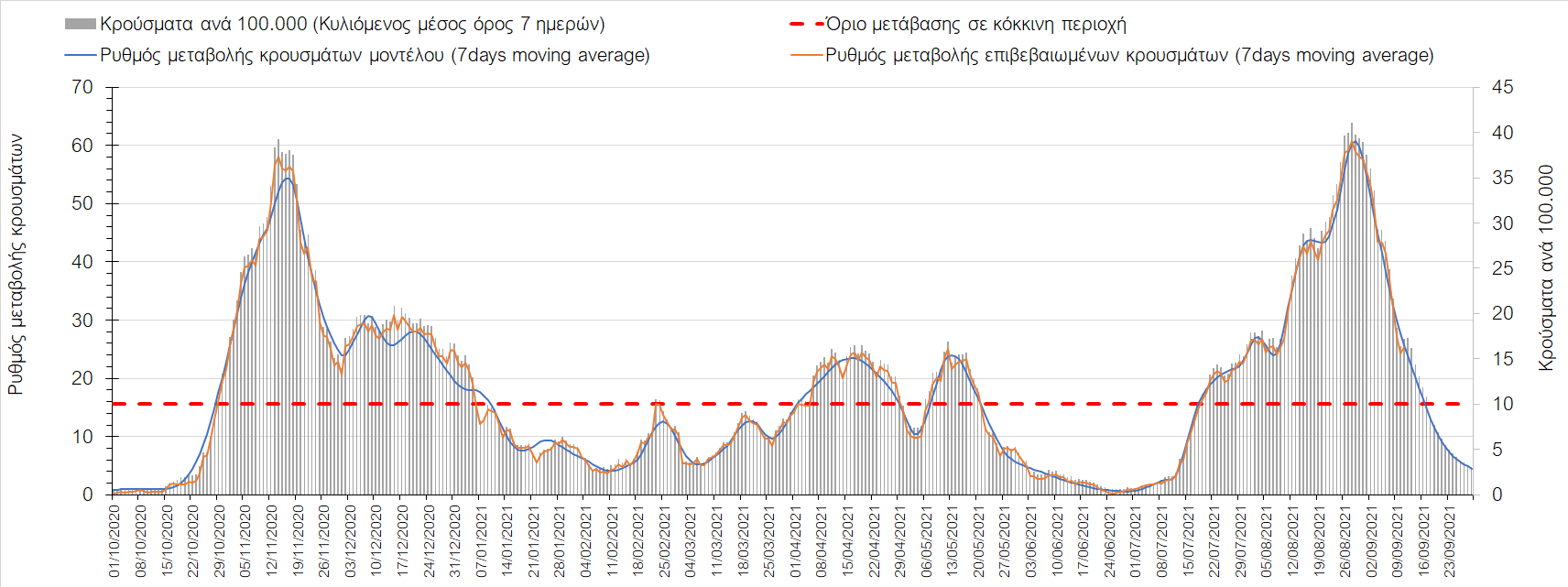 Αναμένουμε τις επόμενες ημέρες για να δούμε τις επιπτώσεις της επιστροφής του κύματος εξόδου του Αυγούστου, σε συνδυασμό με το άνοιγμα των σχολείων στην πορεία της πανδημίας. Αξίζει επίσης να σημειωθεί ότι οι υψηλές θερμοκρασίες των προηγουμένων ημερών, συντέλεσαν στη μείωση της μεταδοτικότητας και συνέβαλλαν στη συγκράτηση του αριθμού των κρουσμάτων, αλλά ήδη αρχίζει να διαφαίνεται επιβράδυνση της πτωτικής πορείας.