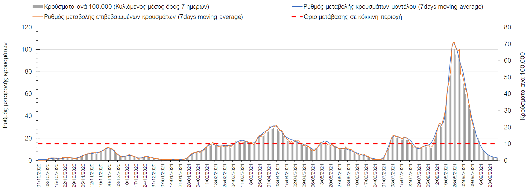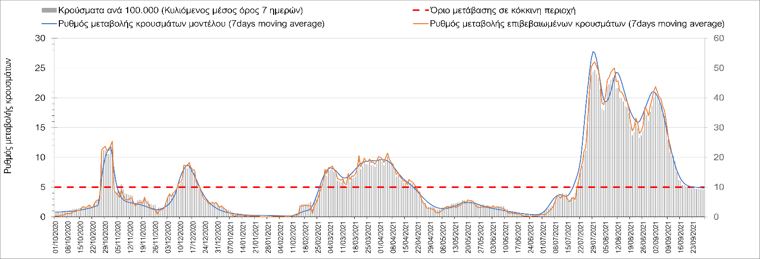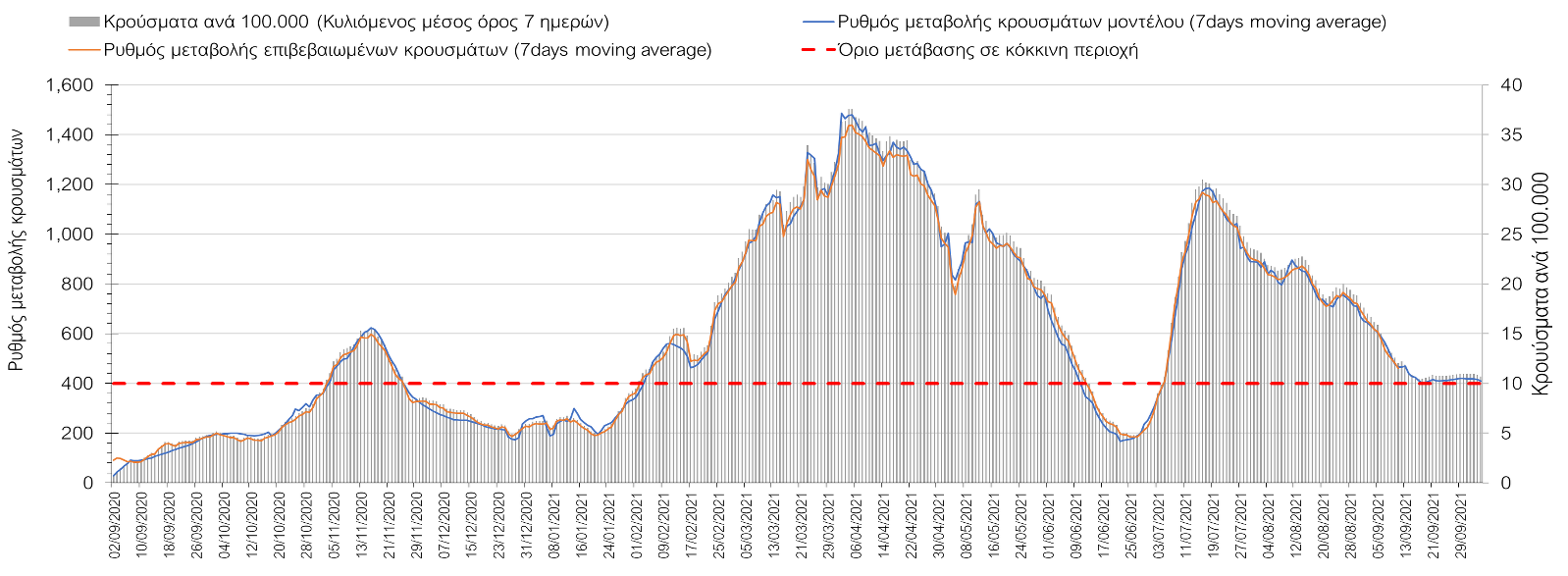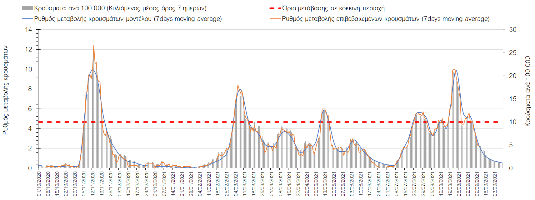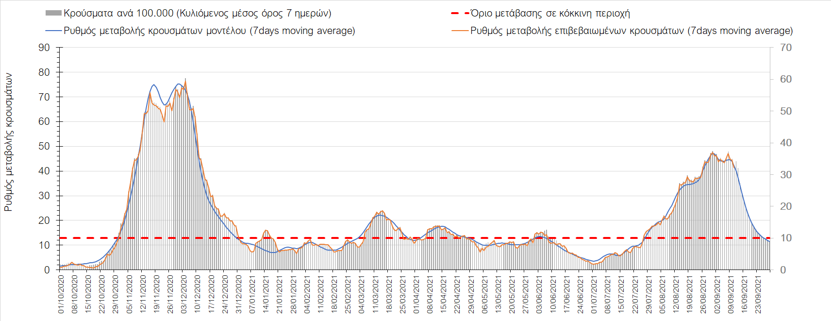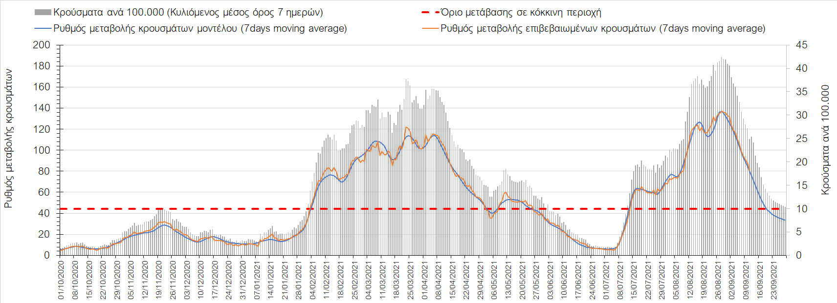 Αναμένουμε τις επόμενες ημέρες για να δούμε τις επιπτώσεις της επιστροφής του κύματος εξόδου του Αυγούστου, σε συνδυασμό με το άνοιγμα των σχολείων στην πορεία της πανδημίας. Αξίζει επίσης να σημειωθεί ότι οι υψηλές θερμοκρασίες των προηγουμένων ημερών, συντέλεσαν στη μείωση της μεταδοτικότητας και συνέβαλλαν στη συγκράτηση του αριθμού των κρουσμάτων, αλλά ήδη αρχίζει να διαφαίνεται επιβράδυνση της πτωτικής πορείας.