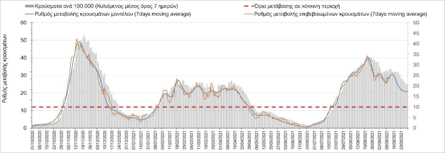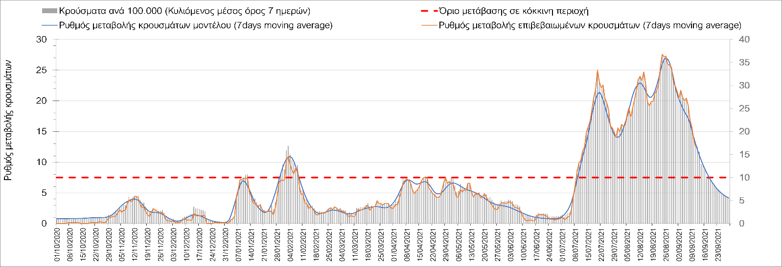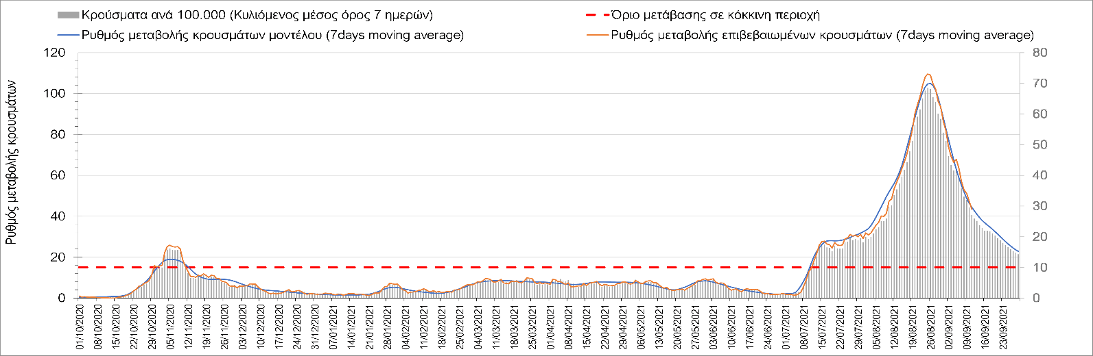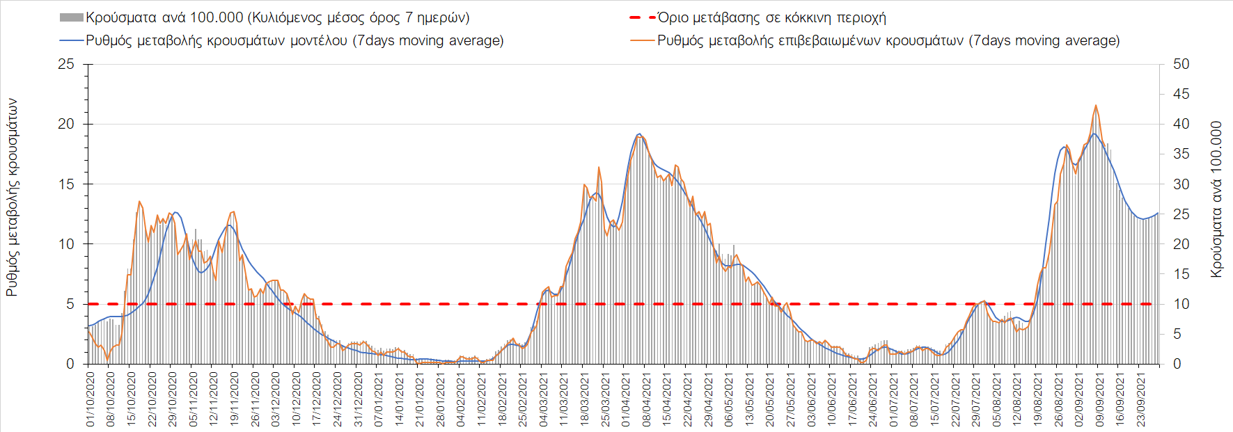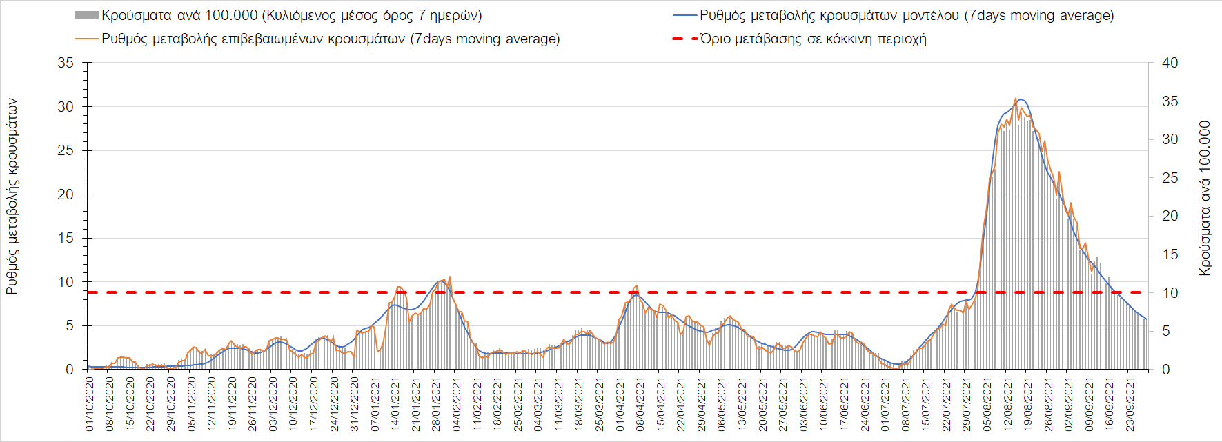 Αναμένουμε τις επόμενες ημέρες για να δούμε τις επιπτώσεις της επιστροφής του κύματος εξόδου του Αυγούστου, σε συνδυασμό με το άνοιγμα των σχολείων στην πορεία της πανδημίας. Αξίζει επίσης να σημειωθεί ότι οι υψηλές θερμοκρασίες των προηγουμένων ημερών, συντέλεσαν στη μείωση της μεταδοτικότητας και συνέβαλλαν στη συγκράτηση του αριθμού των κρουσμάτων, αλλά ήδη αρχίζει να διαφαίνεται επιβράδυνση της πτωτικής πορείας.