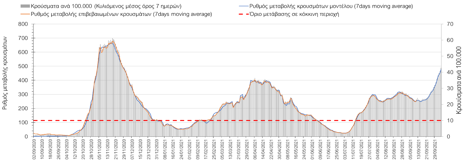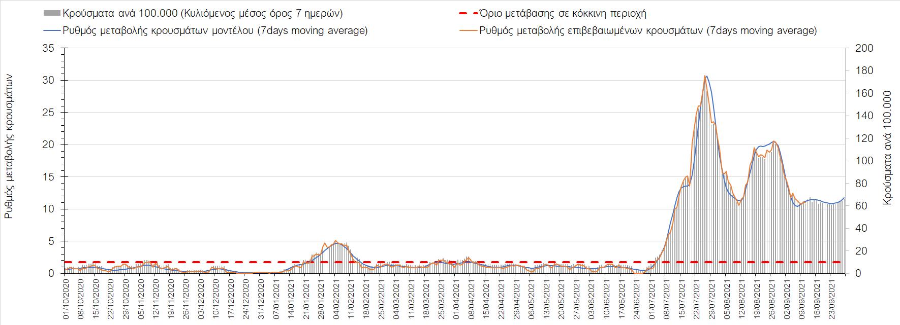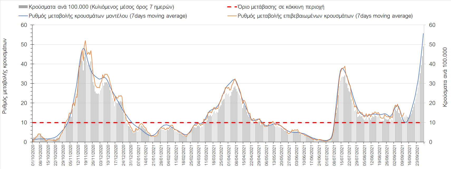 Εντούτοις, πλέον η Θεσσαλονίκη έχει αρκετά υψηλότερο αριθμό νέων κρουσμάτων (κυλιόμενο μέσο όρο 7 ημερών) ανά 100.000 πληθυσμού σε σχέση με την Αθήνα (23 έναντι 12), οπότε υπάρχει δυναμικό ταχύτερα αναπτυσσόμενου κύματος κατά τη Φθινοπωρινή περίοδο.