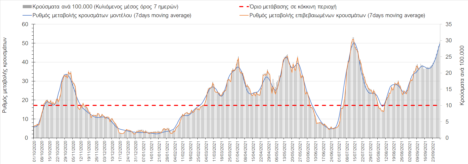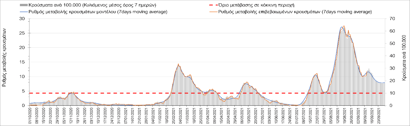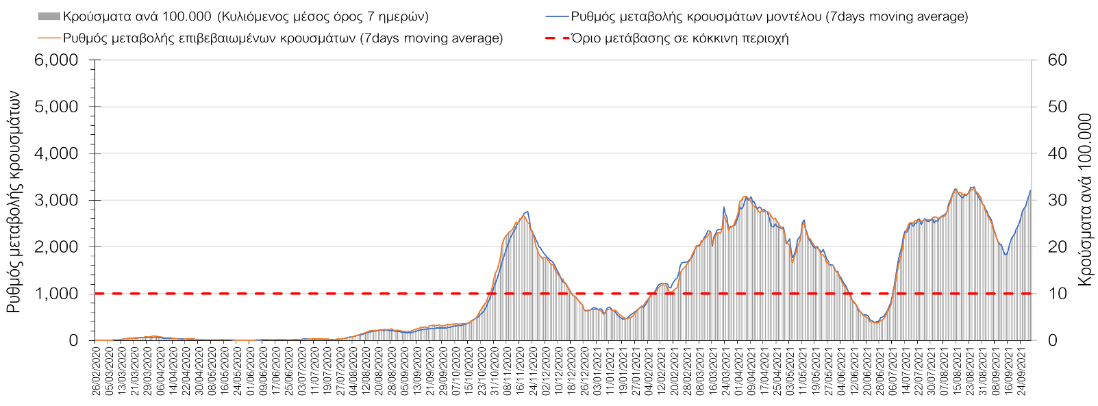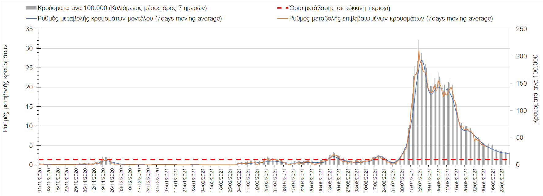 Εντούτοις, πλέον η Θεσσαλονίκη έχει αρκετά υψηλότερο αριθμό νέων κρουσμάτων (κυλιόμενο μέσο όρο 7 ημερών) ανά 100.000 πληθυσμού σε σχέση με την Αθήνα (23 έναντι 12), οπότε υπάρχει δυναμικό ταχύτερα αναπτυσσόμενου κύματος κατά τη Φθινοπωρινή περίοδο.