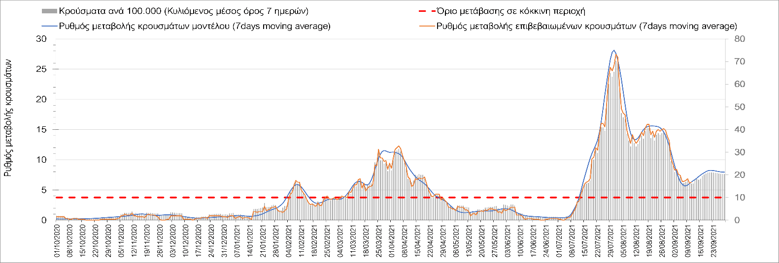 Η πορεία της μέσης εβδομαδιαίας τιμής των κρουσμάτων, καθώς και του κυλιόμενου μέσου όρου 7 ημερών του αριθμού των κρουσμάτων ανά 100.000 πληθυσμού, όπως έχουν καταγραφεί από τον ΕΟΔΥ και η αναμενόμενη πορεία τους όπως προδιαγράφεται από την υπολογιστική πλατφόρμα CORE για την Ελληνική επικράτεια μέχρι τις 30 Σεπτεμβρίου, αποτυπώνονται στο Σχήμα 4.