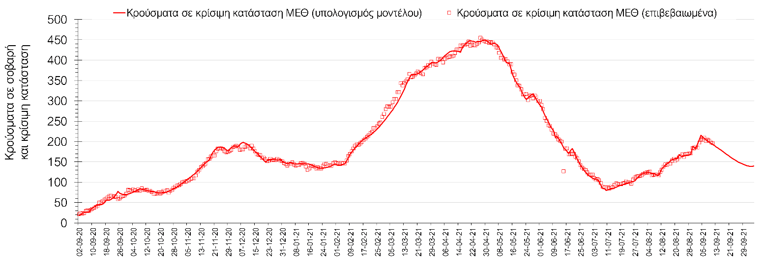 Όσον αφορά στους ασθενείς σε κρίσιμη κατάσταση (διασωληνωμένοι σε ΜΕΘ), ο αριθμός είναι ελαφρώς μειωμένος σε σχέση με προχθές (375 από 378), και έχει ξεκινήσει η πτωτική πορεία την χρονική στιγμή που αναμέναμε, η οποία και θα διατηρηθεί μέχρι να αρχίσει ξανά η άνοδος των κρουσμάτων τις επόμενες εβδομάδες.