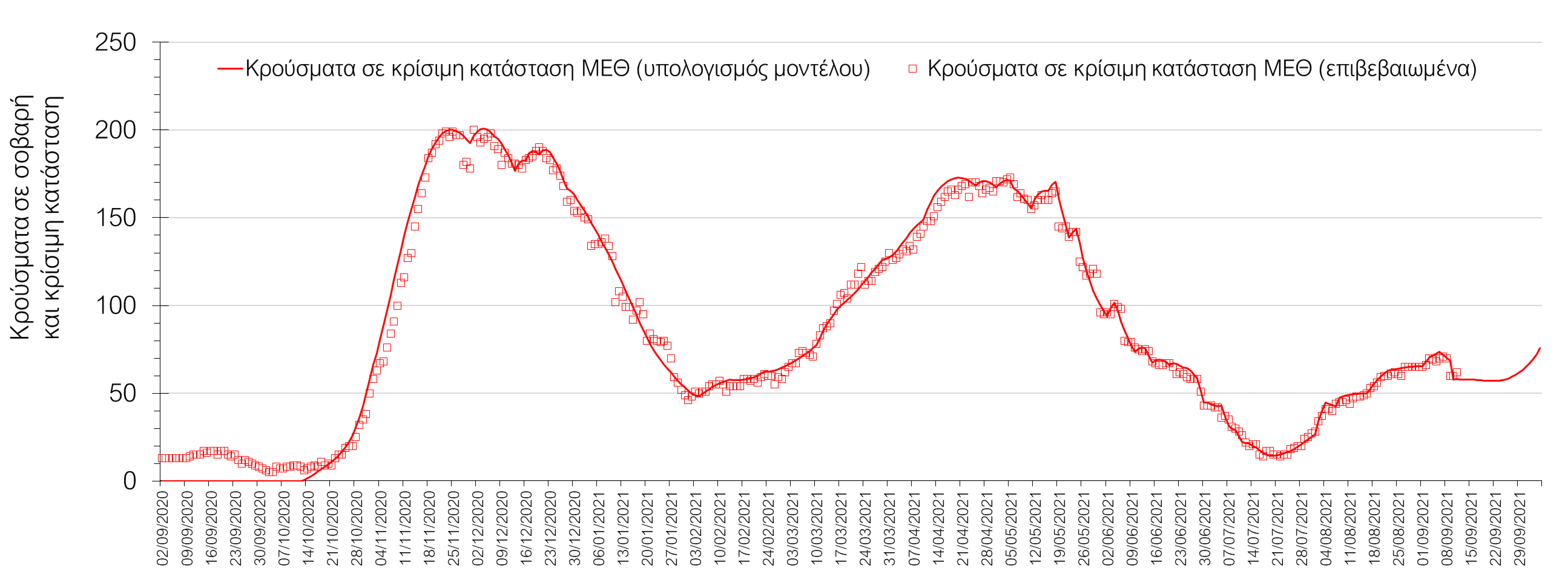 Σχήμα 1. Αριθμός κρουσμάτων σε κρίσιμη κατάσταση (ΜΕΘ) σύμφωνα με τα στοιχεία του ΕΟΔΥ και τις προβλέψεις της υπολογιστικής πλατφόρμας CORE.
