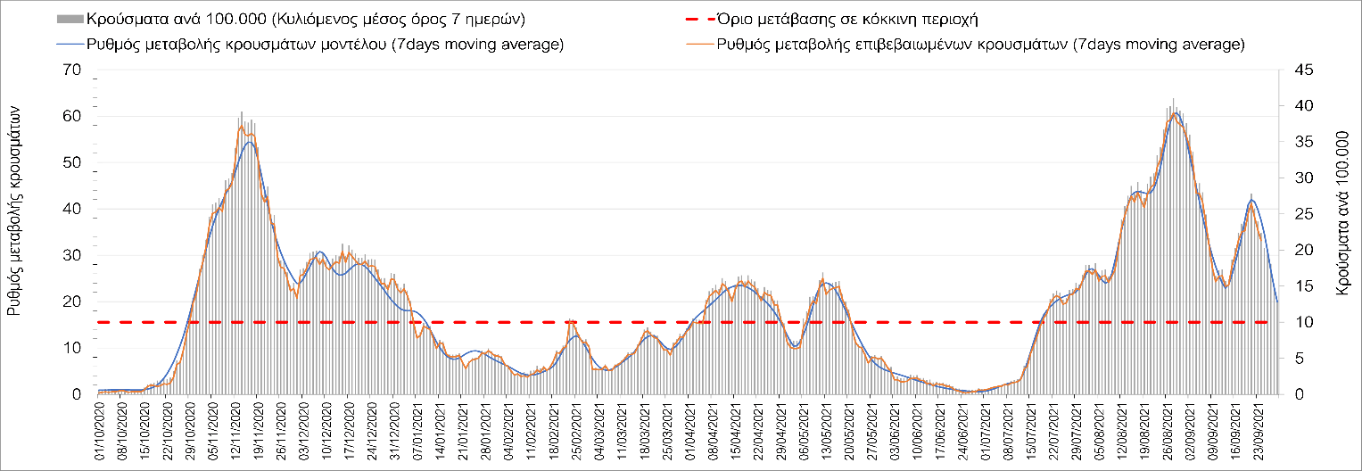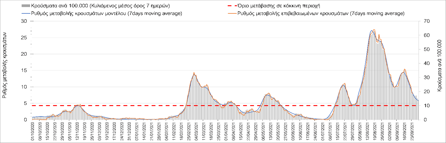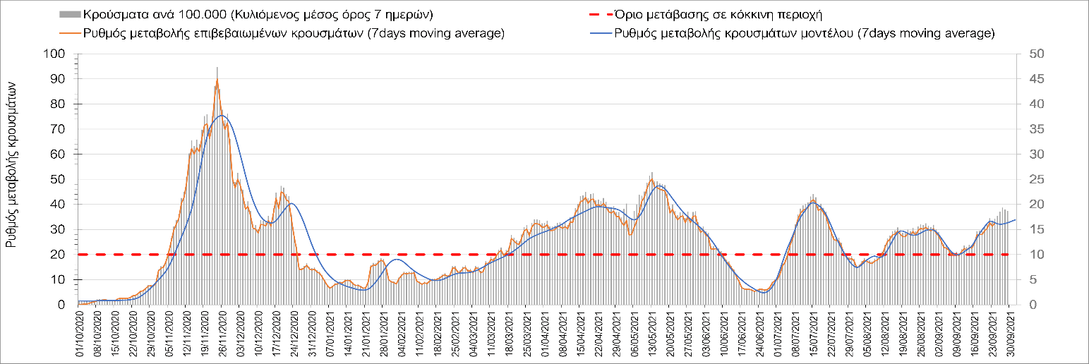 Η πορεία της μέσης εβδομαδιαίας τιμής των κρουσμάτων, καθώς και του κυλιόμενου μέσου όρου 7 ημερών του αριθμού των κρουσμάτων ανά 100.000 πληθυσμού, όπως έχουν καταγραφεί από τον ΕΟΔΥ και η αναμενόμενη πορεία τους όπως προδιαγράφεται από την υπολογιστική πλατφόρμα CORE για την Ελληνική επικράτεια μέχρι τις 30 Σεπτεμβρίου, αποτυπώνονται στο Σχήμα 4. Αυτή η προβλεπόμενη πορεία, που αφορά τα κρούσματα, τους νοσηλευόμενους σε απλές κλίνες, όσο και σε ΜΕΘ, καθώς επίσης και τους θανάτους, βασίζεται στις ακόλουθες παραδοχές: