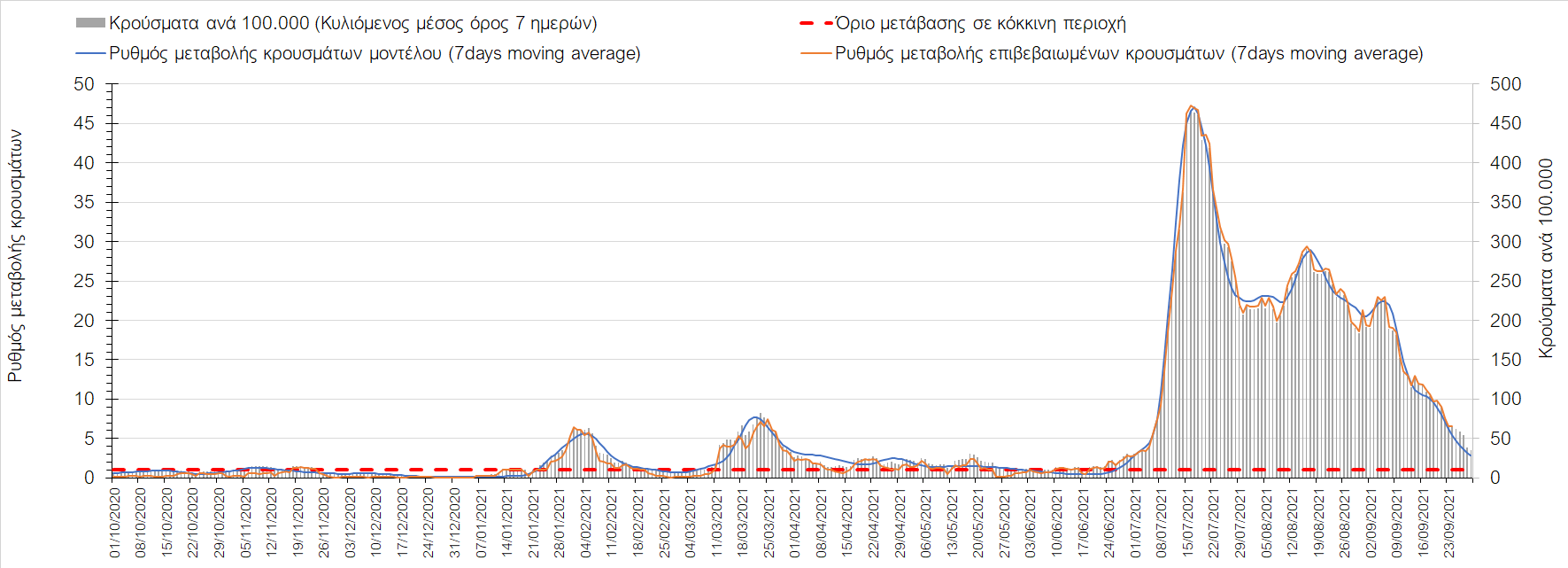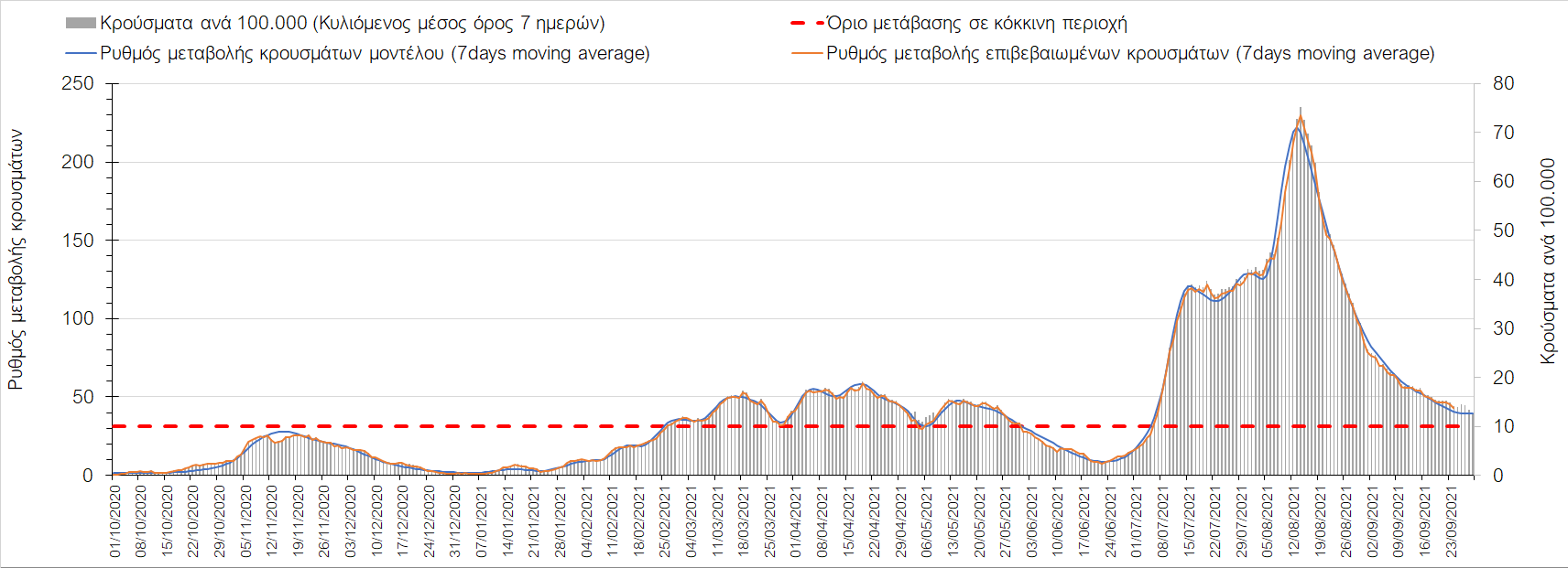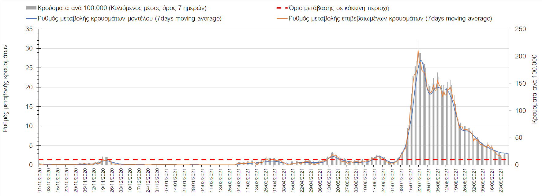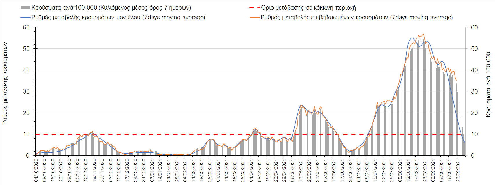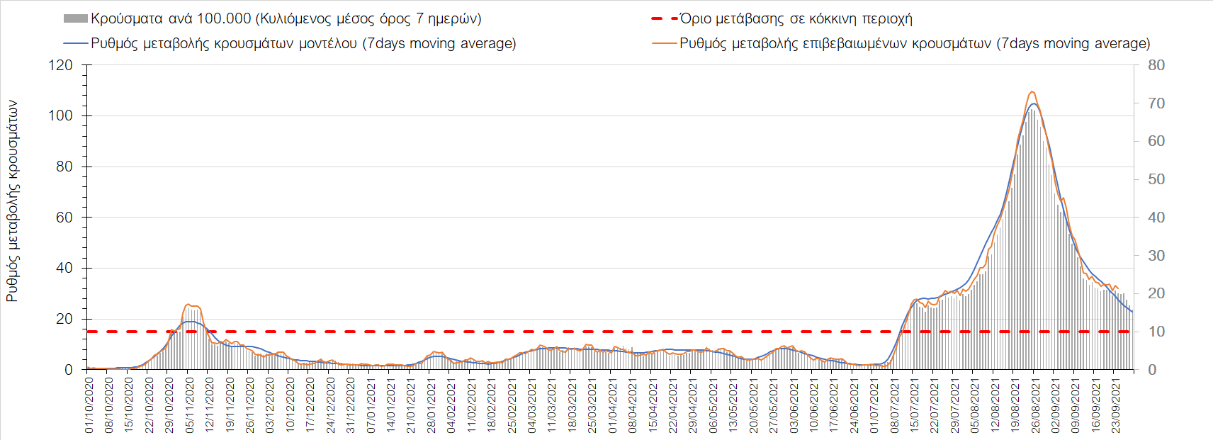 Η πτωτική πορεία που εμφανίζονταν μέχρι και πριν 15 ημέρες οφείλονταν σε μεγάλο βαθμό στον καύσωνα που χαρακτήριζε τον καιρό σε σχεδόν όλη τη χώρα πριν από 2-3 εβδομάδες και στον πολύ μεγάλο αριθμό τεστ που γίνονται ημερησίως από τον ΕΟΔΥ. Οι πολύ υψηλές θερμοκρασίες και η ιδιαίτερα έντονη ηλιοφάνεια βοήθησαν στην σταθεροποίηση της πορείας της πανδημίας, αλλά όχι και σε αποκλιμάκωση, καθώς ο βαθμός εμβολιασμού δεν είναι ακόμη αρκετά υψηλός και τα μέτρα ατομικής προστασίας εφαρμόζονται με μεγάλη χαλαρότητα. Για τους παραπάνω λόγους είναι ανησυχητική η πορεία της πανδημίας από την τρίτη εβδομάδα του Σεπτεμβρίου και έπειτα, όταν και οι παραθεριστές θα έχουν γυρίσει στα αστικά κέντρα και θα έχουν ανοίξει τα σχολεία με αποτέλεσμα την έντονη ανάμιξη του πληθυσμού και την αύξηση της πιθανότητας ενεργών επαφών ανάμεσα σε φορείς του ιού και σε άτομα χωρίς ανοσία. Για την ώρα παρατηρείται συγκράτηση του αριθμού των κρουσμάτων, που υποβοηθείται από το συνολικά μεγάλο αριθμό τεστ που γίνονται καθημερινά.