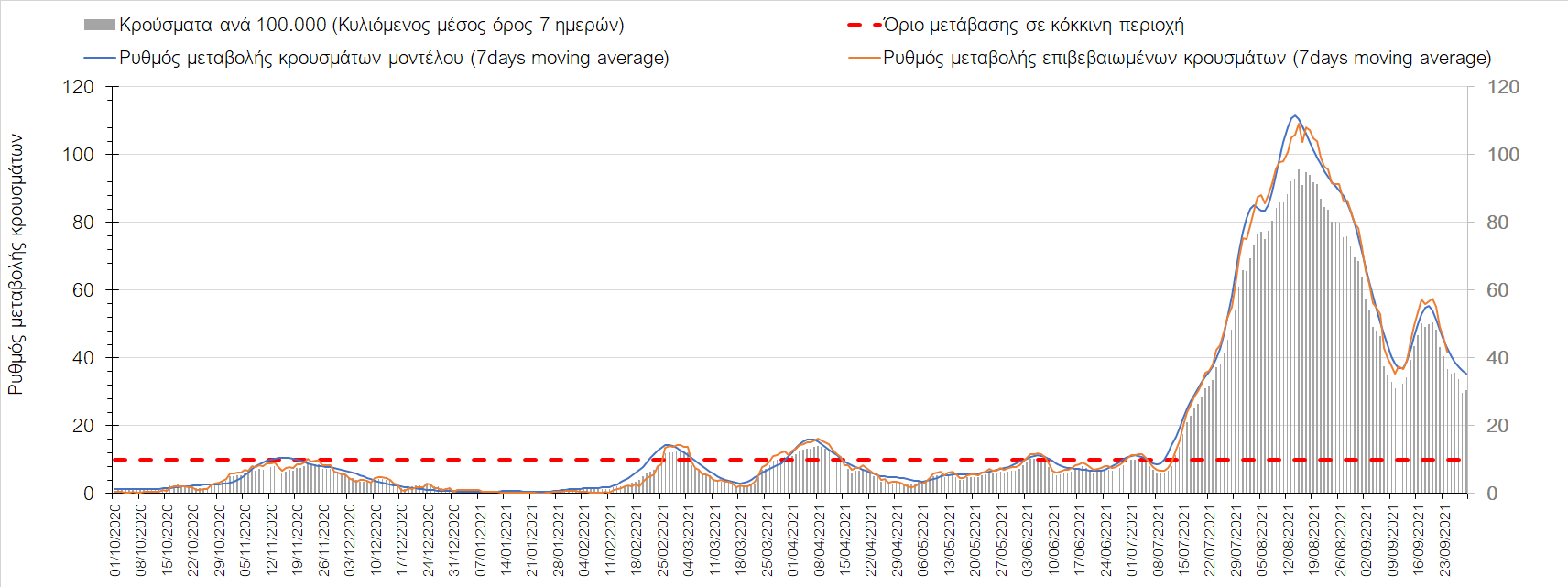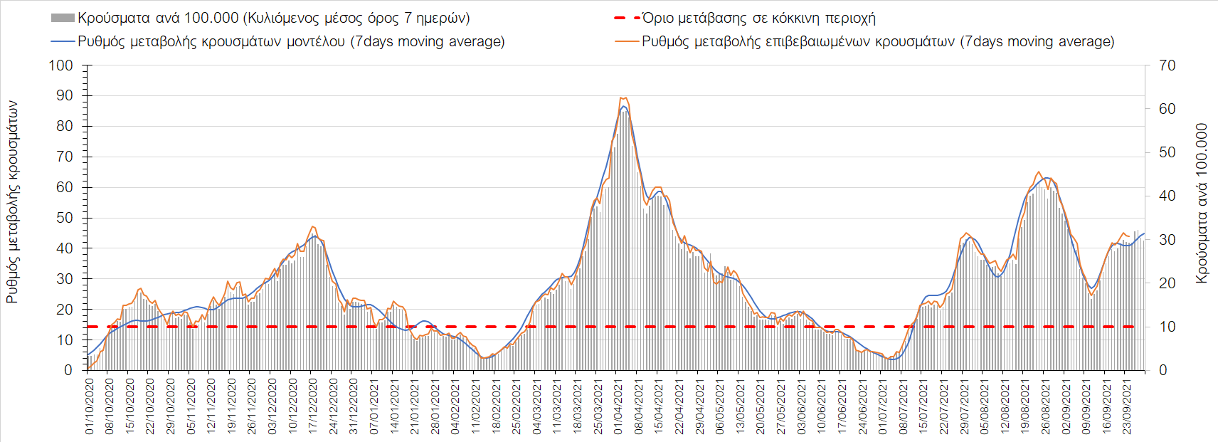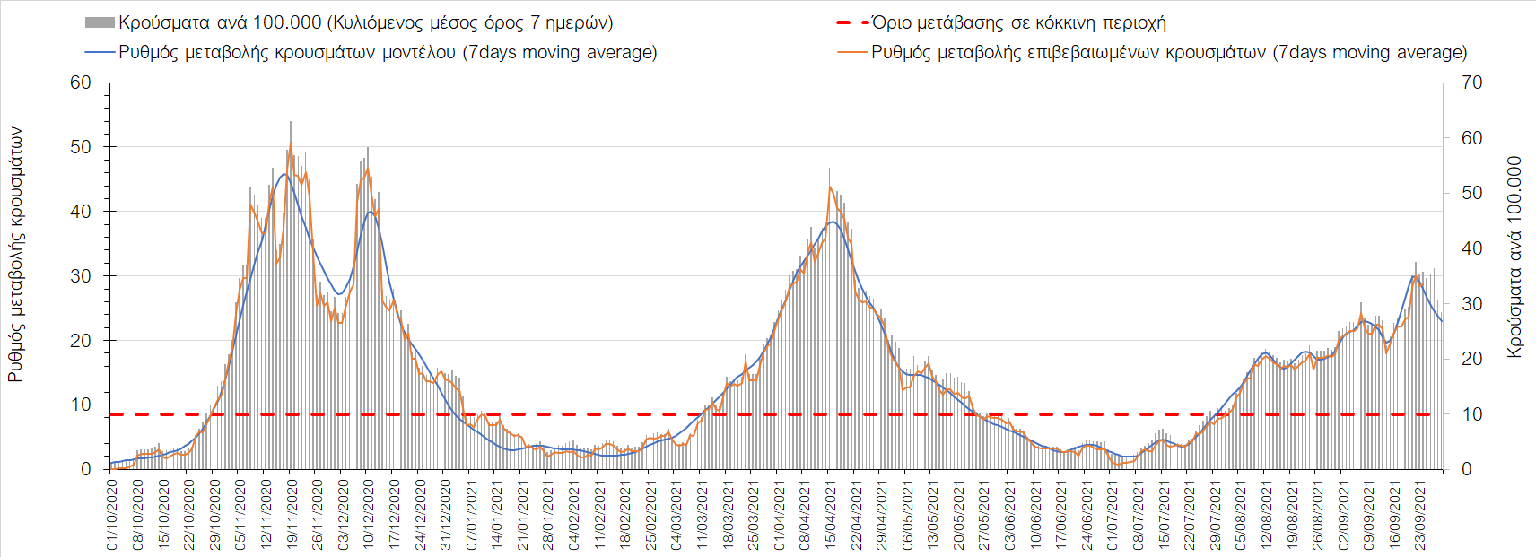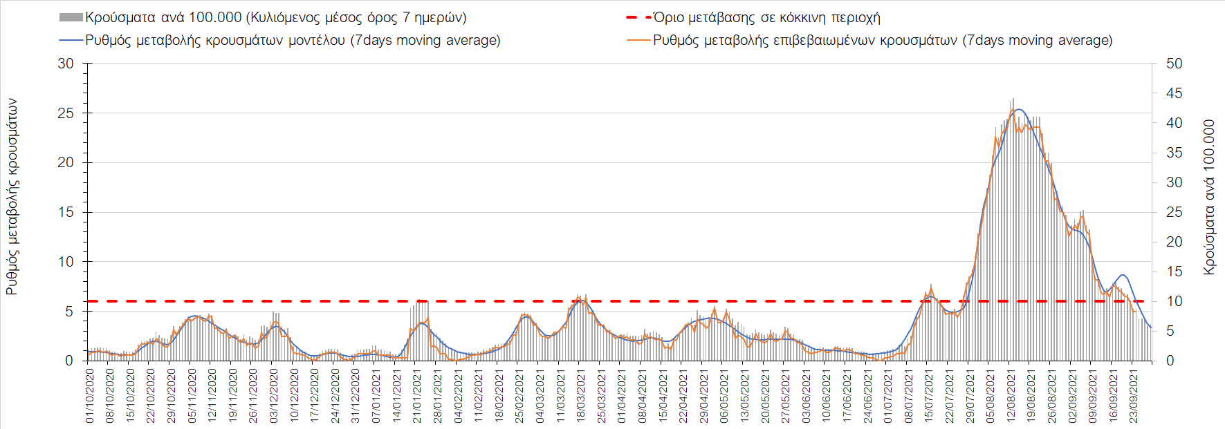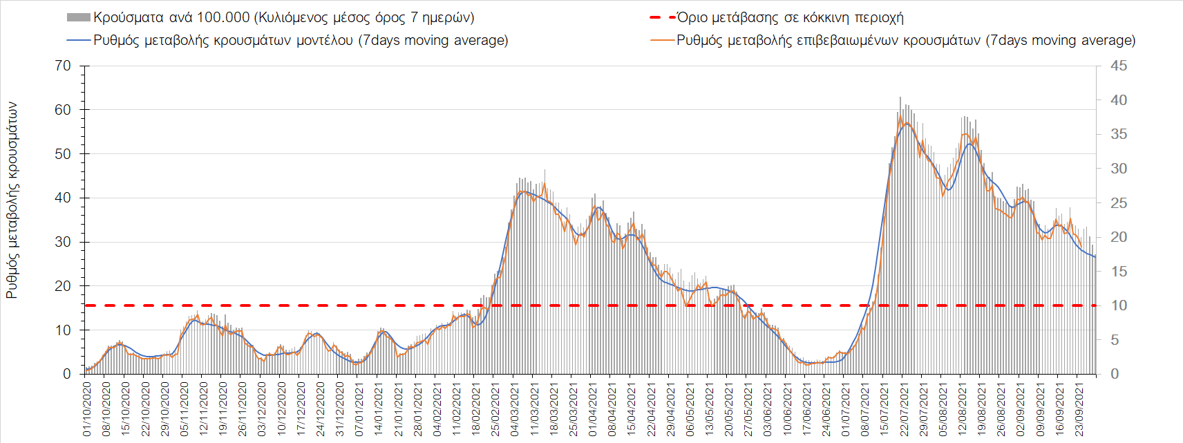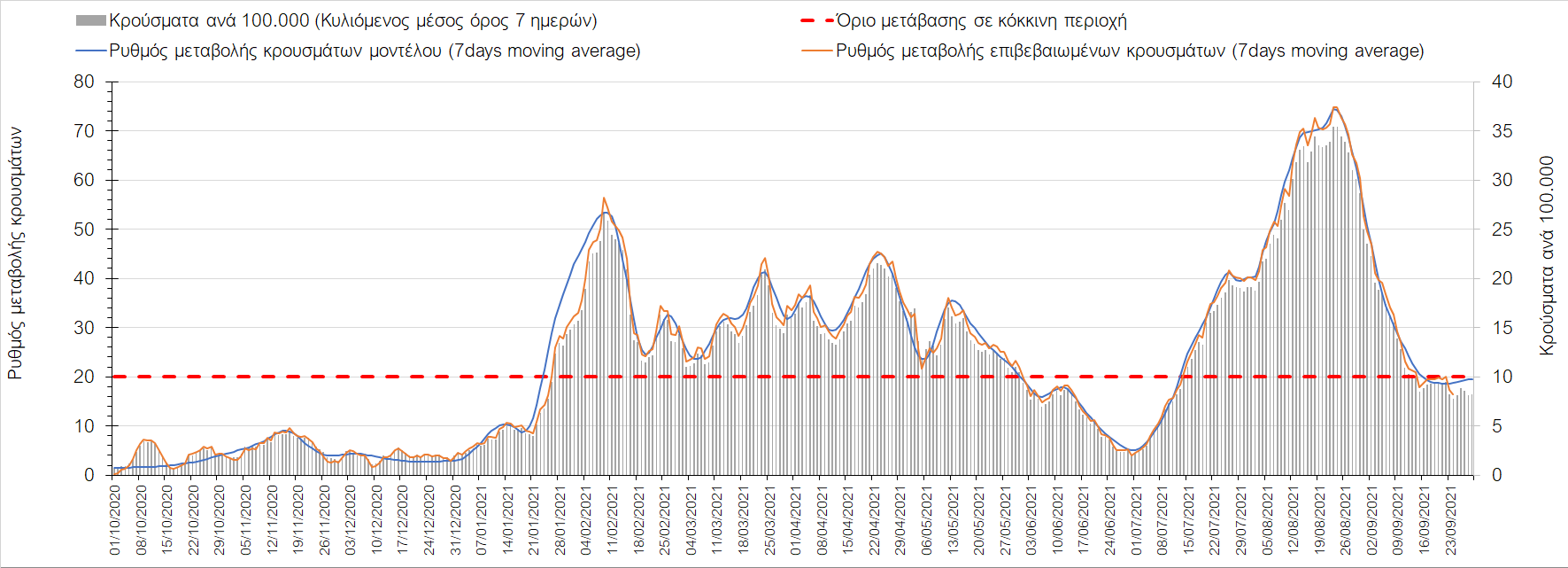 Η πτωτική πορεία που εμφανίζονταν μέχρι και πριν 15 ημέρες οφείλονταν σε μεγάλο βαθμό στον καύσωνα που χαρακτήριζε τον καιρό σε σχεδόν όλη τη χώρα πριν από 2-3 εβδομάδες και στον πολύ μεγάλο αριθμό τεστ που γίνονται ημερησίως από τον ΕΟΔΥ. Οι πολύ υψηλές θερμοκρασίες και η ιδιαίτερα έντονη ηλιοφάνεια βοήθησαν στην σταθεροποίηση της πορείας της πανδημίας, αλλά όχι και σε αποκλιμάκωση, καθώς ο βαθμός εμβολιασμού δεν είναι ακόμη αρκετά υψηλός και τα μέτρα ατομικής προστασίας εφαρμόζονται με μεγάλη χαλαρότητα. Για τους παραπάνω λόγους είναι ανησυχητική η πορεία της πανδημίας από την τρίτη εβδομάδα του Σεπτεμβρίου και έπειτα, όταν και οι παραθεριστές θα έχουν γυρίσει στα αστικά κέντρα και θα έχουν ανοίξει τα σχολεία με αποτέλεσμα την έντονη ανάμιξη του πληθυσμού και την αύξηση της πιθανότητας ενεργών επαφών ανάμεσα σε φορείς του ιού και σε άτομα χωρίς ανοσία. Για την ώρα παρατηρείται συγκράτηση του αριθμού των κρουσμάτων, που υποβοηθείται από το συνολικά μεγάλο αριθμό τεστ που γίνονται καθημερινά.