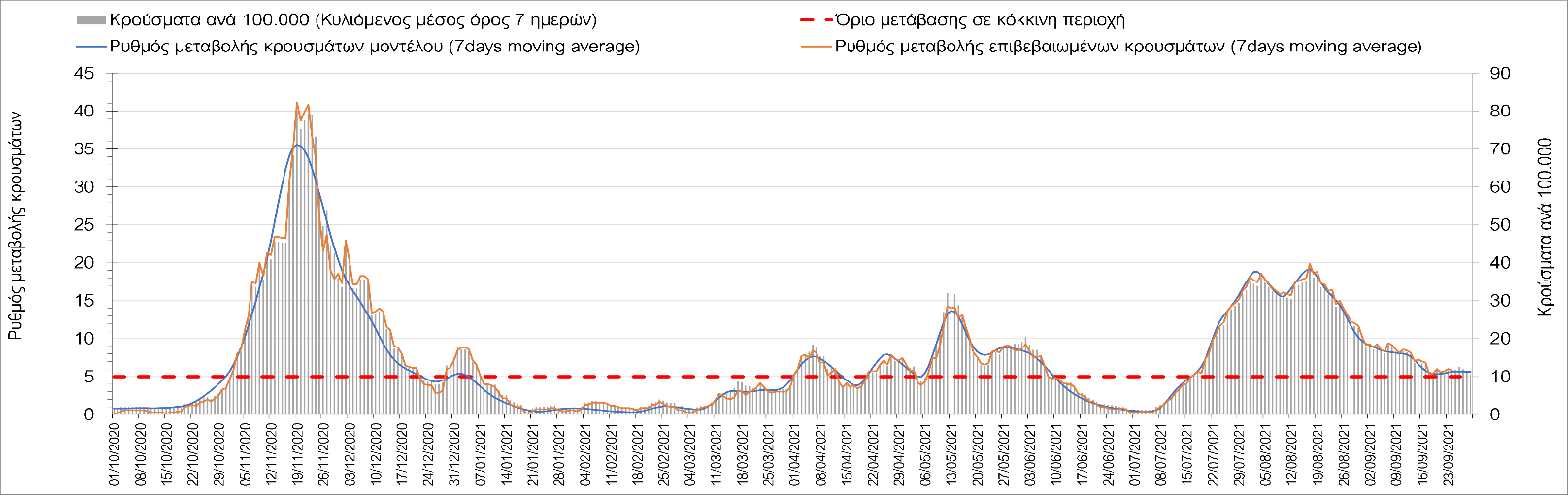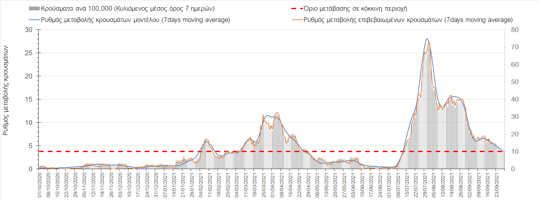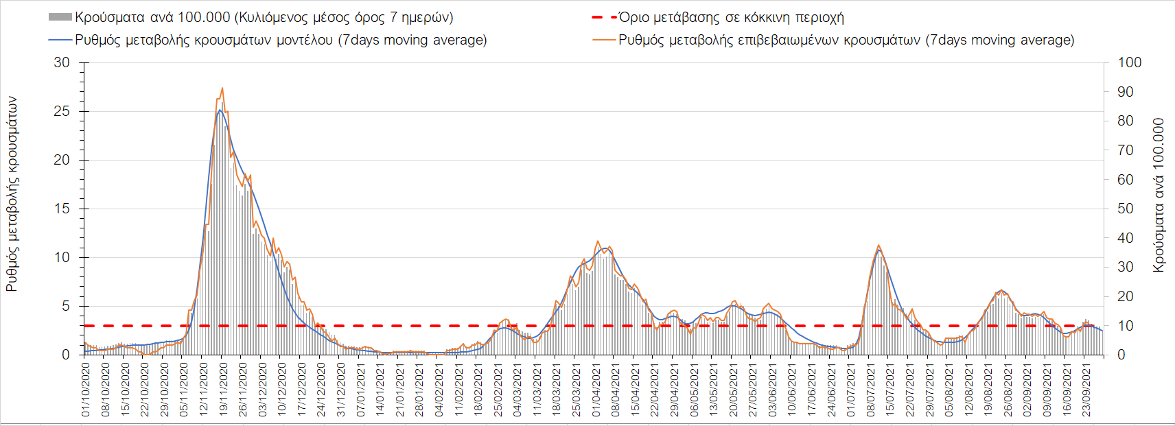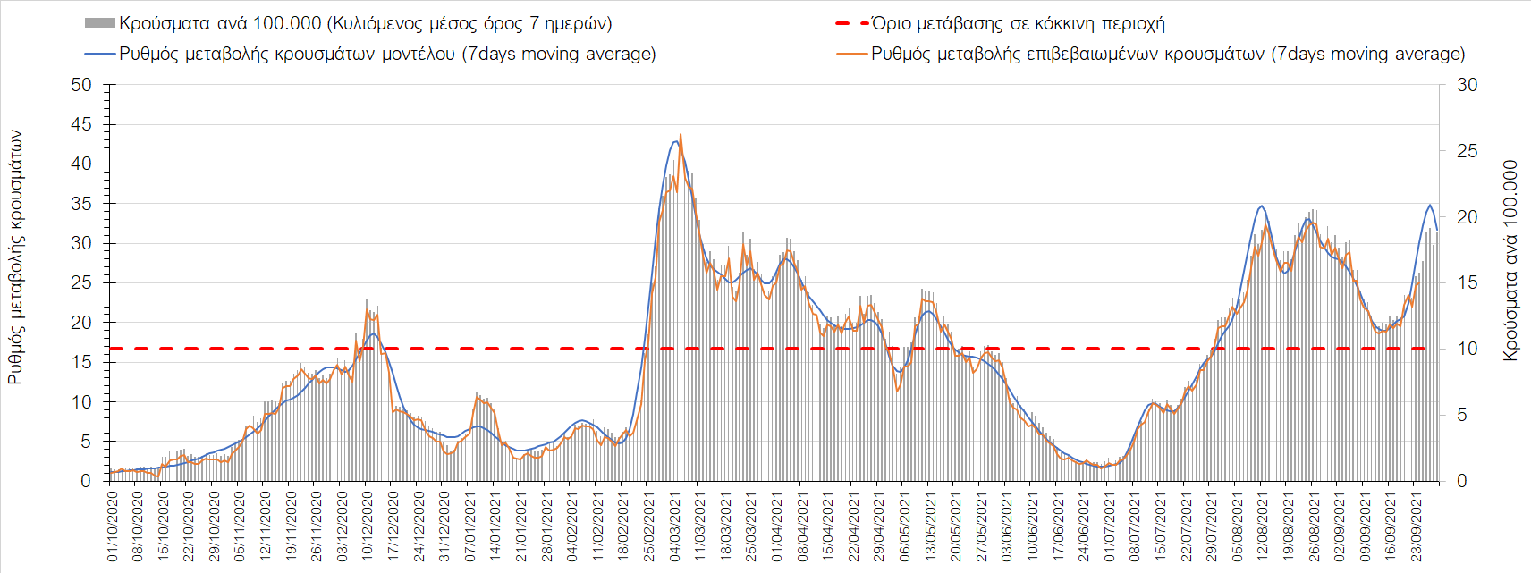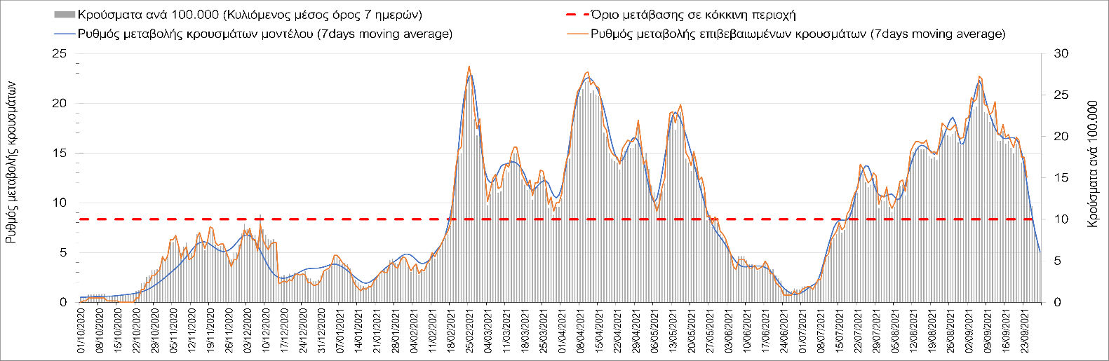Η πτωτική πορεία που εμφανίζονταν μέχρι και πριν 15 ημέρες οφείλονταν σε μεγάλο βαθμό στον καύσωνα που χαρακτήριζε τον καιρό σε σχεδόν όλη τη χώρα πριν από 2-3 εβδομάδες και στον πολύ μεγάλο αριθμό τεστ που γίνονται ημερησίως από τον ΕΟΔΥ. Οι πολύ υψηλές θερμοκρασίες και η ιδιαίτερα έντονη ηλιοφάνεια βοήθησαν στην σταθεροποίηση της πορείας της πανδημίας, αλλά όχι και σε αποκλιμάκωση, καθώς ο βαθμός εμβολιασμού δεν είναι ακόμη αρκετά υψηλός και τα μέτρα ατομικής προστασίας εφαρμόζονται με μεγάλη χαλαρότητα. Για τους παραπάνω λόγους είναι ανησυχητική η πορεία της πανδημίας από την τρίτη εβδομάδα του Σεπτεμβρίου και έπειτα, όταν και οι παραθεριστές θα έχουν γυρίσει στα αστικά κέντρα και θα έχουν ανοίξει τα σχολεία με αποτέλεσμα την έντονη ανάμιξη του πληθυσμού και την αύξηση της πιθανότητας ενεργών επαφών ανάμεσα σε φορείς του ιού και σε άτομα χωρίς ανοσία. Για την ώρα παρατηρείται συγκράτηση του αριθμού των κρουσμάτων, που υποβοηθείται από το συνολικά μεγάλο αριθμό τεστ που γίνονται καθημερινά.