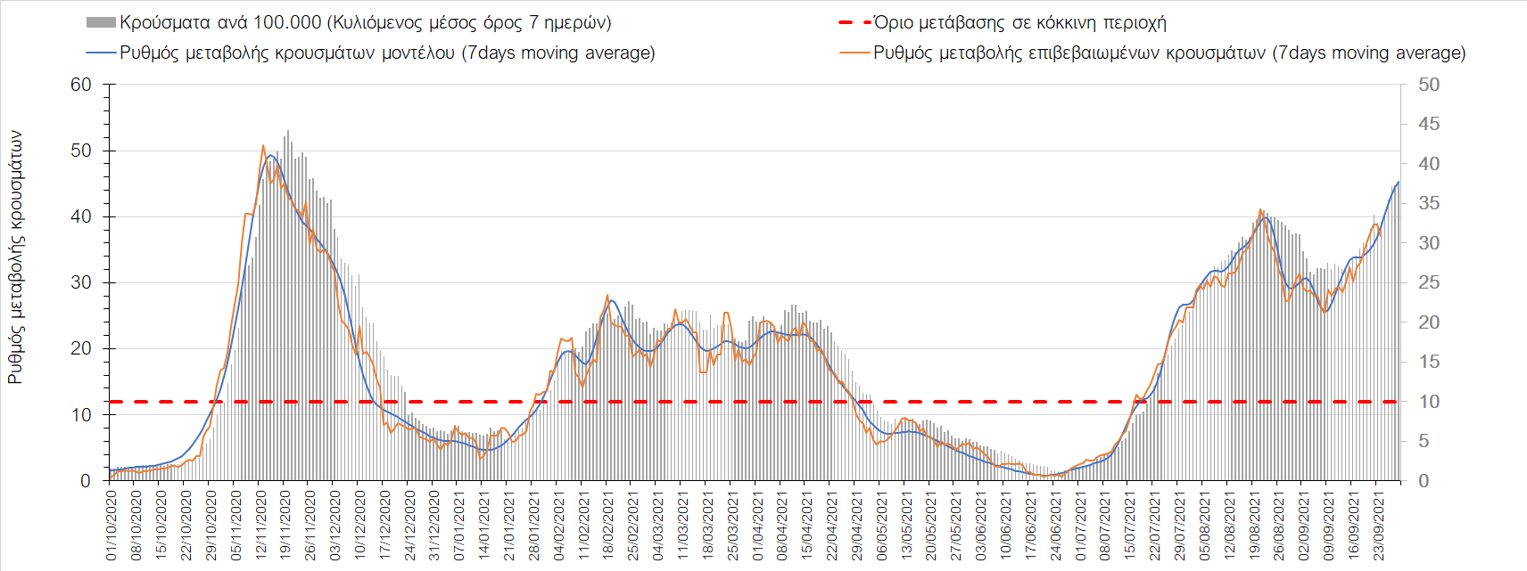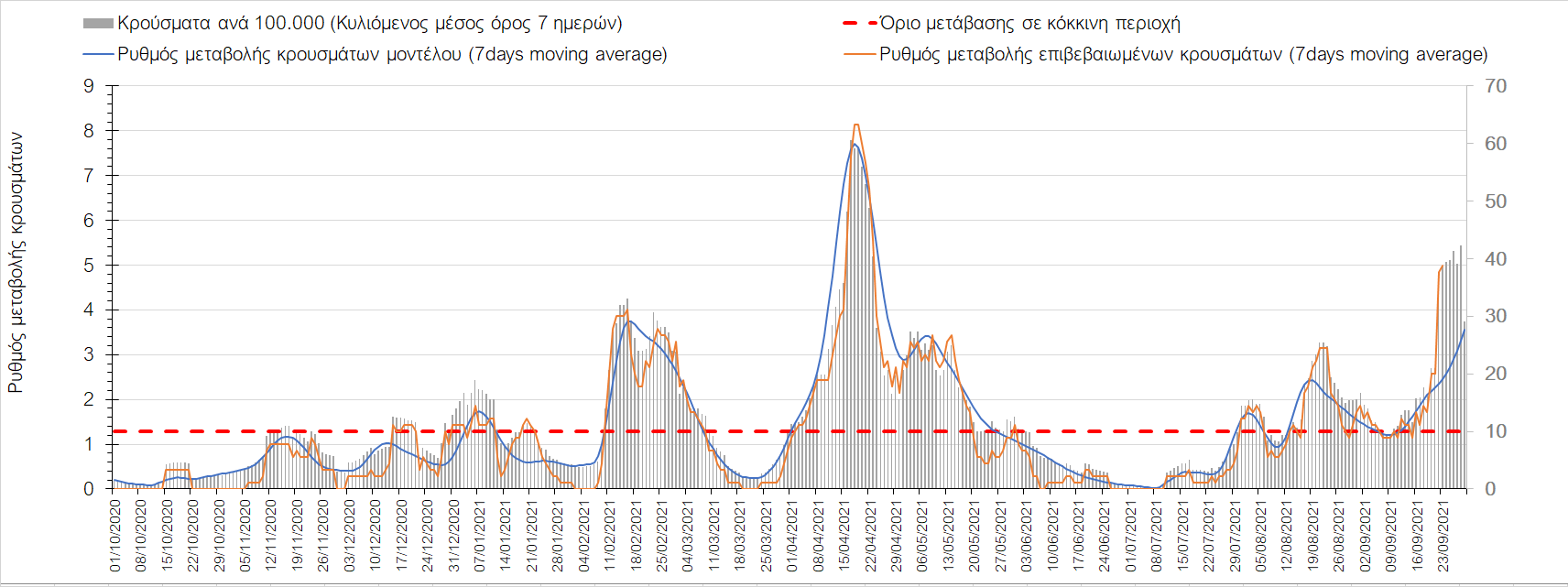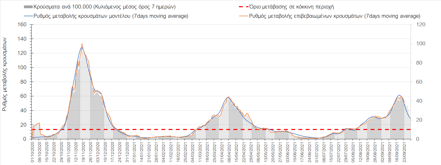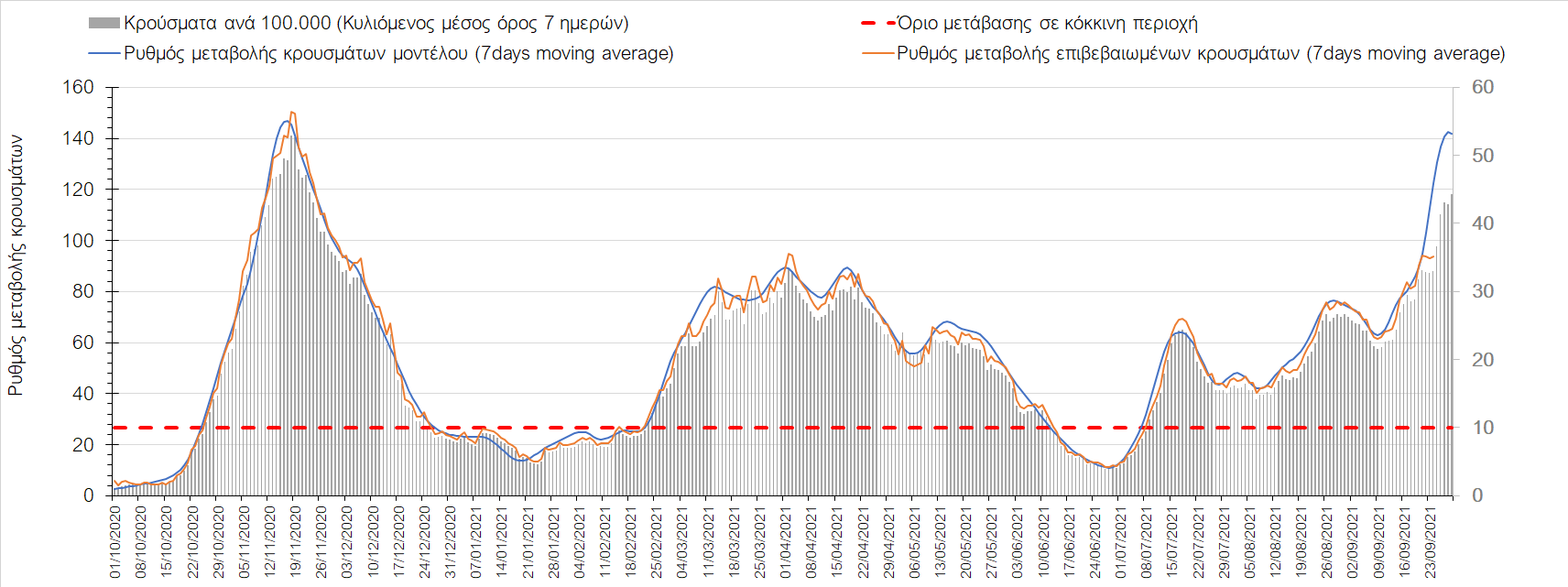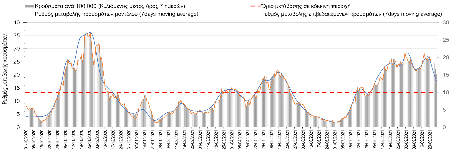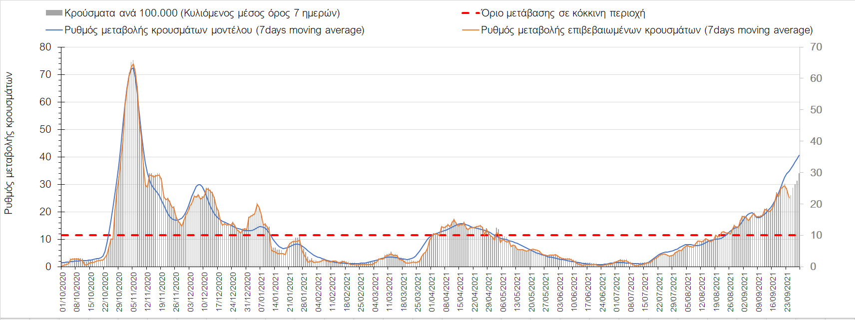 Η πτωτική πορεία που εμφανίζονταν μέχρι και πριν 15 ημέρες οφείλονταν σε μεγάλο βαθμό στον καύσωνα που χαρακτήριζε τον καιρό σε σχεδόν όλη τη χώρα πριν από 2-3 εβδομάδες και στον πολύ μεγάλο αριθμό τεστ που γίνονται ημερησίως από τον ΕΟΔΥ. Οι πολύ υψηλές θερμοκρασίες και η ιδιαίτερα έντονη ηλιοφάνεια βοήθησαν στην σταθεροποίηση της πορείας της πανδημίας, αλλά όχι και σε αποκλιμάκωση, καθώς ο βαθμός εμβολιασμού δεν είναι ακόμη αρκετά υψηλός και τα μέτρα ατομικής προστασίας εφαρμόζονται με μεγάλη χαλαρότητα. Για τους παραπάνω λόγους είναι ανησυχητική η πορεία της πανδημίας από την τρίτη εβδομάδα του Σεπτεμβρίου και έπειτα, όταν και οι παραθεριστές θα έχουν γυρίσει στα αστικά κέντρα και θα έχουν ανοίξει τα σχολεία με αποτέλεσμα την έντονη ανάμιξη του πληθυσμού και την αύξηση της πιθανότητας ενεργών επαφών ανάμεσα σε φορείς του ιού και σε άτομα χωρίς ανοσία. Για την ώρα παρατηρείται συγκράτηση του αριθμού των κρουσμάτων, που υποβοηθείται από το συνολικά μεγάλο αριθμό τεστ που γίνονται καθημερινά.