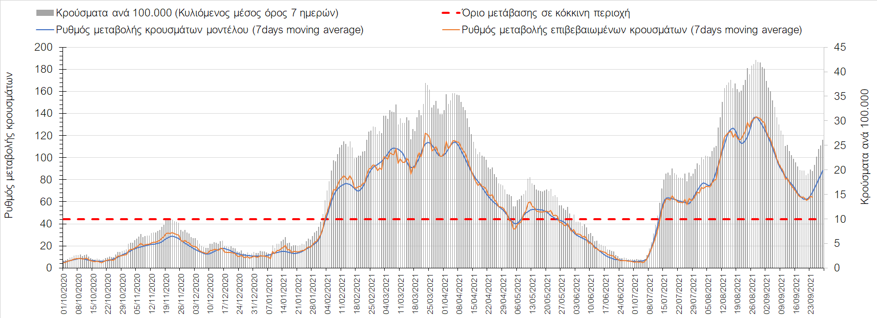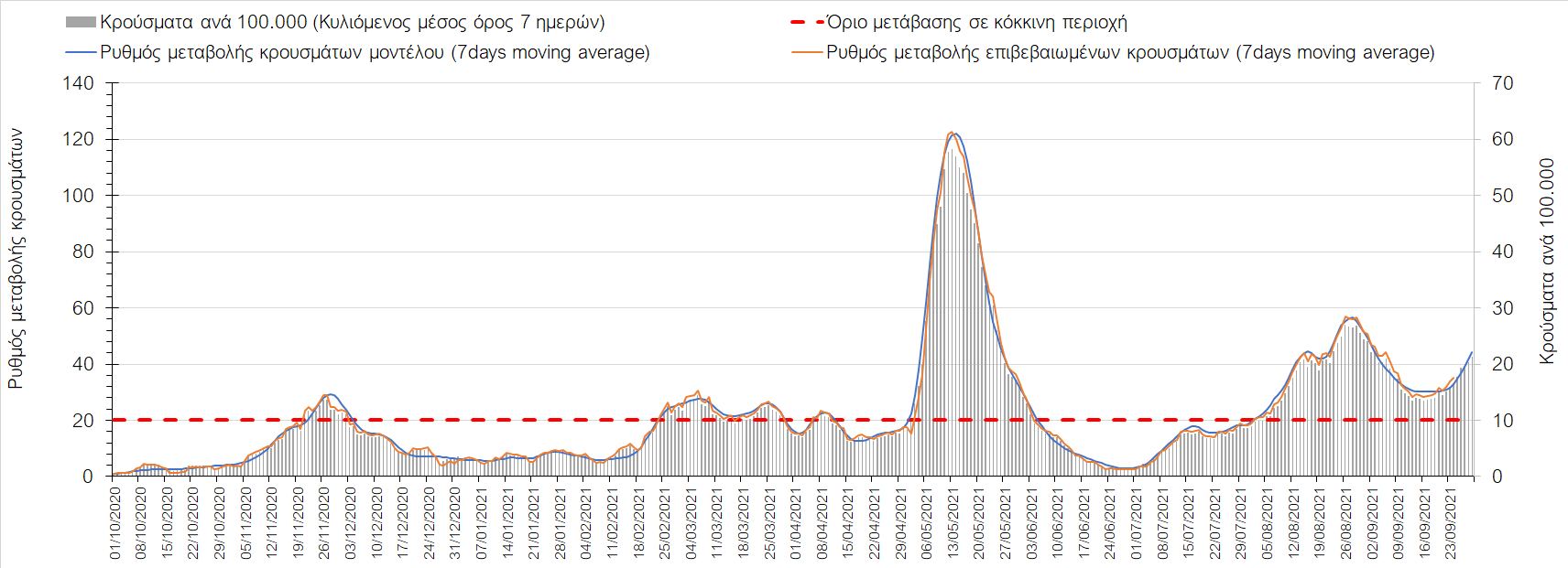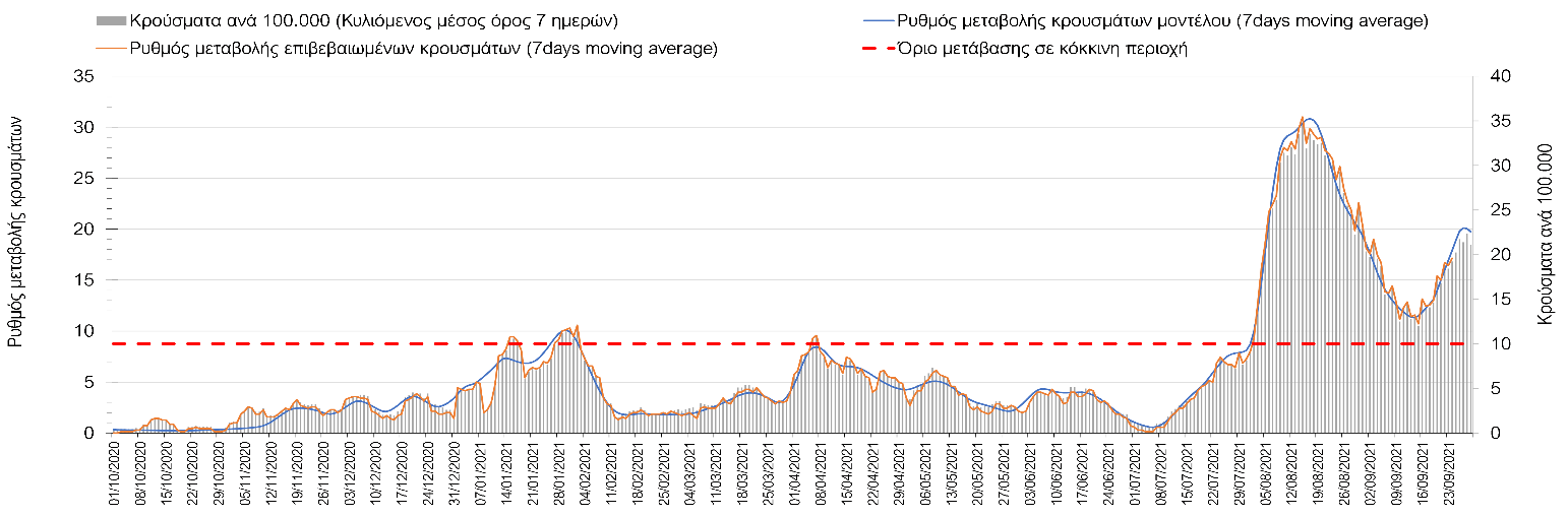 Συνολικά η ανοδική τάση των τελευταίων ημερών αντικατοπτρίζεται και από τον ημερήσιο αριθμό των κρουσμάτων (κυλιόμενος μέσος όρος 7 ημερών), ο οποίος είναι οριακά κάτω από τα 2200 (2166).
