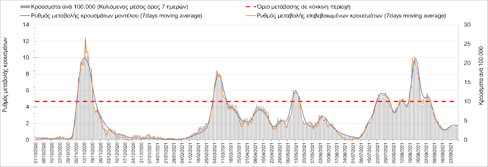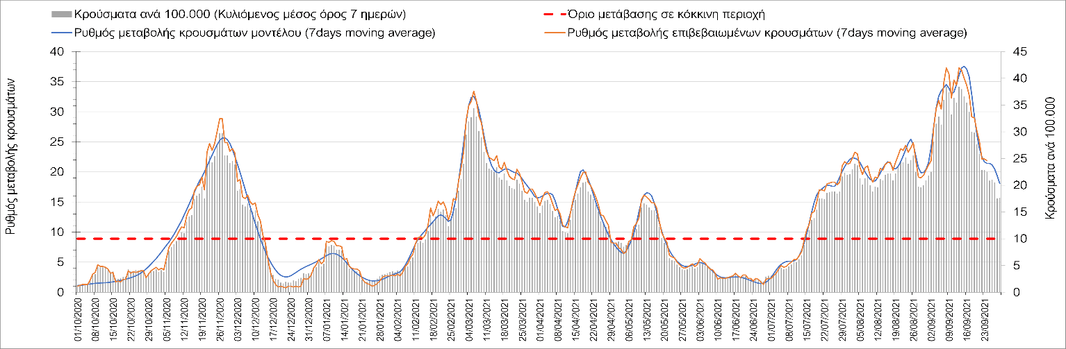 Σε πανελλαδικό επίπεδο ο κυλιόμενος εβδομαδιαίος μέσος όρος του δείκτη θετικότητας διαμορφώθηκε στο 1,3% (η ημερήσια τιμή είναι 0,9%) ενώ ο κυλιόμενος εβδομαδιαίος μέσος όρος του πραγματικού αριθμού αναπαραγωγής Rt (δηλαδή ο αριθμός των ατόμων που ένας φορέας μπορεί να επιμολύνει) μειώθηκε και διαμορφώθηκε στο 1,01 (Rt πάνω από τη μονάδα υποδηλώνει καθαρή αύξηση της διασποράς του ιού στην κοινότητα).