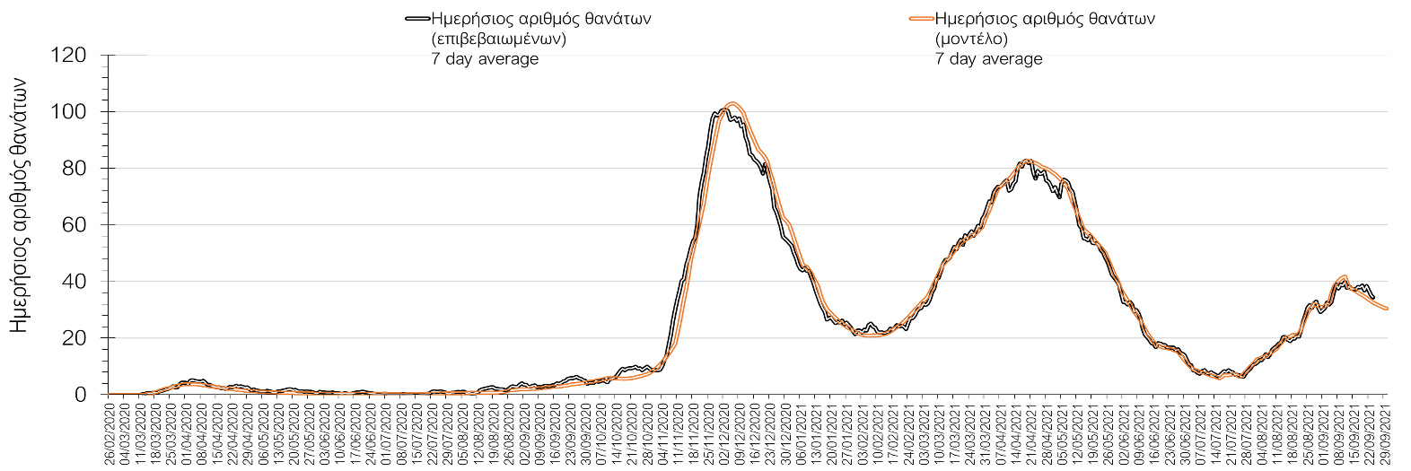 Ο αριθμός ημερήσιων θανάτων (33) που καταγράφηκε είναι μεγαλύτερος σε σχέση με προχθές (31). Όπως είχαμε προβλέψει ο κυλιόμενος εβδομαδιαίος μέσος όρος που είναι 34,4 ακολουθεί πλέον την πορεία του αριθμού των ασθενών σε κρίσιμη κατάσταση.