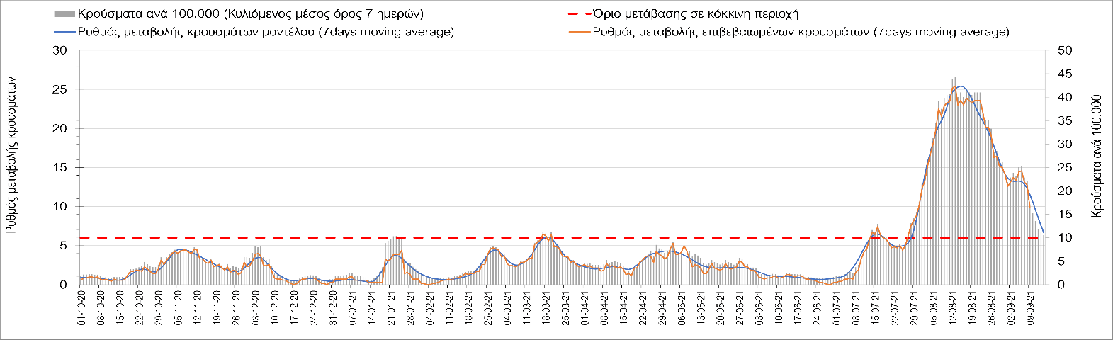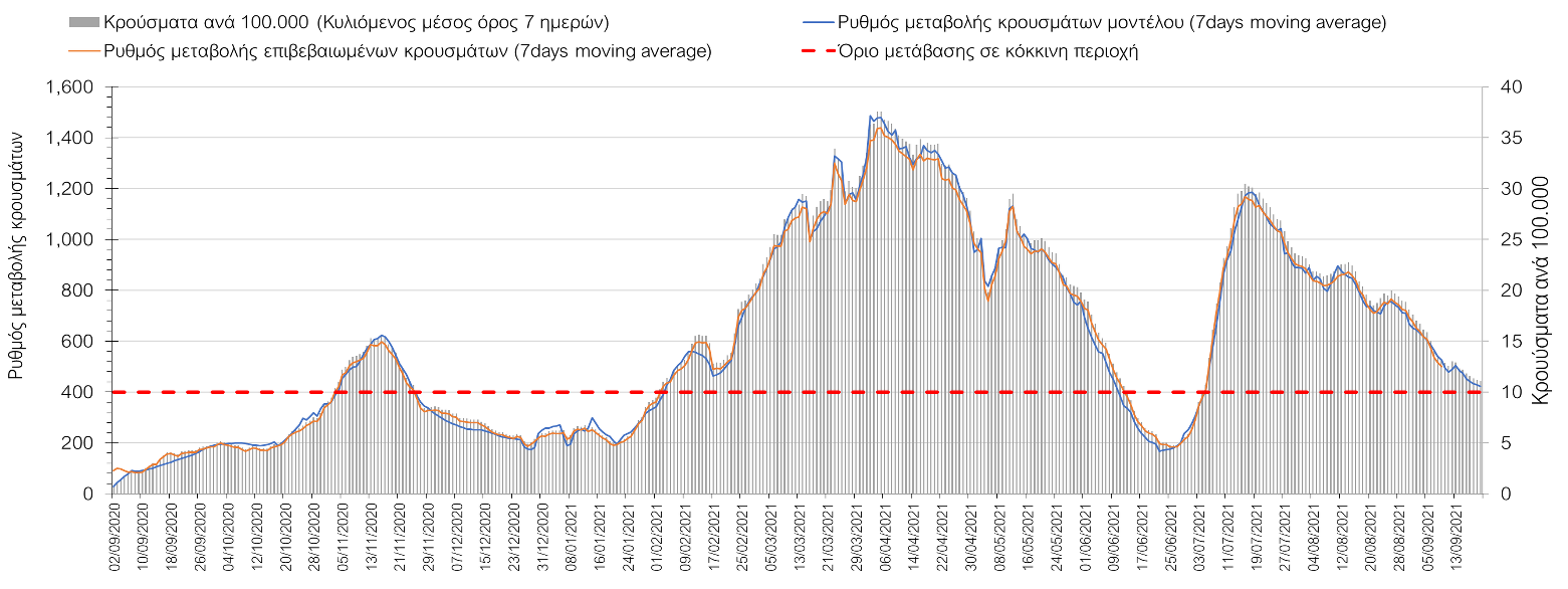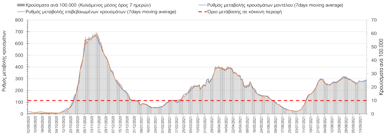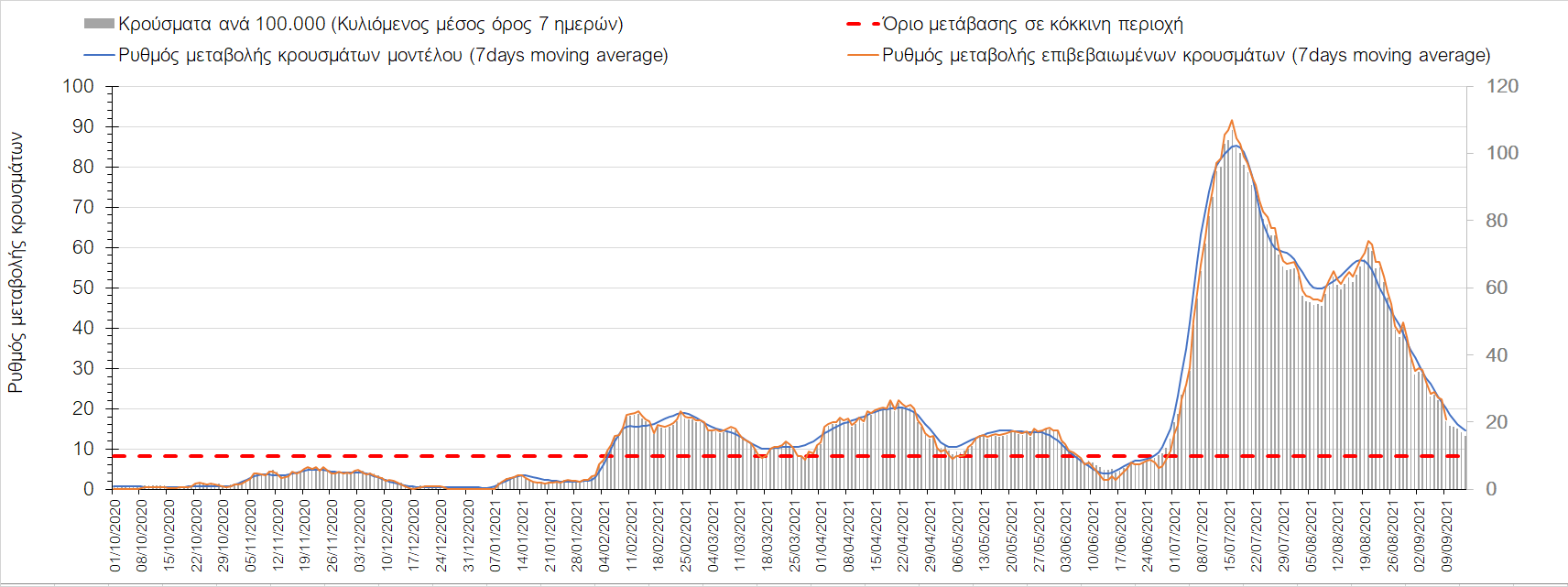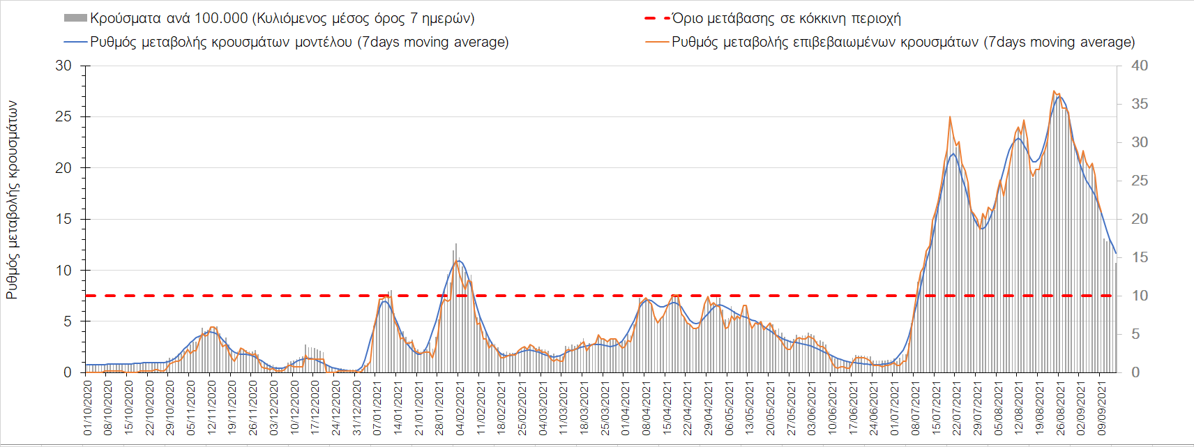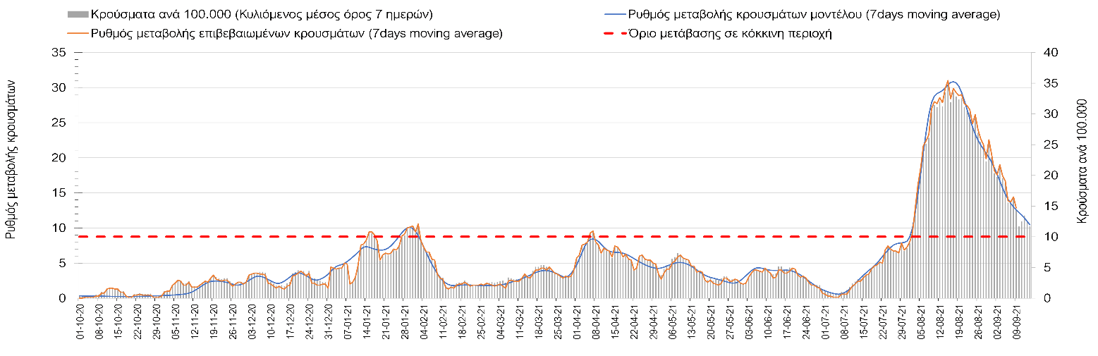 Η πορεία της μέσης εβδομαδιαίας τιμής των κρουσμάτων, καθώς και του κυλιόμενου μέσου όρου 7 ημερών του αριθμού των κρουσμάτων ανά 100.000 πληθυσμού, όπως έχουν καταγραφεί από τον ΕΟΔΥ και η αναμενόμενη πορεία τους όπως προδιαγράφεται από την υπολογιστική πλατφόρμα CORE για την Ελληνική επικράτεια μέχρι τις 15 Σεπτεμβρίου, αποτυπώνονται στο Σχήμα 4.