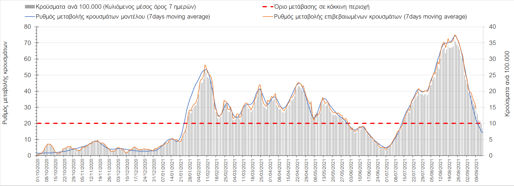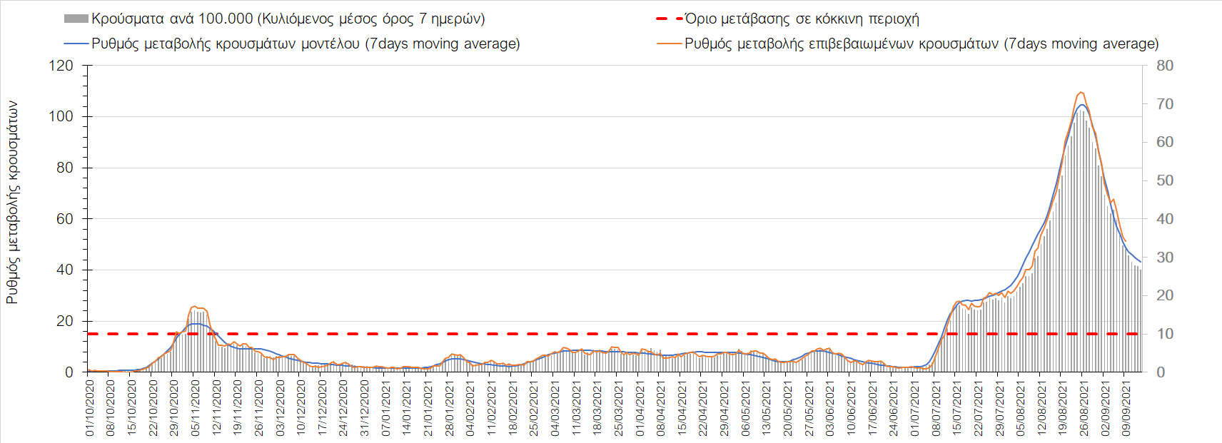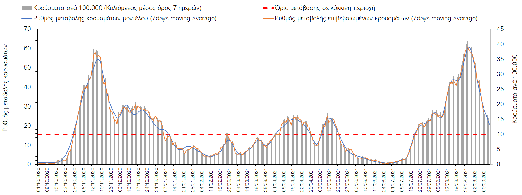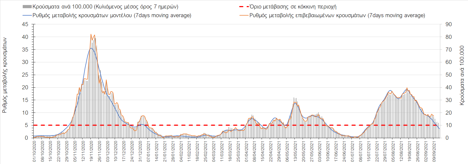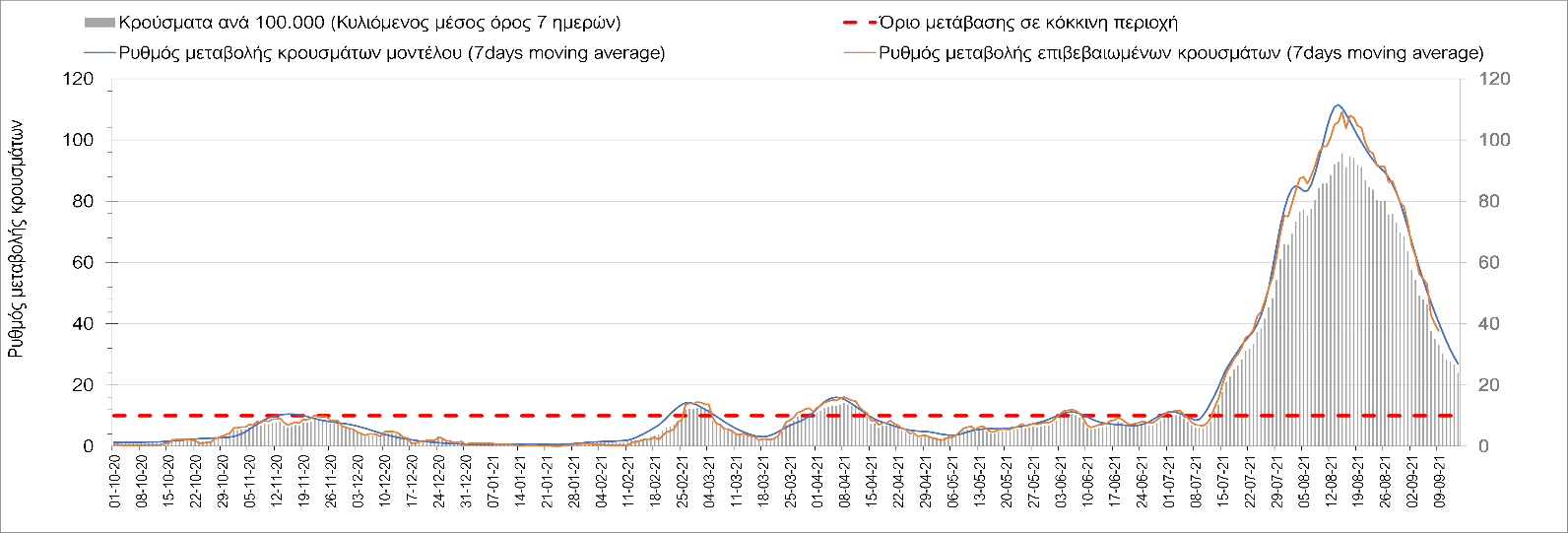 Η πορεία της μέσης εβδομαδιαίας τιμής των κρουσμάτων, καθώς και του κυλιόμενου μέσου όρου 7 ημερών του αριθμού των κρουσμάτων ανά 100.000 πληθυσμού, όπως έχουν καταγραφεί από τον ΕΟΔΥ και η αναμενόμενη πορεία τους όπως προδιαγράφεται από την υπολογιστική πλατφόρμα CORE για την Ελληνική επικράτεια μέχρι τις 15 Σεπτεμβρίου, αποτυπώνονται στο Σχήμα 4.