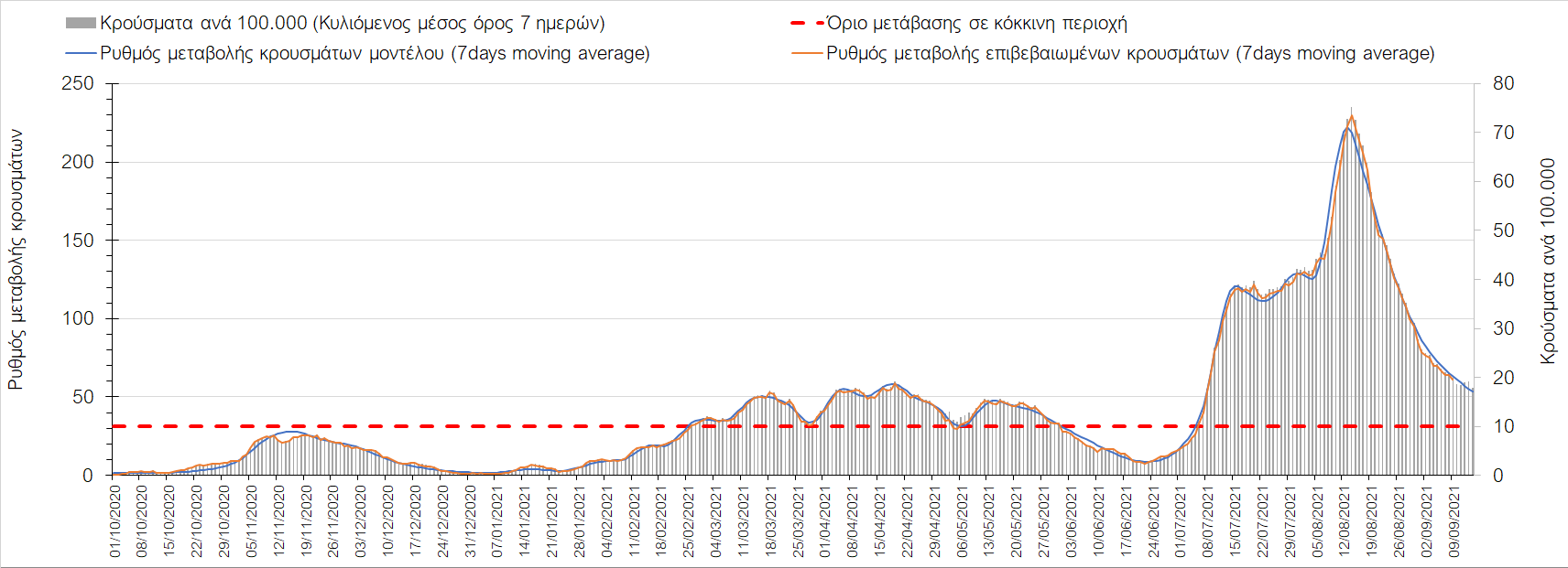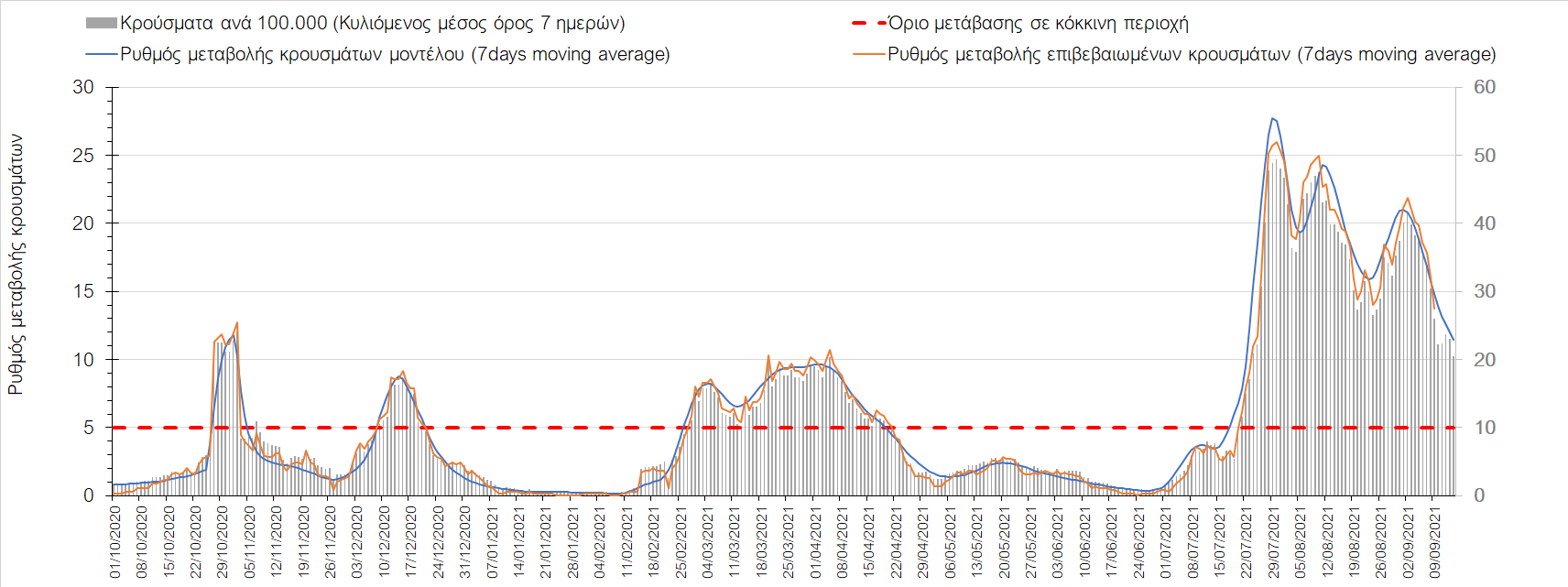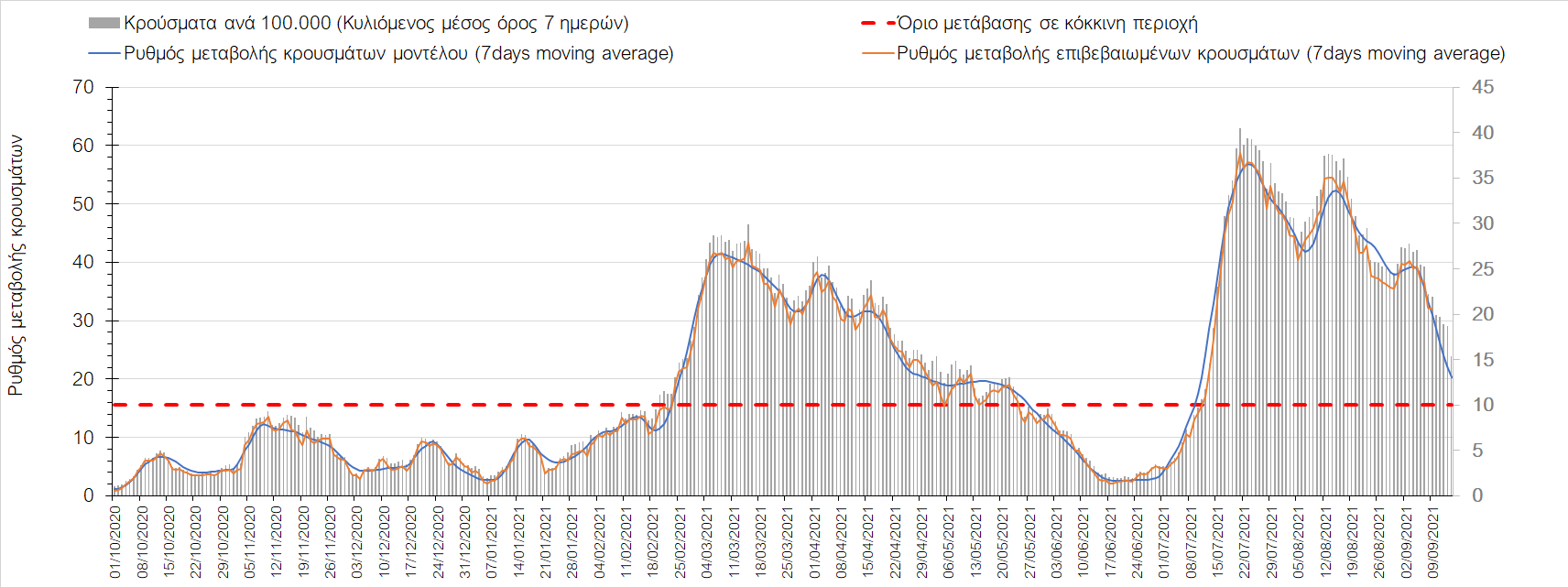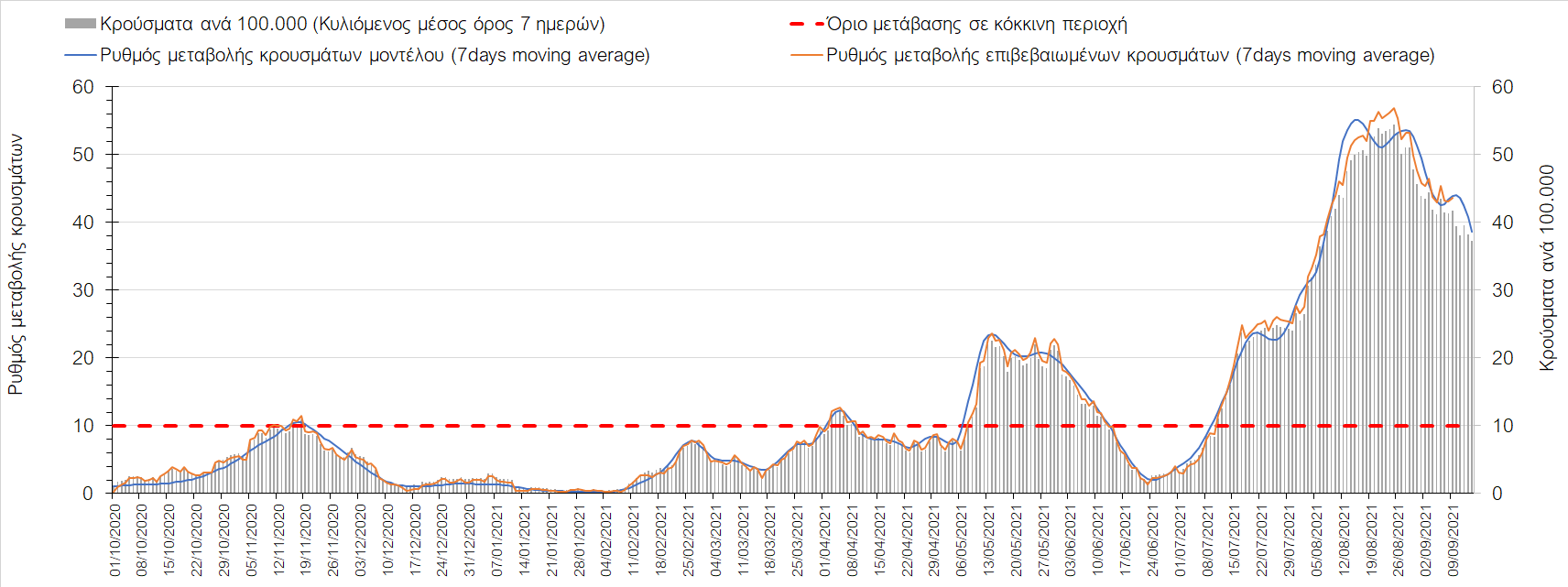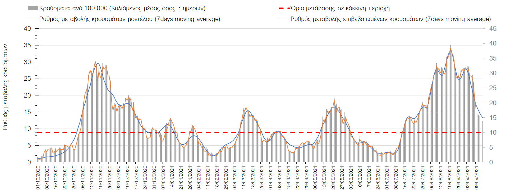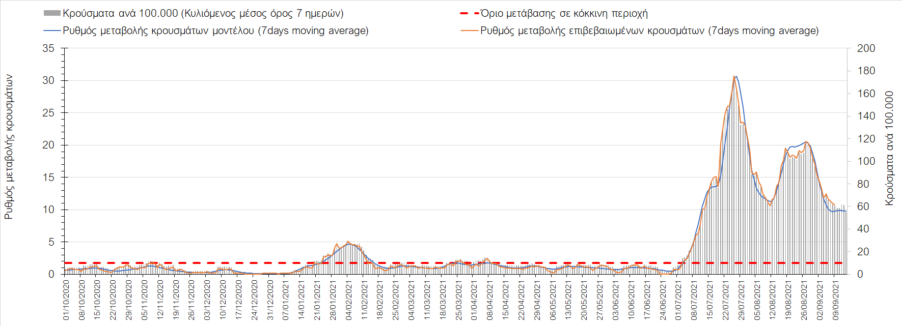 Η πορεία της μέσης εβδομαδιαίας τιμής των κρουσμάτων, καθώς και του κυλιόμενου μέσου όρου 7 ημερών του αριθμού των κρουσμάτων ανά 100.000 πληθυσμού, όπως έχουν καταγραφεί από τον ΕΟΔΥ και η αναμενόμενη πορεία τους όπως προδιαγράφεται από την υπολογιστική πλατφόρμα CORE για την Ελληνική επικράτεια μέχρι τις 15 Σεπτεμβρίου, αποτυπώνονται στο Σχήμα 4.