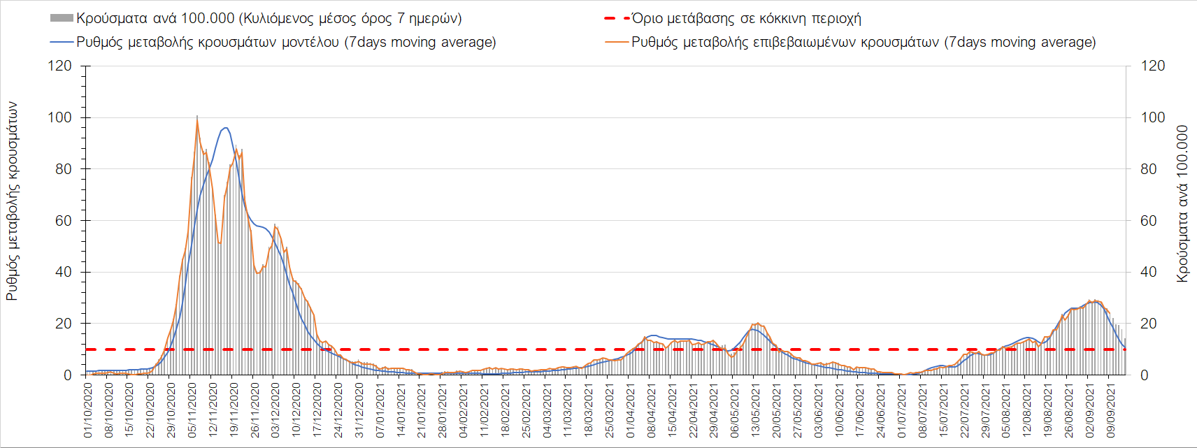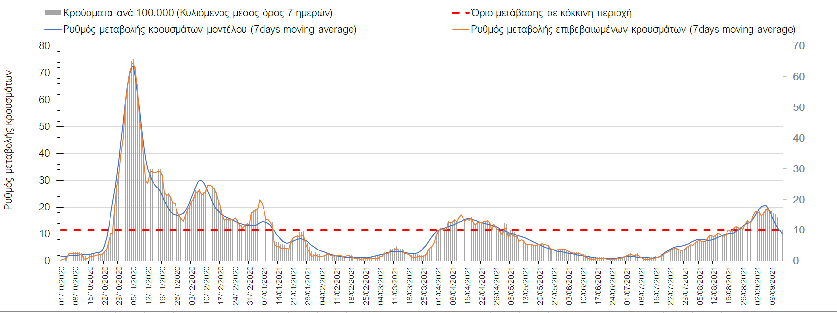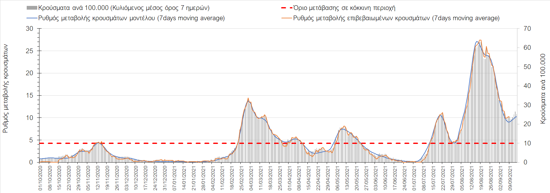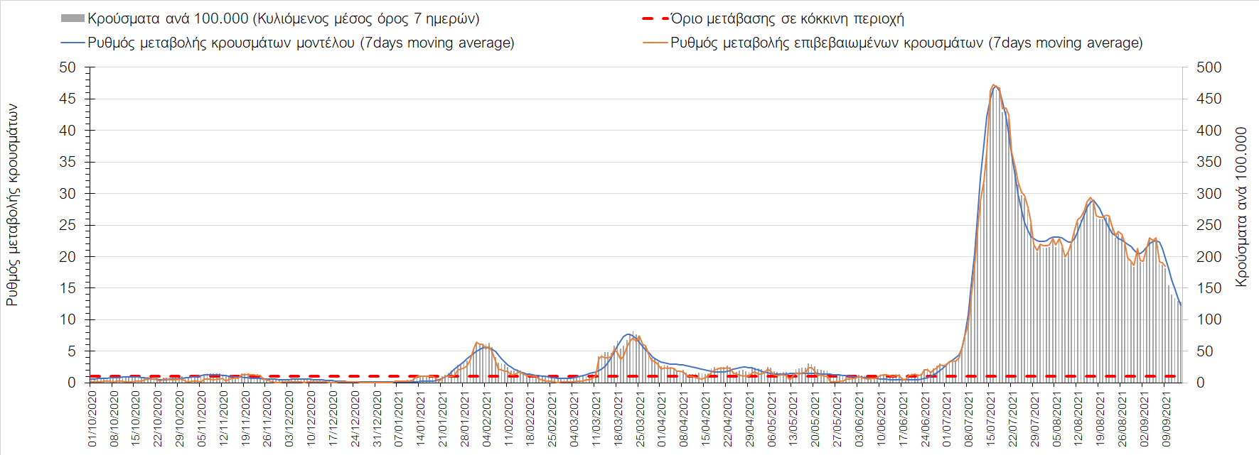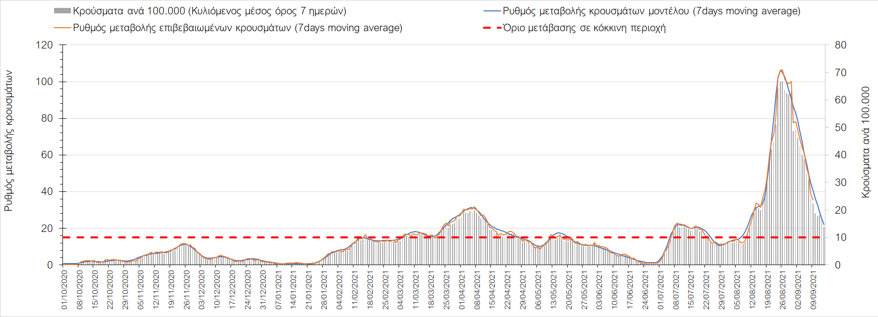 Η πορεία της μέσης εβδομαδιαίας τιμής των κρουσμάτων, καθώς και του κυλιόμενου μέσου όρου 7 ημερών του αριθμού των κρουσμάτων ανά 100.000 πληθυσμού, όπως έχουν καταγραφεί από τον ΕΟΔΥ και η αναμενόμενη πορεία τους όπως προδιαγράφεται από την υπολογιστική πλατφόρμα CORE για την Ελληνική επικράτεια μέχρι τις 15 Σεπτεμβρίου, αποτυπώνονται στο Σχήμα 4.