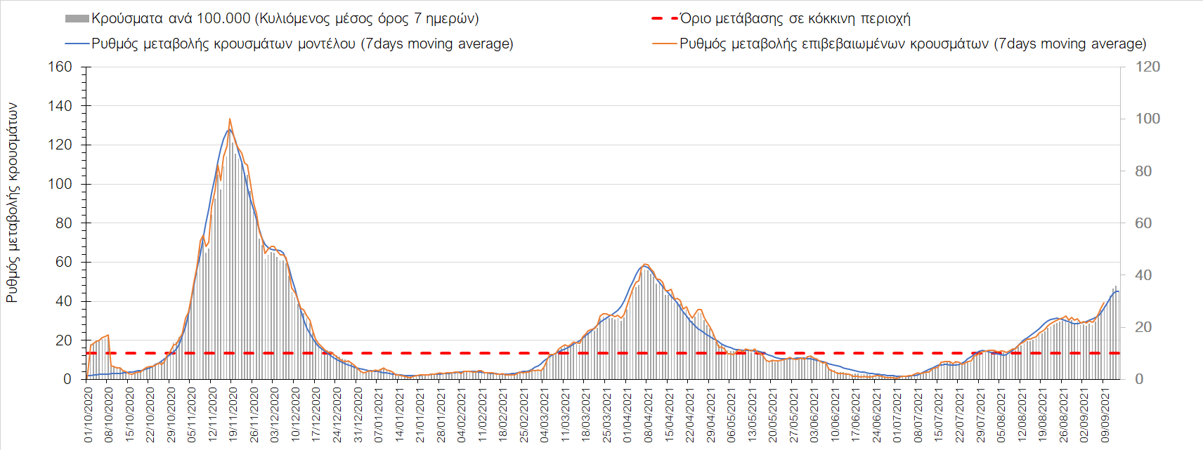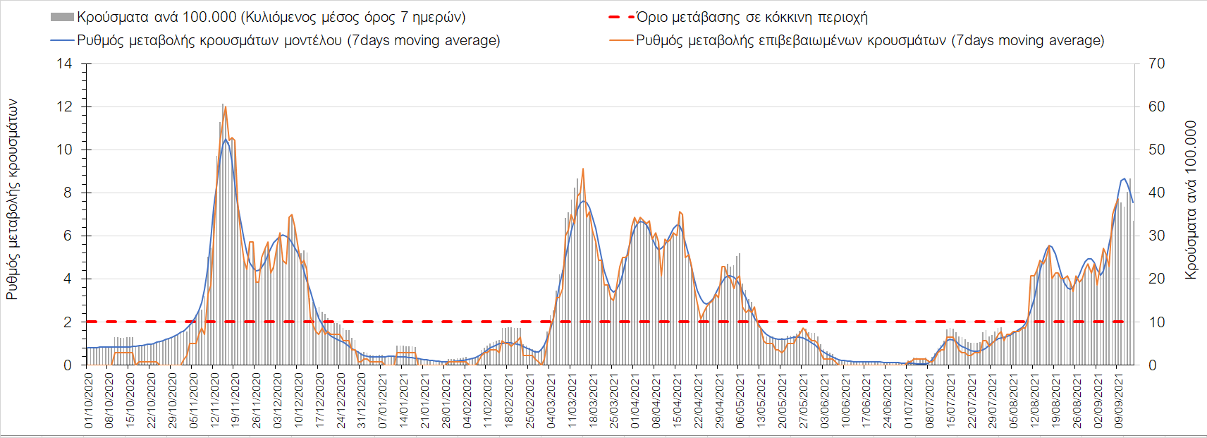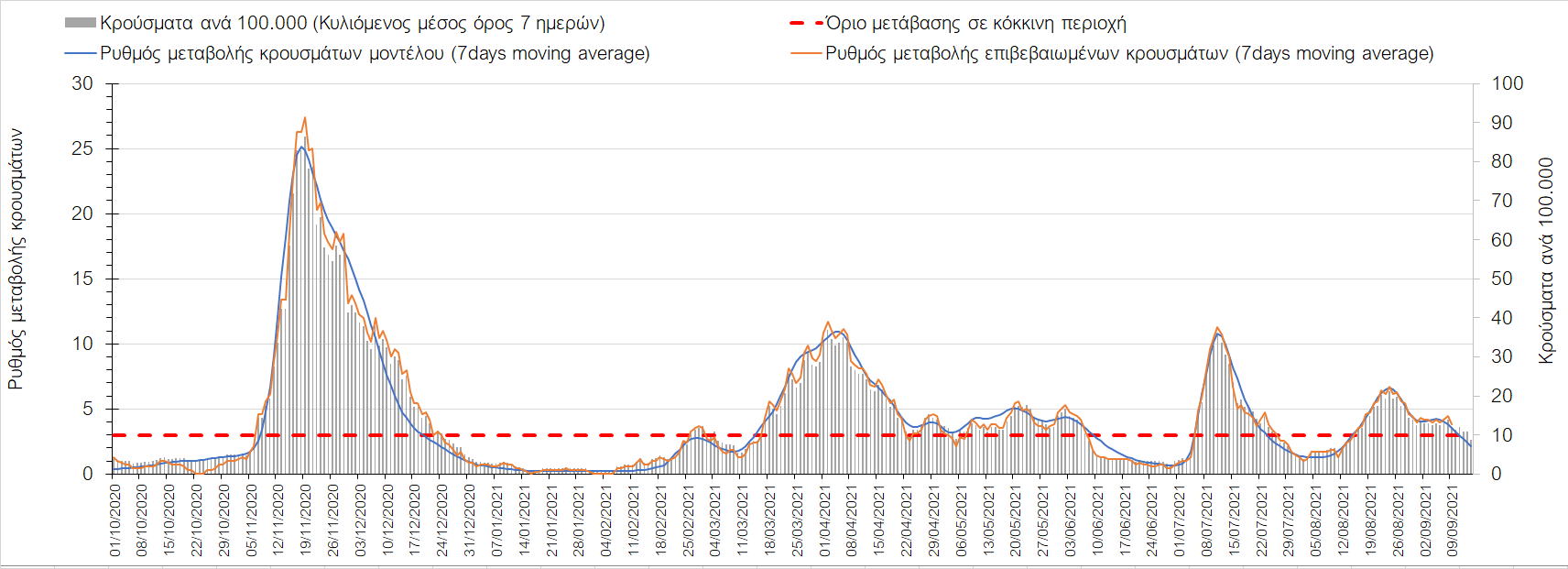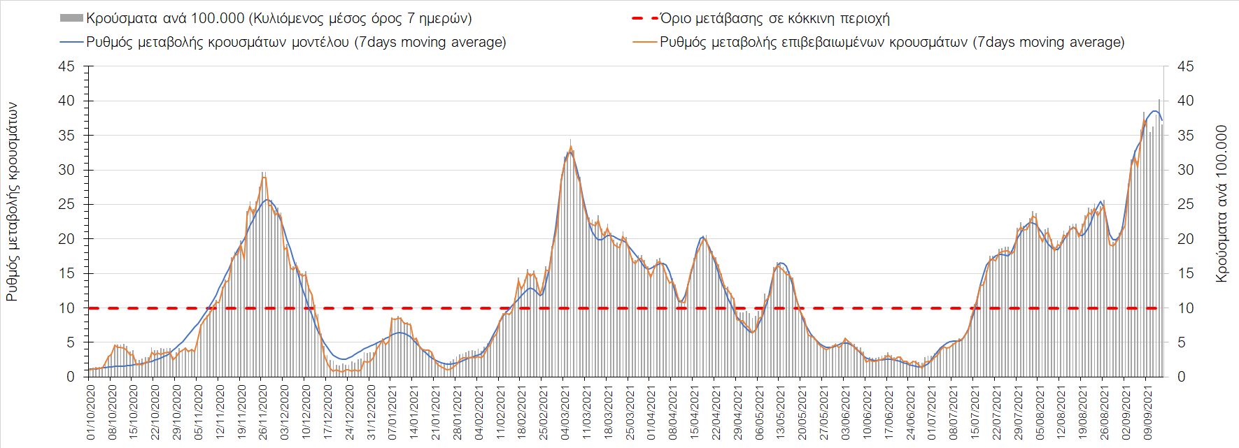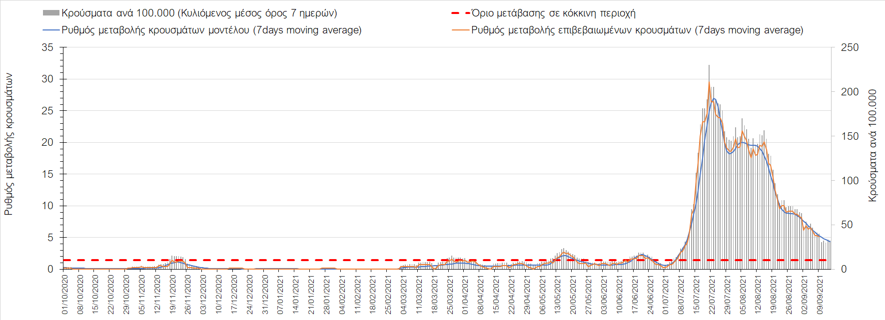 Η πορεία της μέσης εβδομαδιαίας τιμής των κρουσμάτων, καθώς και του κυλιόμενου μέσου όρου 7 ημερών του αριθμού των κρουσμάτων ανά 100.000 πληθυσμού, όπως έχουν καταγραφεί από τον ΕΟΔΥ και η αναμενόμενη πορεία τους όπως προδιαγράφεται από την υπολογιστική πλατφόρμα CORE για την Ελληνική επικράτεια μέχρι τις 15 Σεπτεμβρίου, αποτυπώνονται στο Σχήμα 4.