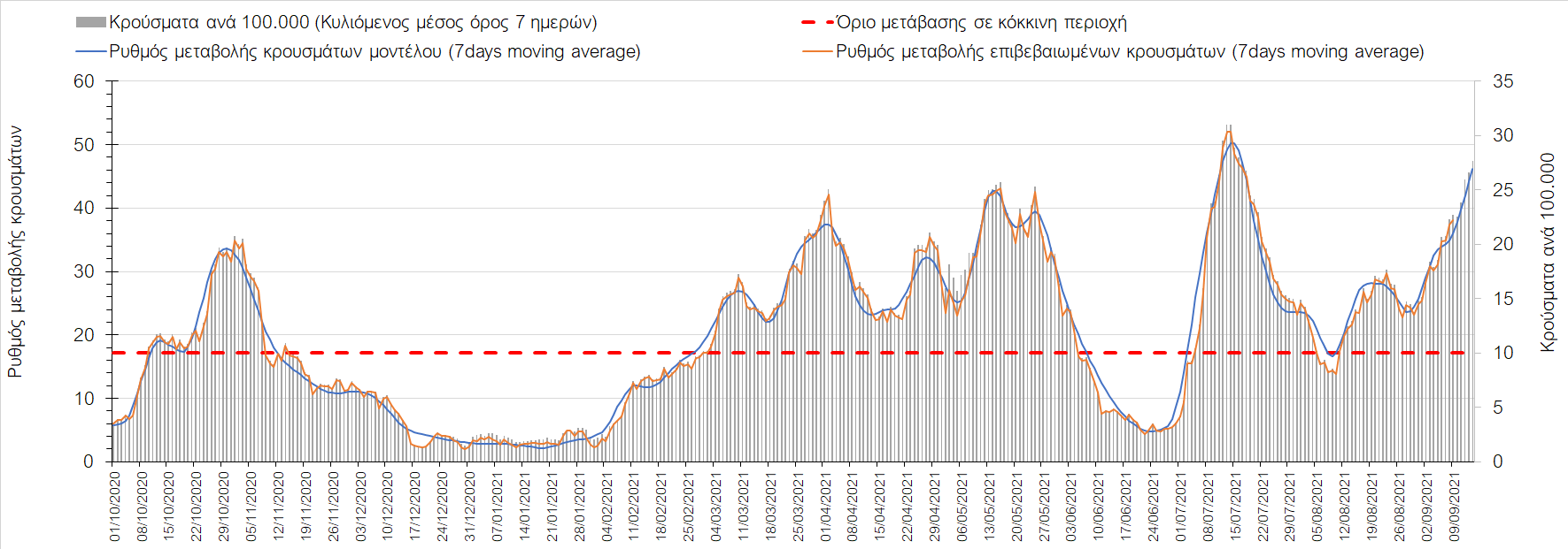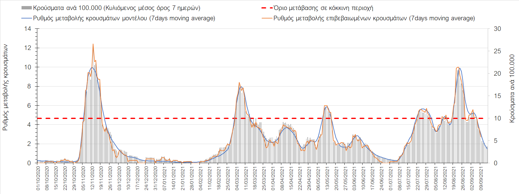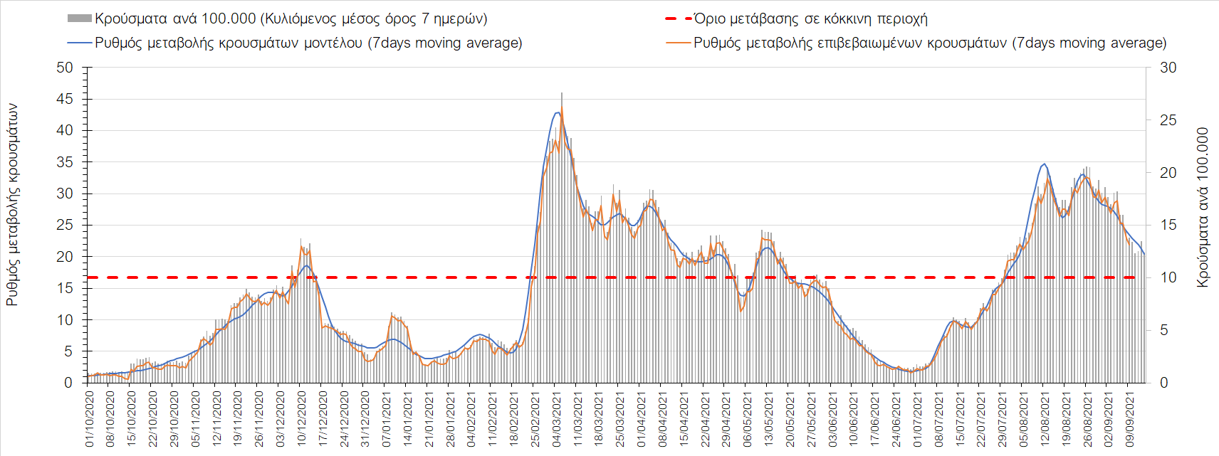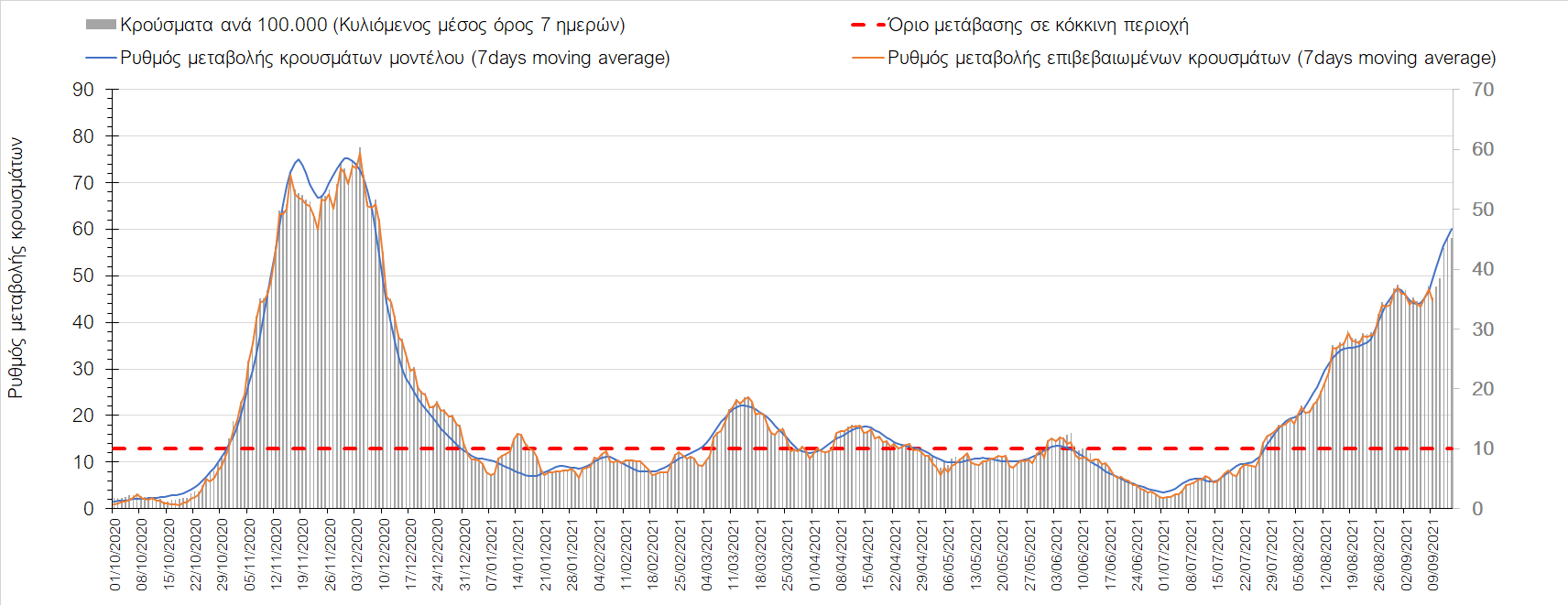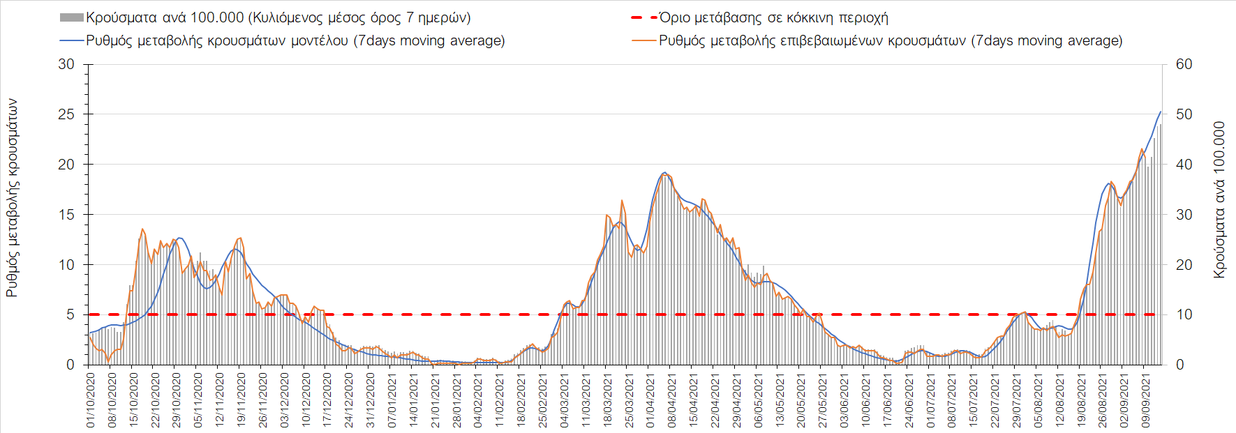 Η πορεία της μέσης εβδομαδιαίας τιμής των κρουσμάτων, καθώς και του κυλιόμενου μέσου όρου 7 ημερών του αριθμού των κρουσμάτων ανά 100.000 πληθυσμού, όπως έχουν καταγραφεί από τον ΕΟΔΥ και η αναμενόμενη πορεία τους όπως προδιαγράφεται από την υπολογιστική πλατφόρμα CORE για την Ελληνική επικράτεια μέχρι τις 15 Σεπτεμβρίου, αποτυπώνονται στο Σχήμα 4.