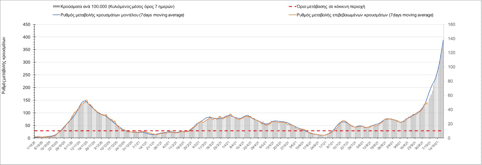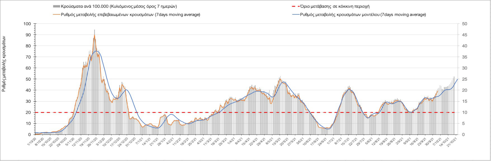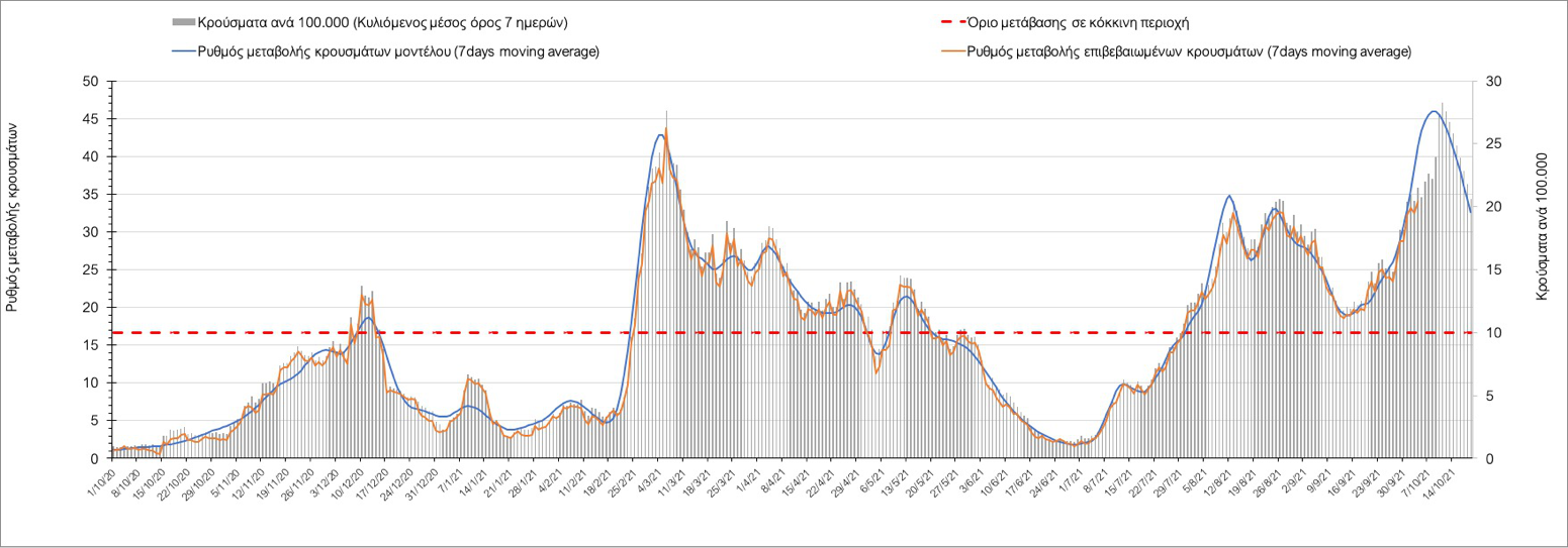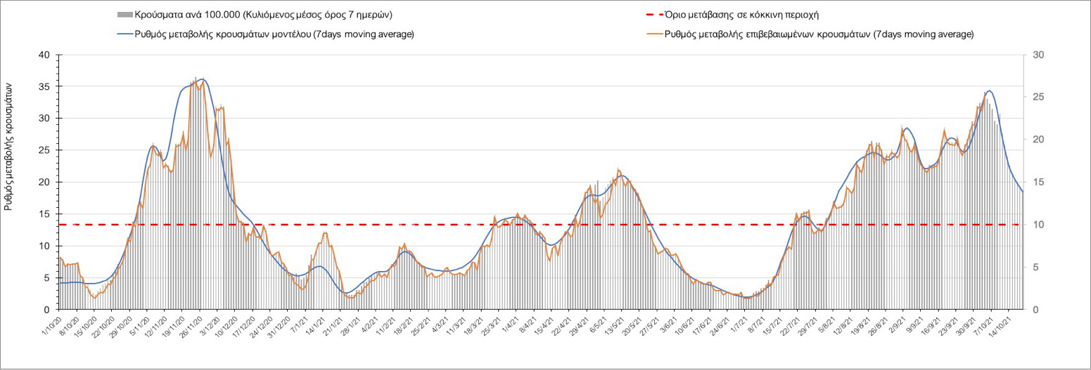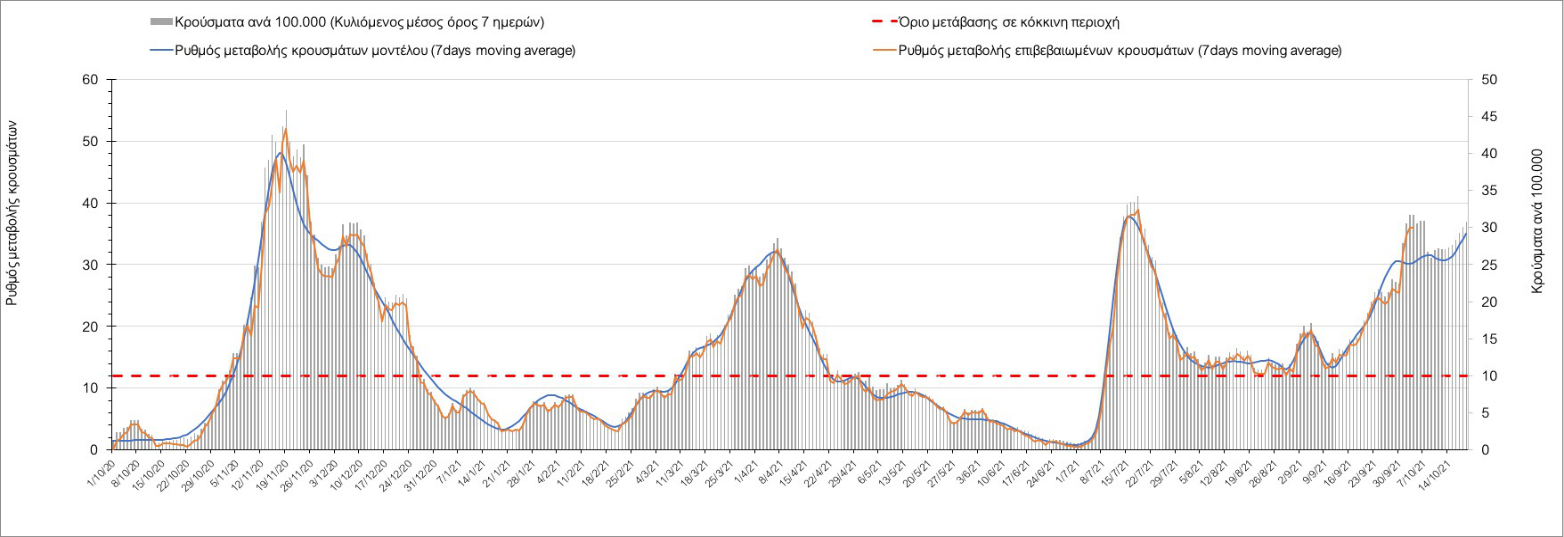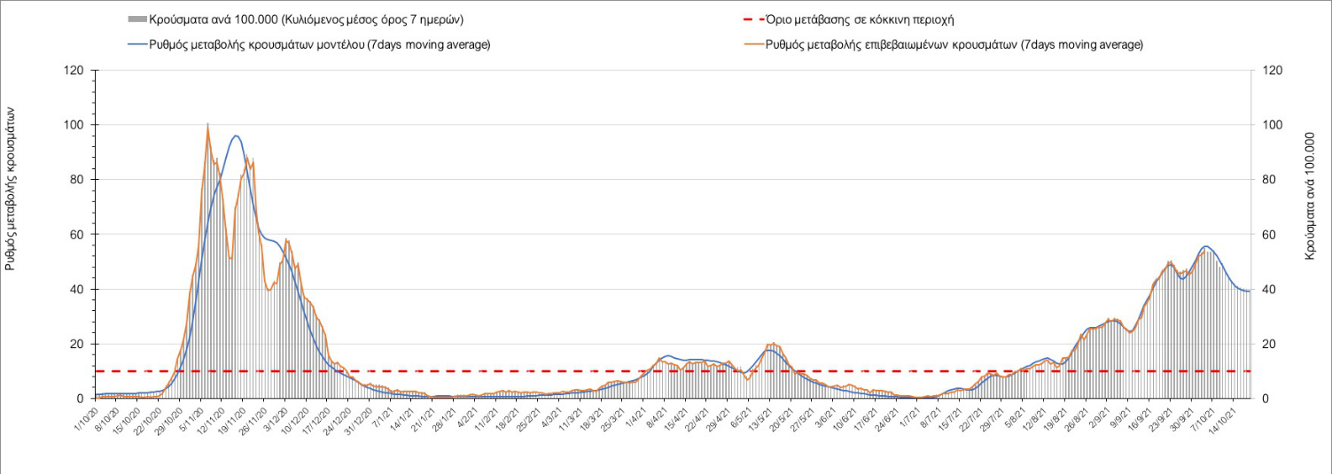 Η πορεία της μέσης εβδομαδιαίας τιμής των κρουσμάτων, καθώς και του κυλιόμενου μέσου όρου 7 ημερών του αριθμού των κρουσμάτων ανά 100.000 πληθυσμού, όπως έχουν καταγραφεί από τον ΕΟΔΥ και η αναμενόμενη πορεία τους όπως προδιαγράφεται από την υπολογιστική πλατφόρμα CORE για την Ελληνική επικράτεια μέχρι τις 20 Οκτωβρίου, αποτυπώνονται στο Σχήμα 4.