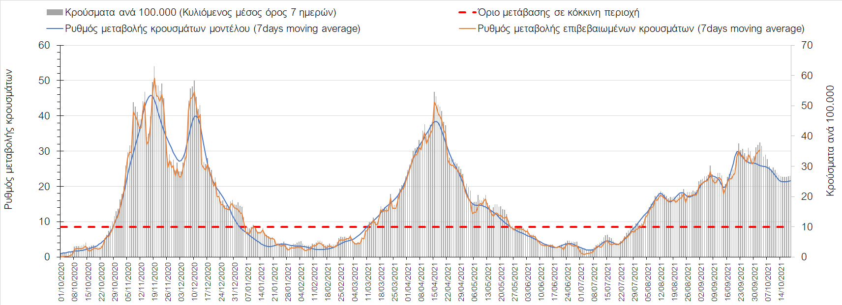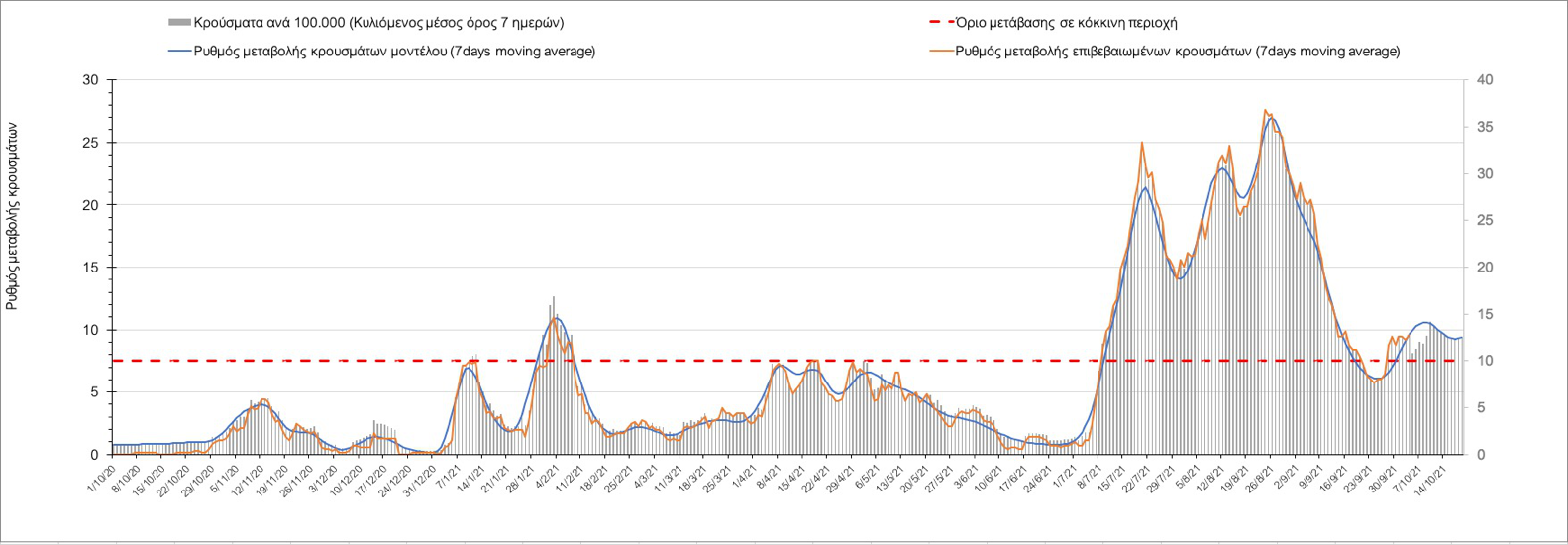 Σε πανελλαδικό επίπεδο ο κυλιόμενος εβδομαδιαίος μέσος όρος του δείκτη θετικότητας διαμορφώθηκε στο 1,4% (η ημερήσια τιμή είναι 2,9 %) ενώ ο κυλιόμενος εβδομαδιαίος μέσος όρος του πραγματικού αριθμού αναπαραγωγής Rt (δηλαδή ο αριθμός των ατόμων που ένας φορέας μπορεί να επιμολύνει) παρέμεινε στο 1,01 (Rt πάνω από τη μονάδα υποδηλώνει καθαρή αύξηση της διασποράς του ιού στην κοινότητα).