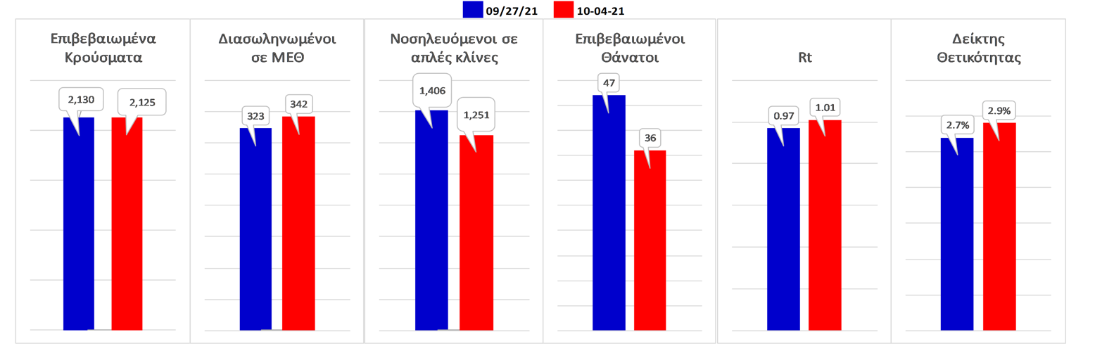 Σχήμα 58. Συγκριτικά αποτελέσματα της επιδημιολογικής εικόνας της σημερινής Δευτέρας (04/10/2021) σε σχέση με το προηγούμενο (27/09/2021)