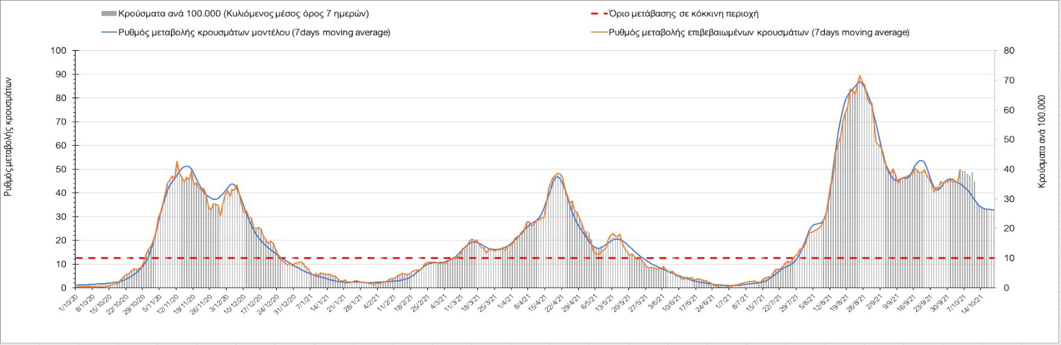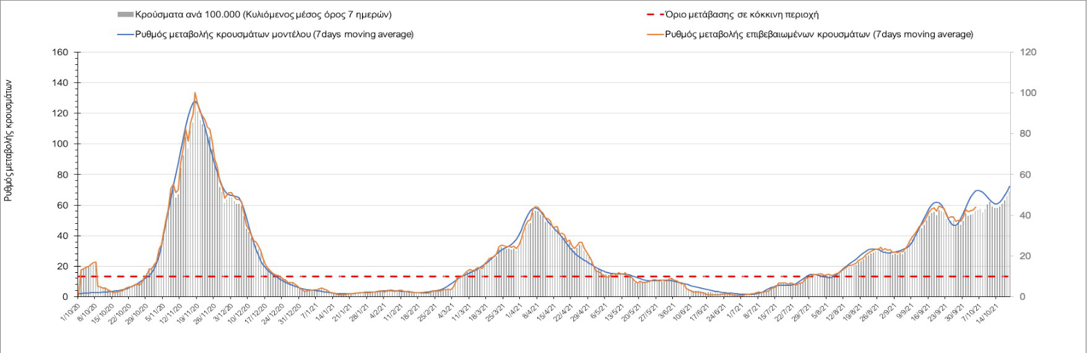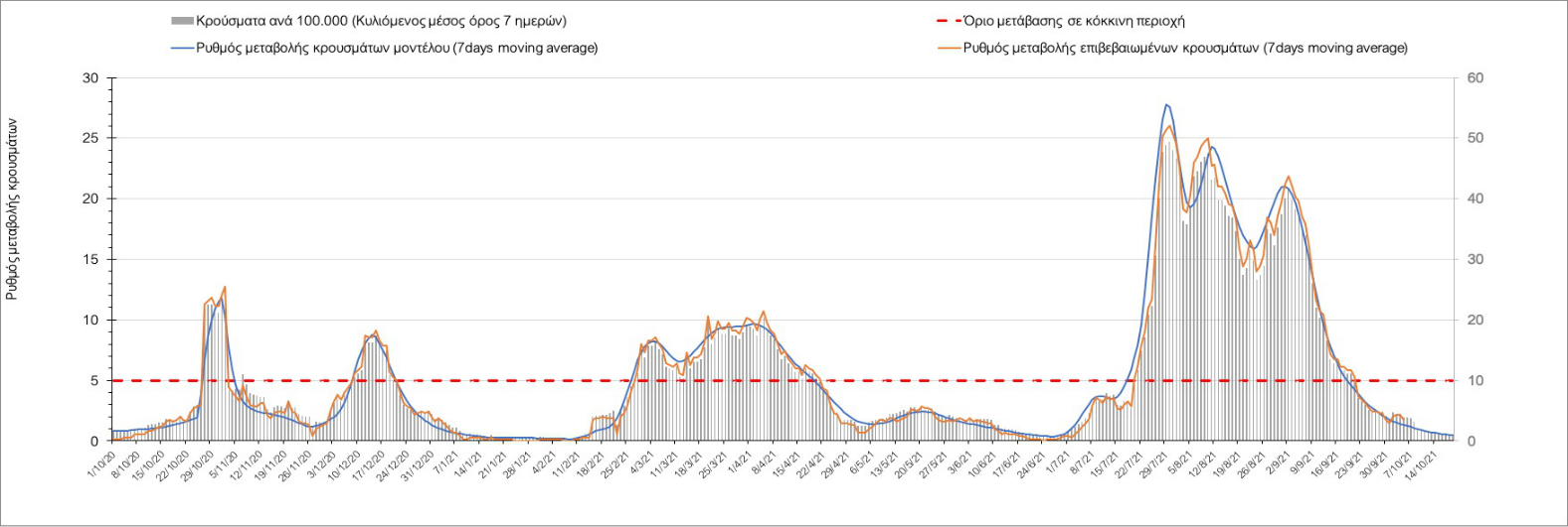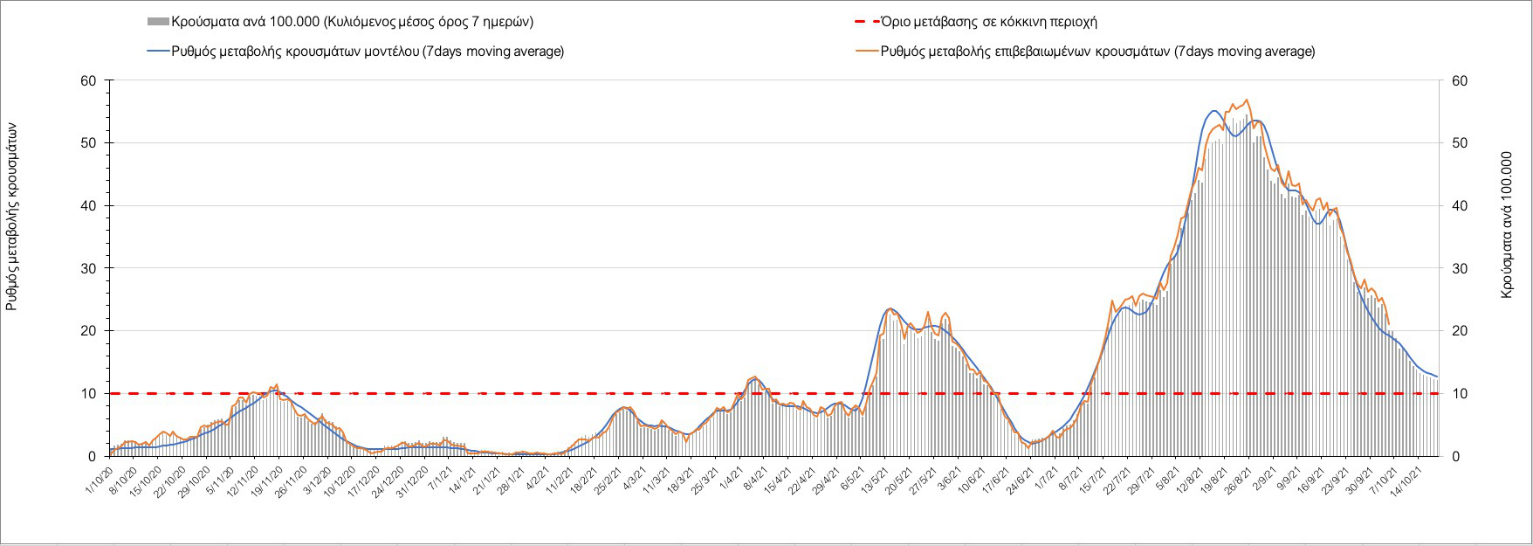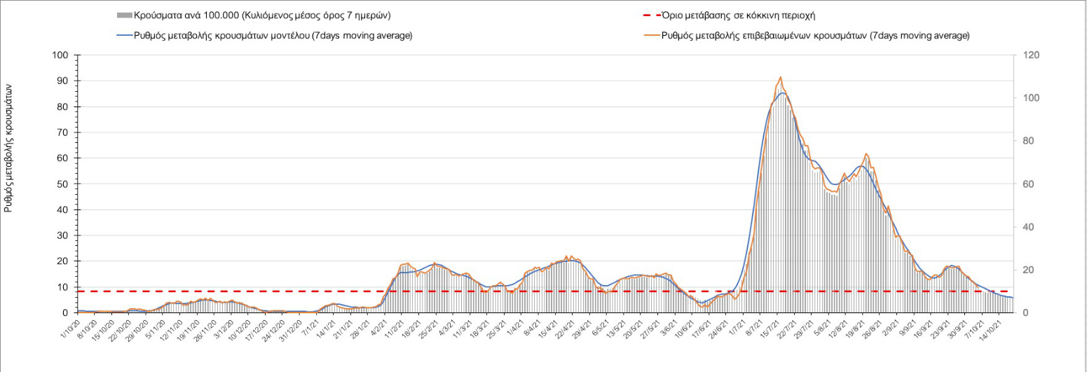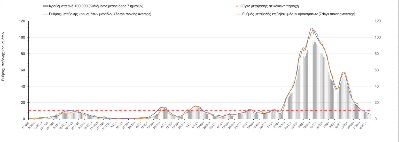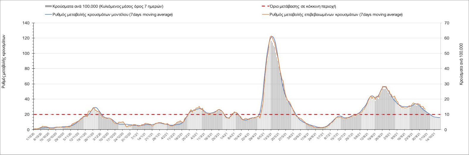 Η πορεία της μέσης εβδομαδιαίας τιμής των κρουσμάτων, καθώς και του κυλιόμενου μέσου όρου 7 ημερών του αριθμού των κρουσμάτων ανά 100.000 πληθυσμού, όπως έχουν καταγραφεί από τον ΕΟΔΥ και η αναμενόμενη πορεία τους όπως προδιαγράφεται από την υπολογιστική πλατφόρμα CORE για την Ελληνική επικράτεια μέχρι τις 20 Οκτωβρίου, αποτυπώνονται στο Σχήμα 4.