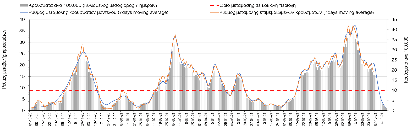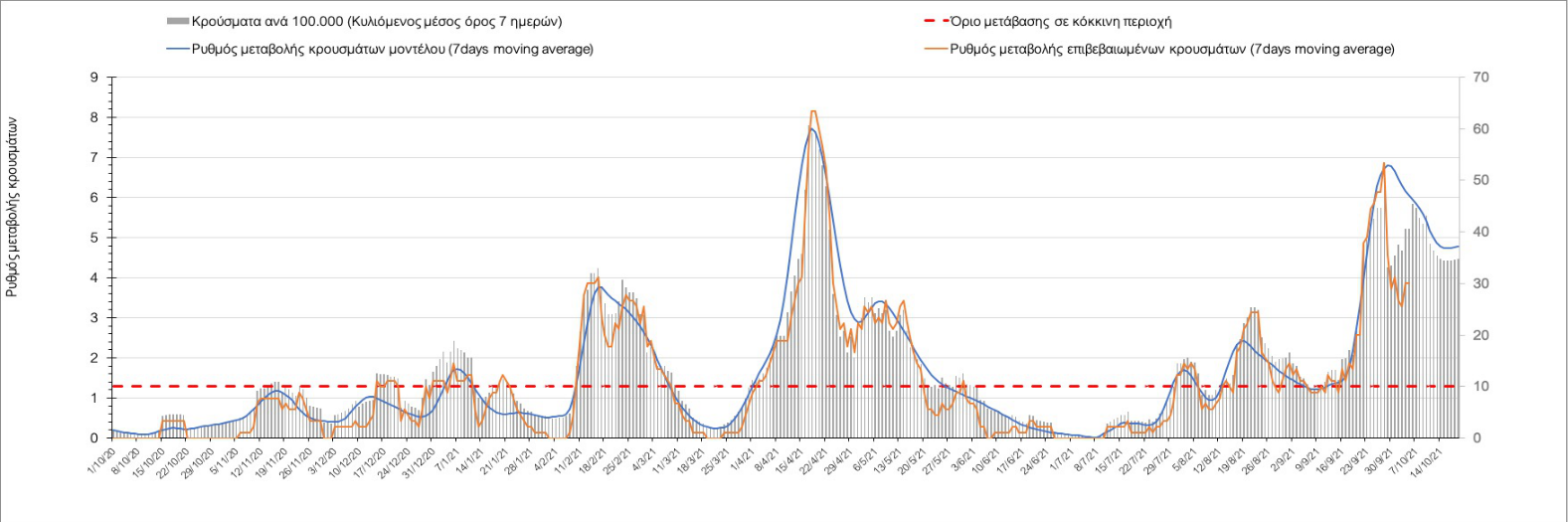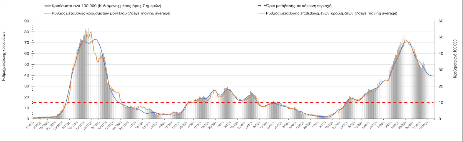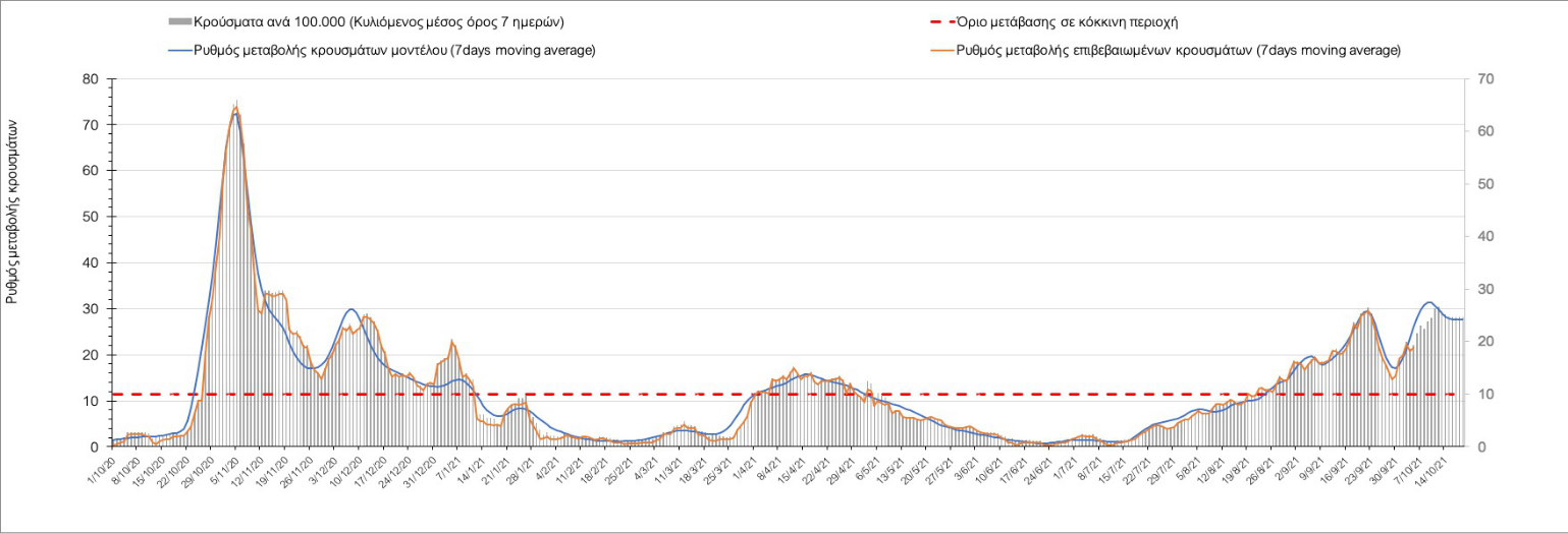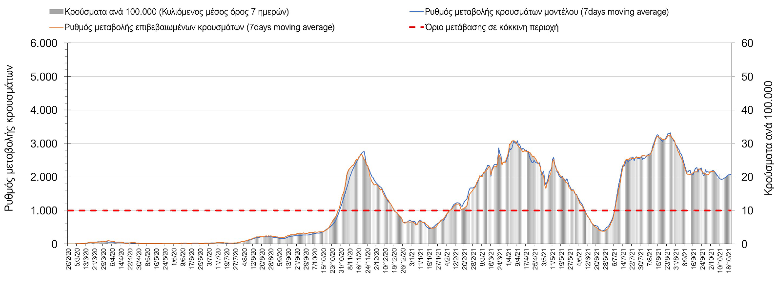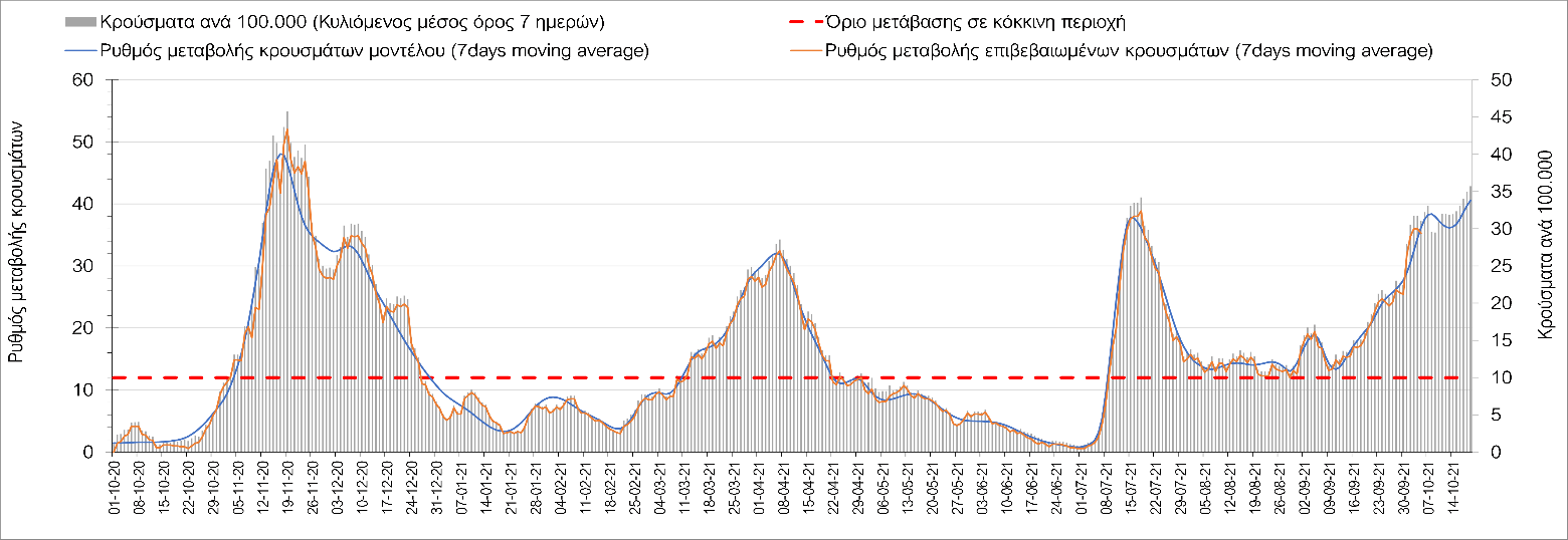 Η πορεία της μέσης εβδομαδιαίας τιμής των κρουσμάτων, καθώς και του κυλιόμενου μέσου όρου 7 ημερών του αριθμού των κρουσμάτων ανά 100.000 πληθυσμού, όπως έχουν καταγραφεί από τον ΕΟΔΥ και η αναμενόμενη πορεία τους όπως προδιαγράφεται από την υπολογιστική πλατφόρμα CORE για την Ελληνική επικράτεια μέχρι τις 20 Οκτωβρίου, αποτυπώνονται στο Σχήμα 4.