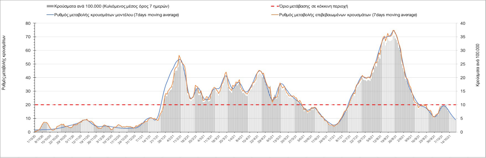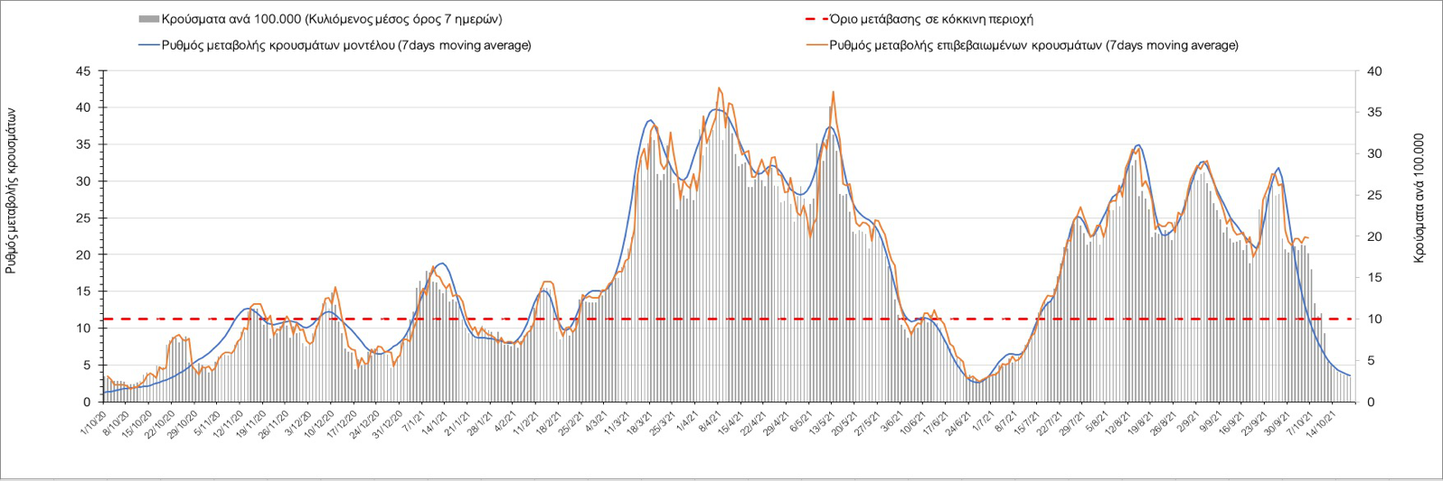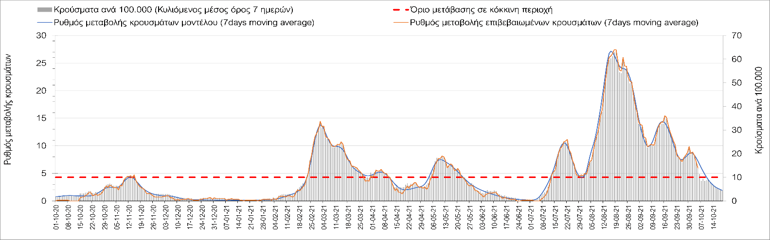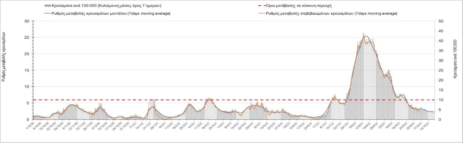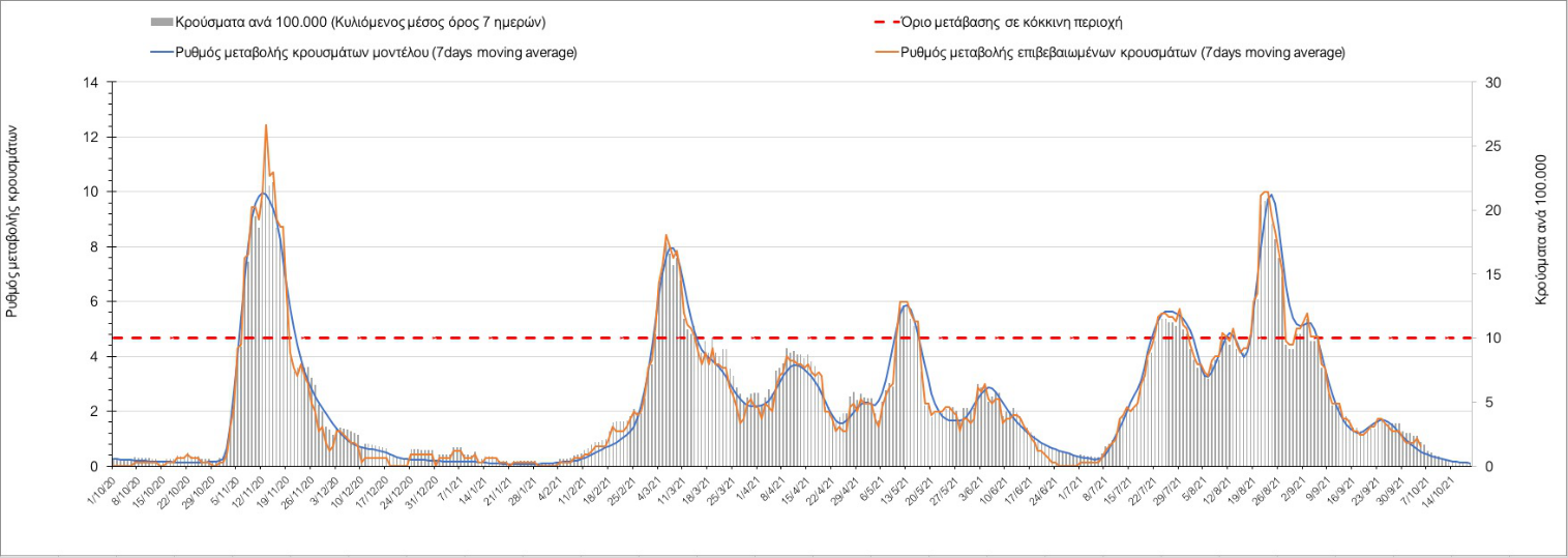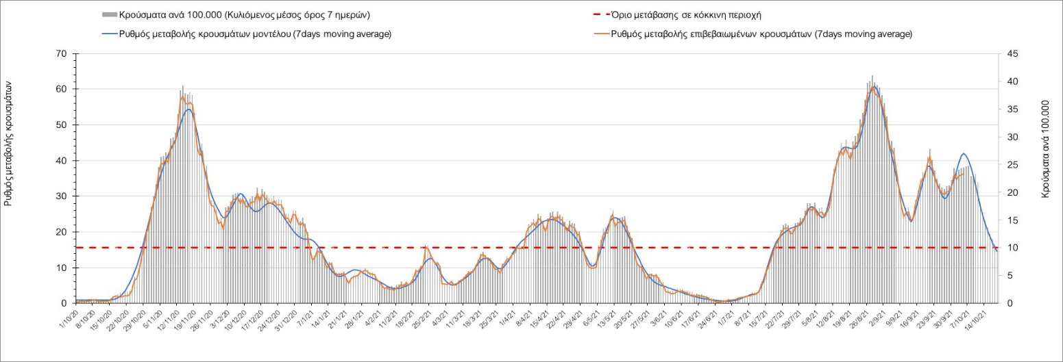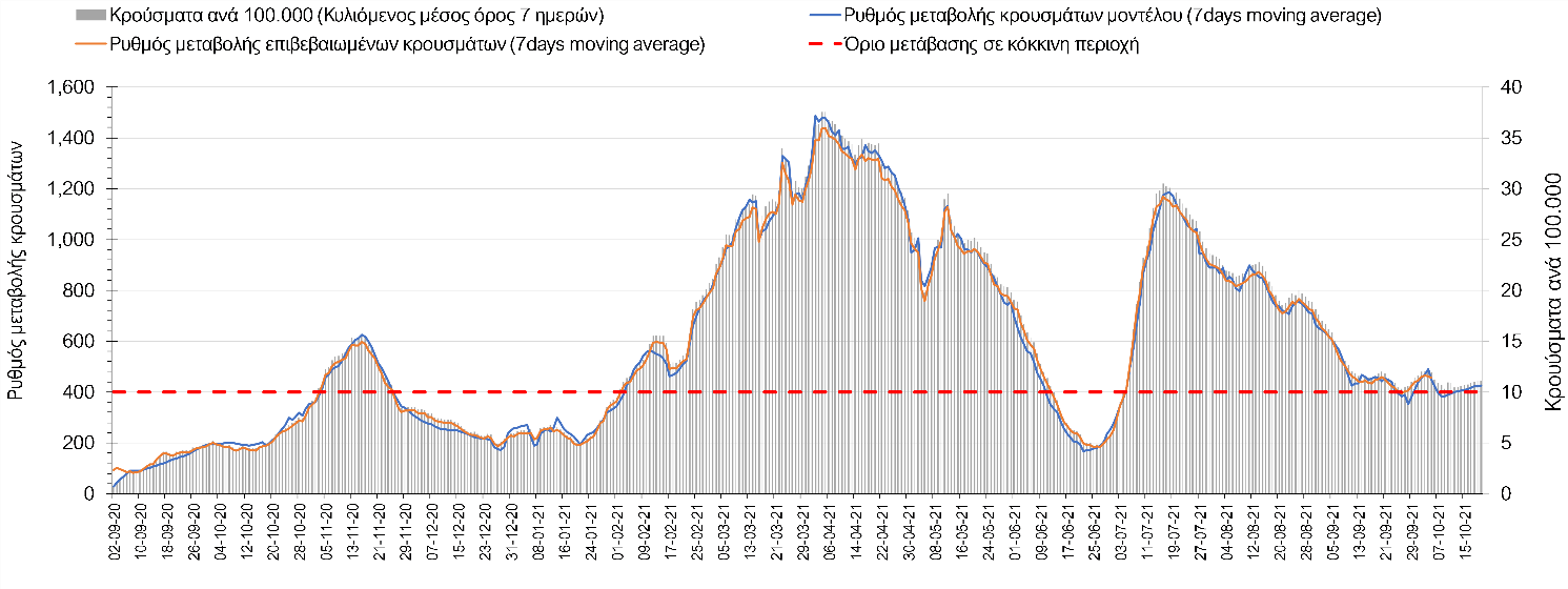 Η πορεία της μέσης εβδομαδιαίας τιμής των κρουσμάτων, καθώς και του κυλιόμενου μέσου όρου 7 ημερών του αριθμού των κρουσμάτων ανά 100.000 πληθυσμού, όπως έχουν καταγραφεί από τον ΕΟΔΥ και η αναμενόμενη πορεία τους όπως προδιαγράφεται από την υπολογιστική πλατφόρμα CORE για την Ελληνική επικράτεια μέχρι τις 20 Οκτωβρίου, αποτυπώνονται στο Σχήμα 4.