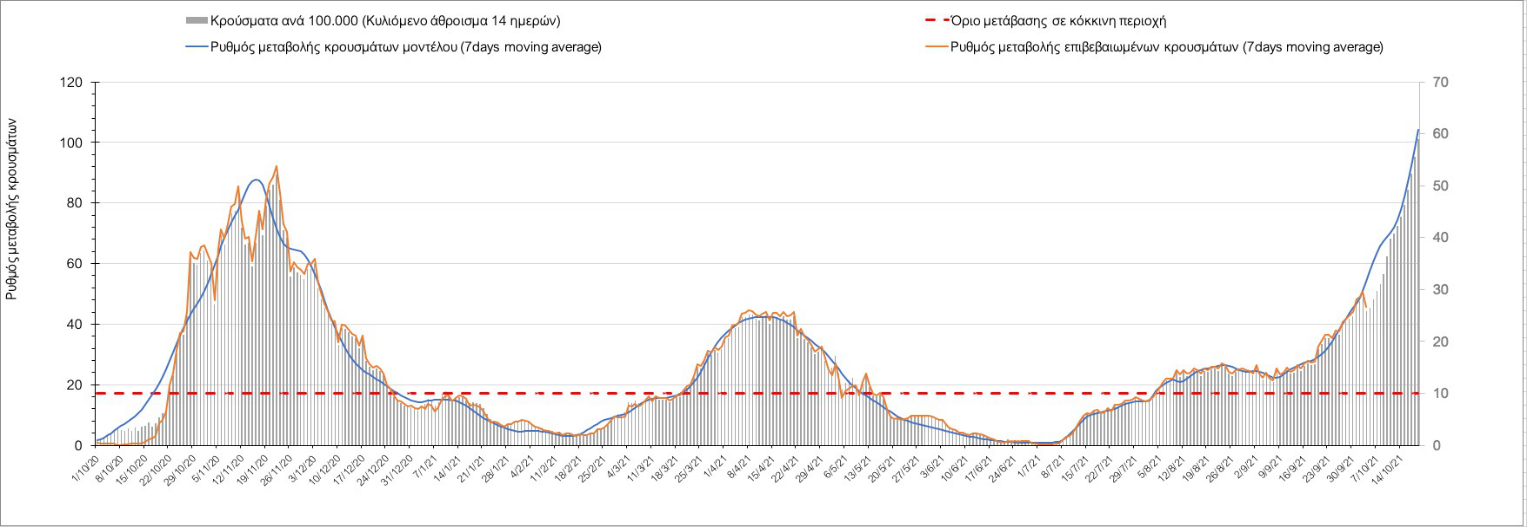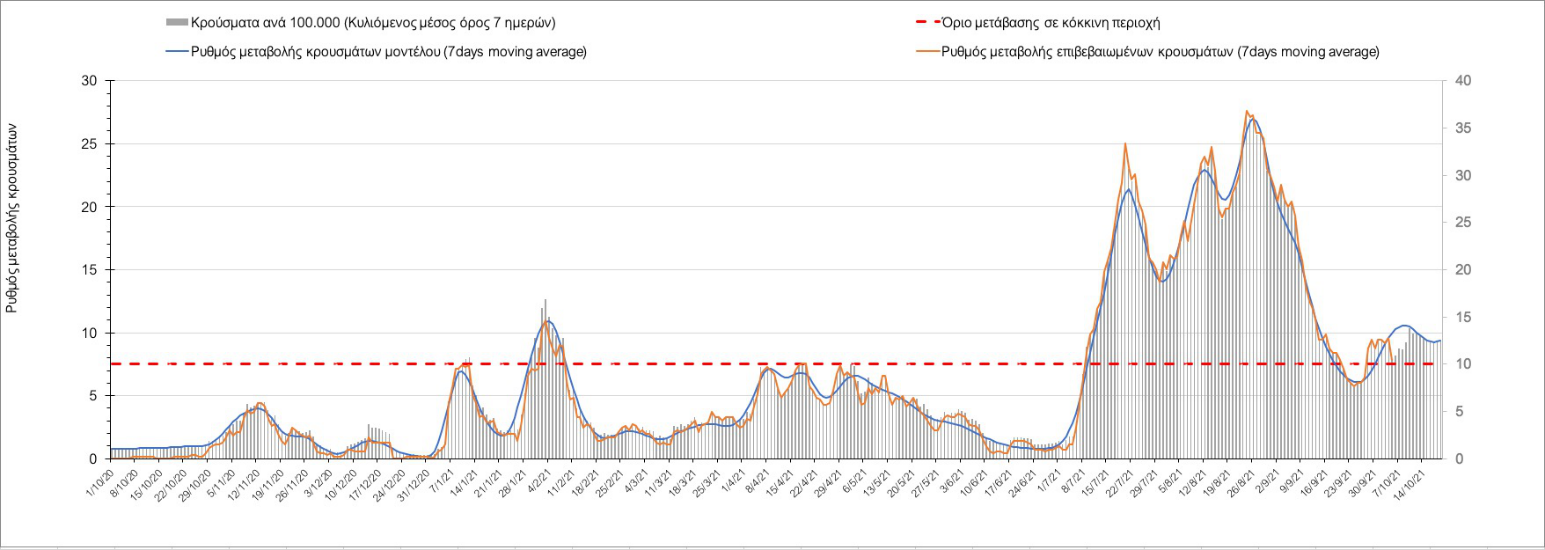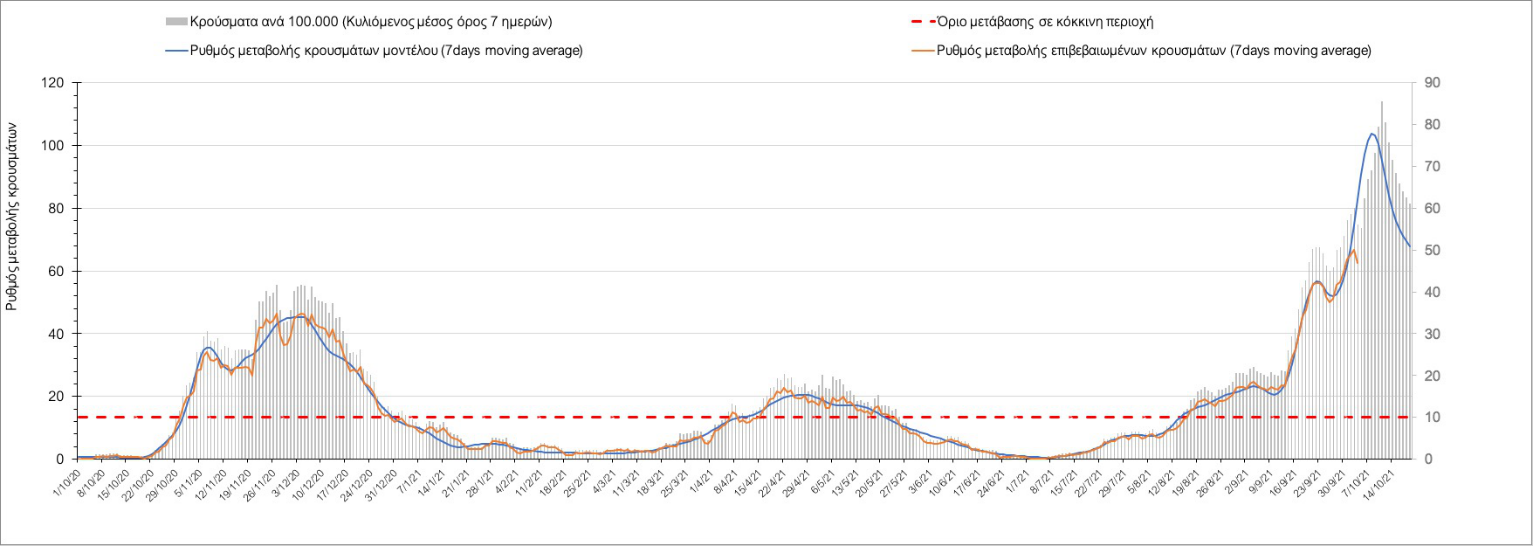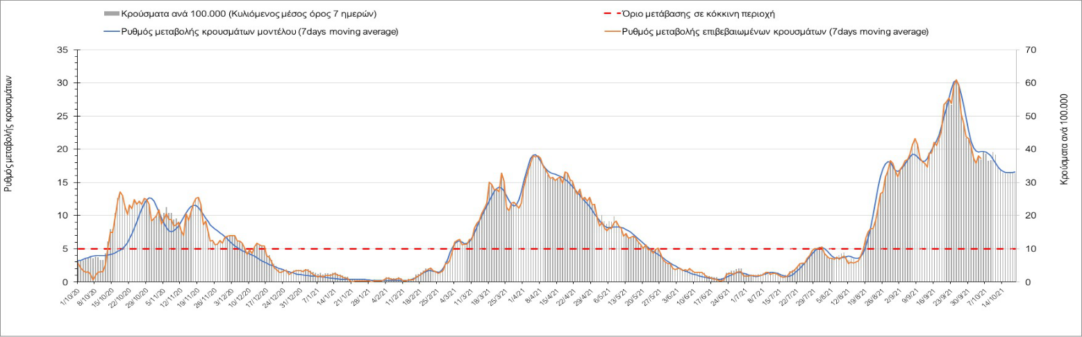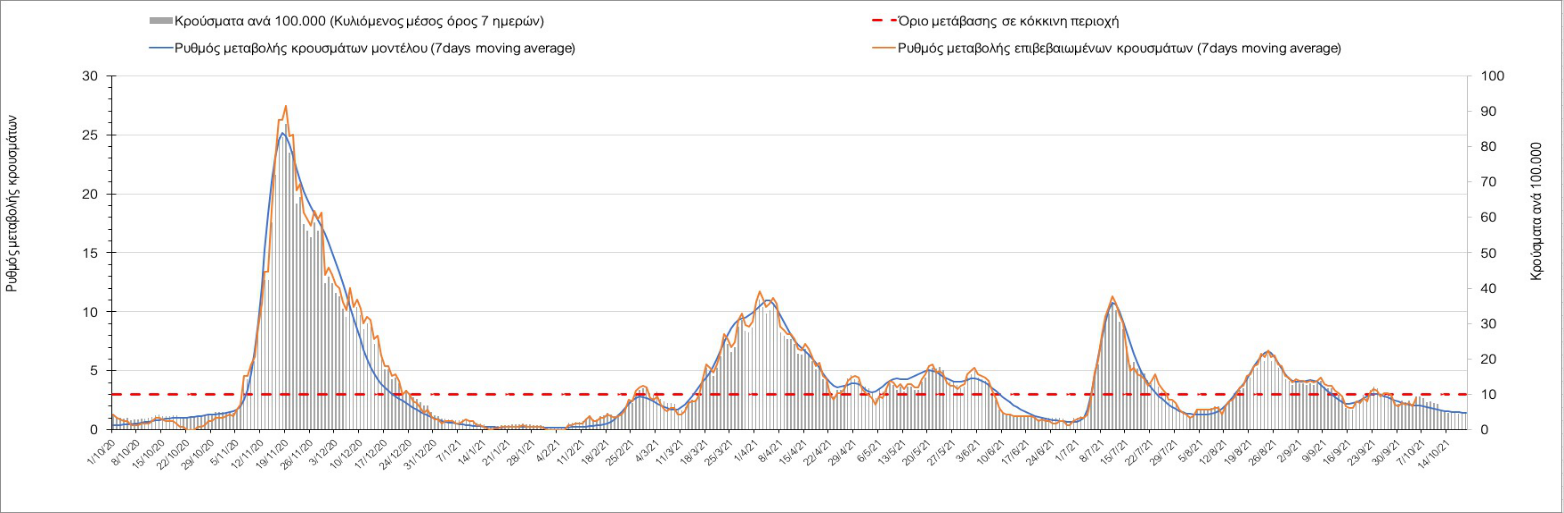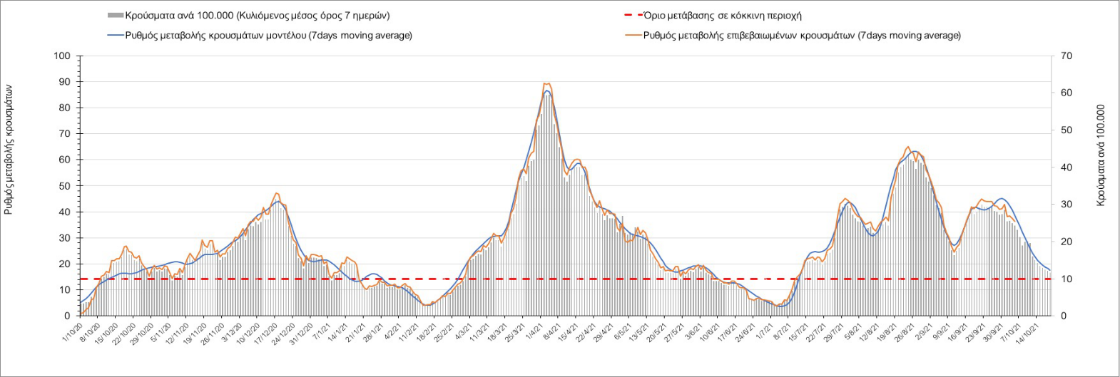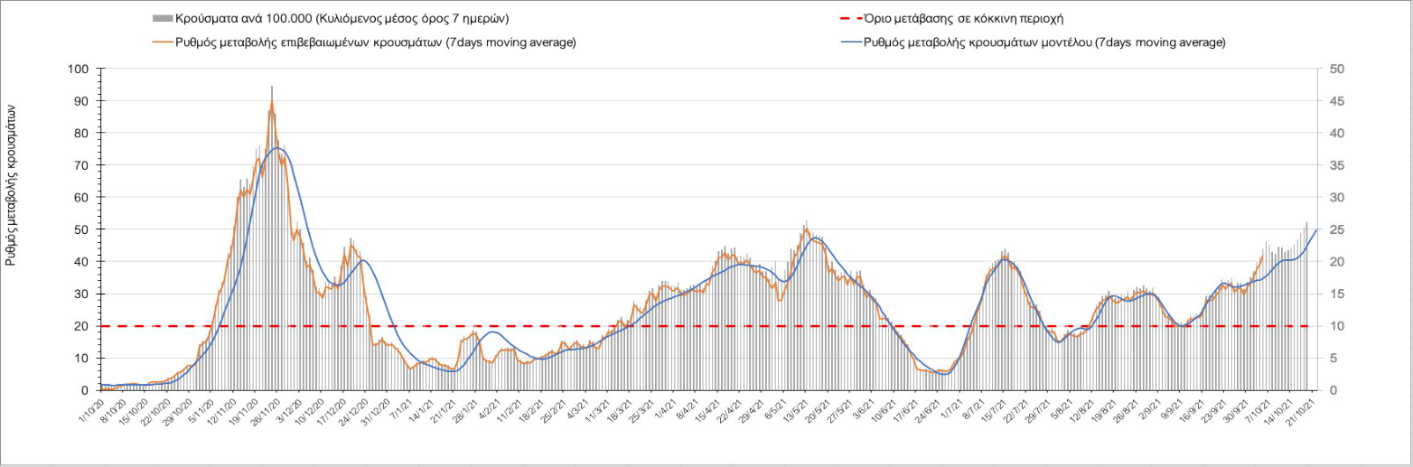 Η πορεία της μέσης εβδομαδιαίας τιμής των κρουσμάτων, καθώς και του κυλιόμενου μέσου όρου 7 ημερών του αριθμού των κρουσμάτων ανά 100.000 πληθυσμού, όπως έχουν καταγραφεί από τον ΕΟΔΥ και η αναμενόμενη πορεία τους όπως προδιαγράφεται από την υπολογιστική πλατφόρμα CORE για την Ελληνική επικράτεια μέχρι τις 20 Οκτωβρίου, αποτυπώνονται στο Σχήμα 4.
