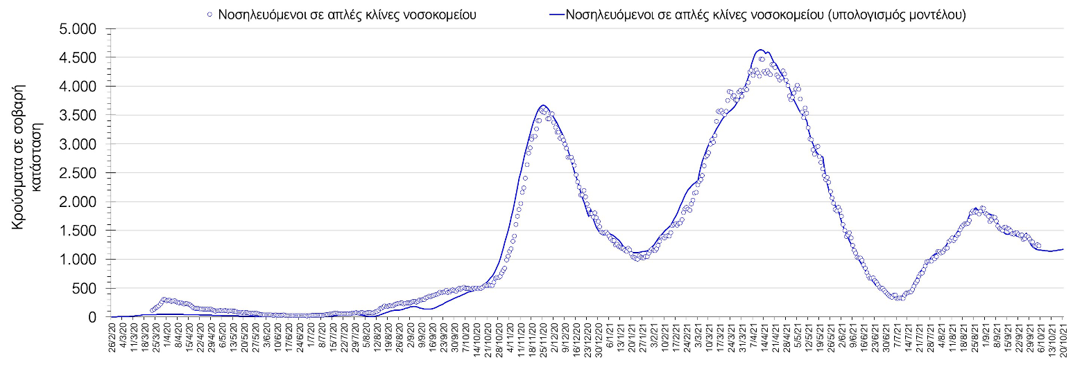 Όσον αφορά στους ασθενείς σε κρίσιμη κατάσταση (διασωληνωμένοι σε ΜΕΘ), ο αριθμός είναι μειωμένος σε σχέση με προχθές (334 από 342). Η καμπύλη εξέλιξης του αριθμού των ασθενών που νοσηλεύονται σε κλίνες ΜΕΘ με βάση τις προσομοιώσεις της πλατφόρμας CORE, όπως αυτή παρουσιάζεται στο Σχήμα 1, των ασθενών που νοσηλεύονται σε απλές κλίνες στο Σχήμα 2 (όπου διαφαίνεται πλέον η αναμενόμενη αύξηση στις νοσηλείες), ενώ μια εκτίμηση για την πορεία των θανάτων ανά ημέρα παρουσιάζεται στο Σχήμα 3.