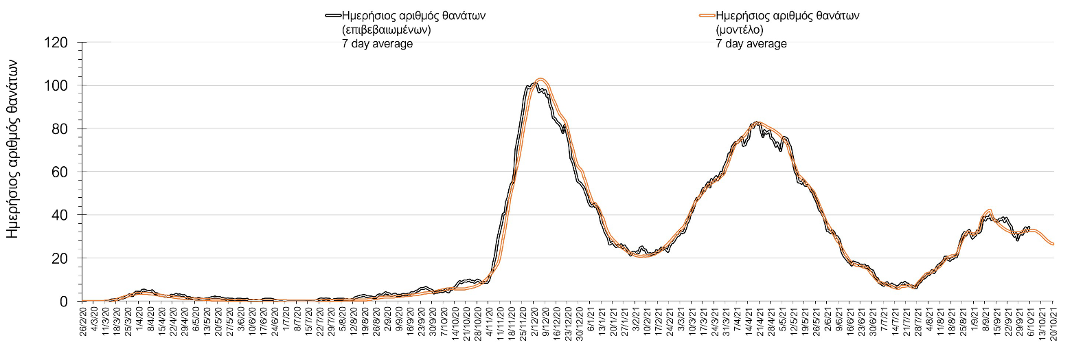 Σχήμα 3. Αριθμός θανάτων (κυλιόμενος μέσος όρος 7 ημερών) σύμφωνα με τα στοιχεία του ΕΟΔΥ και τις προβλέψεις της υπολογιστικής πλατφόρμας CORE.