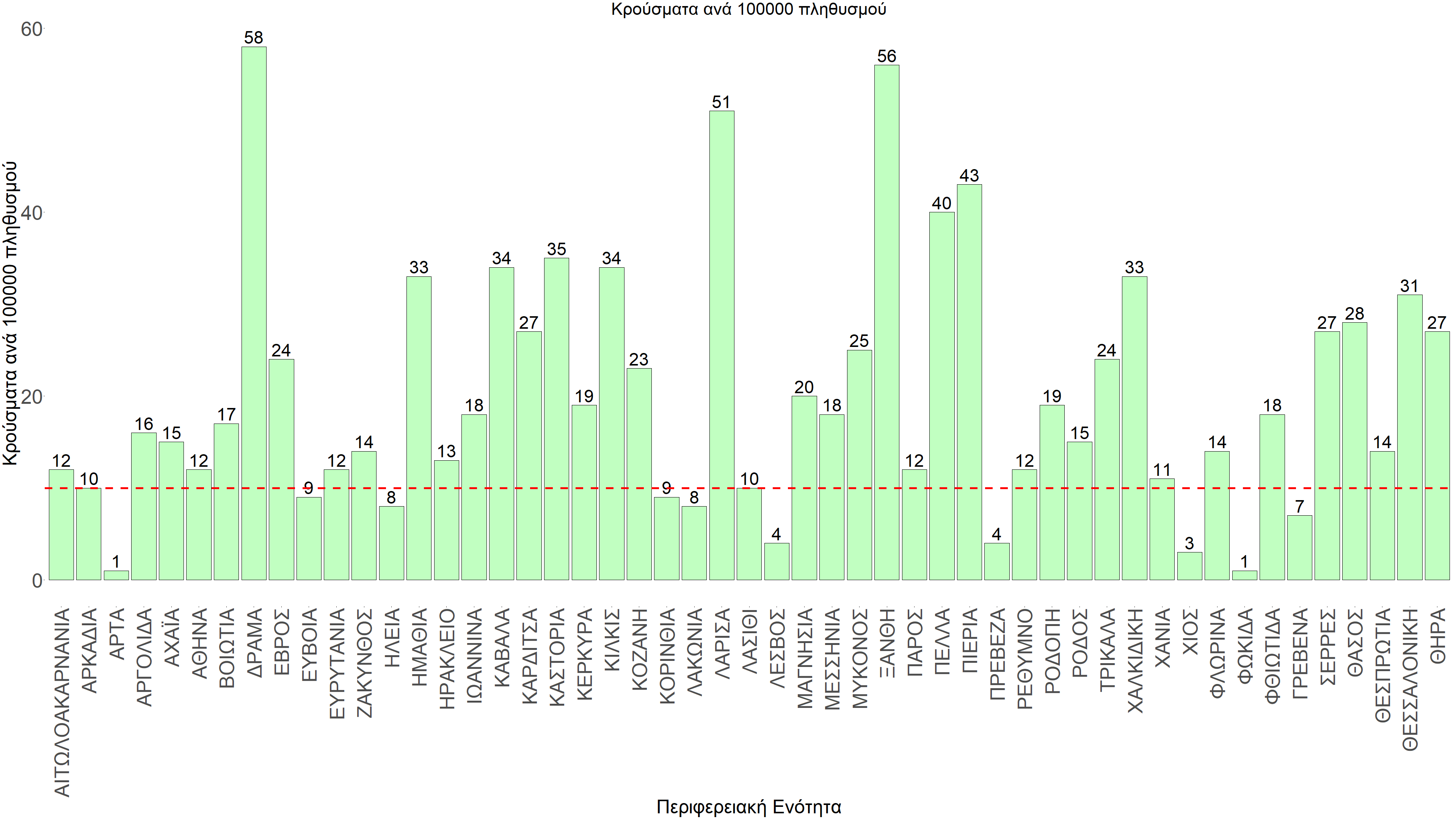 Σχήμα 59. Συγκεντρωτική εικόνα των νέων κρουσμάτων ανά 100.000 κατοίκους (κυλιόμενος μέσος όρος 7 ημερών) των επιμέρους περιοχών